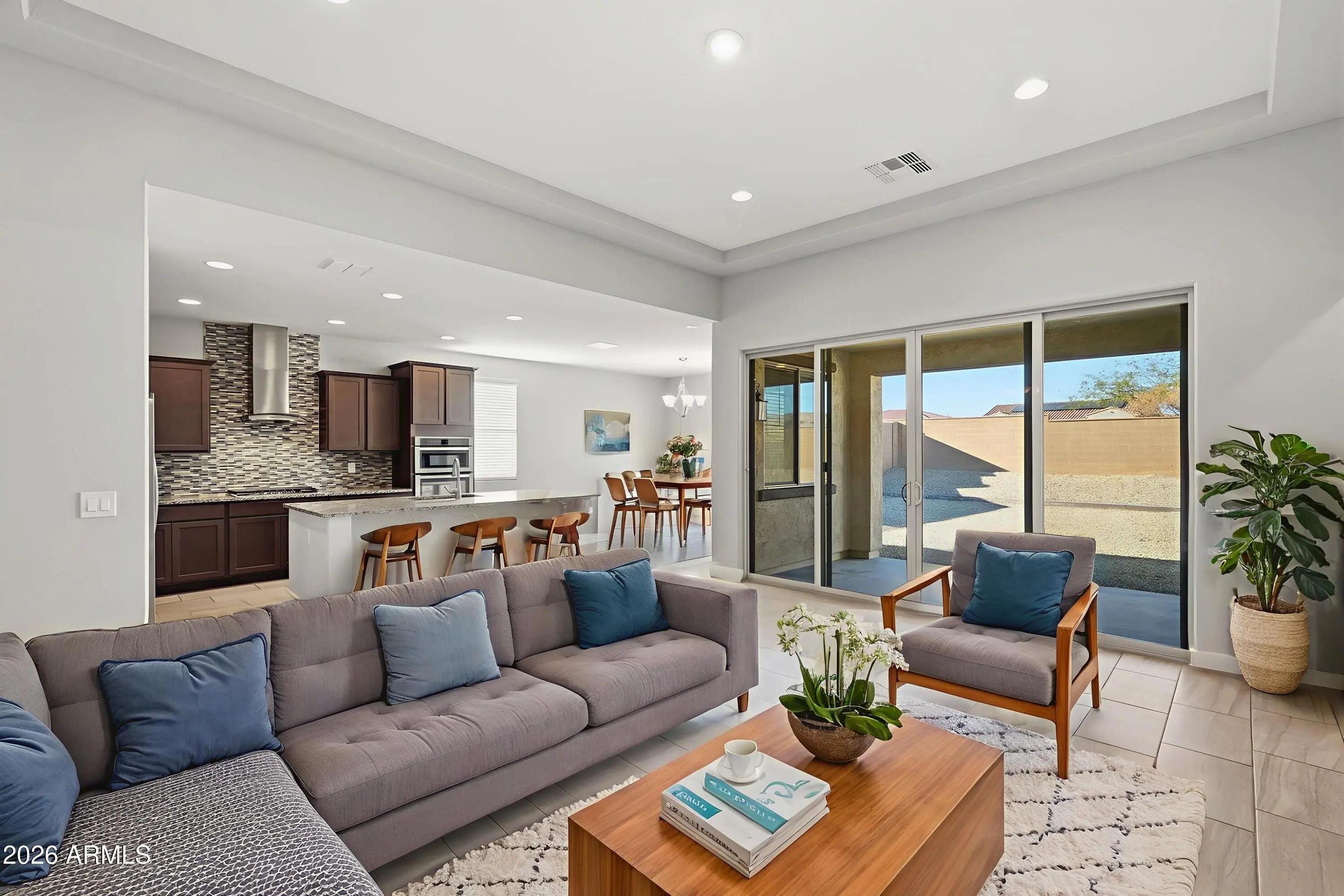 Beautiful single-story home in Estrella Mountain offering 3 bedrooms, 2 bathrooms, and a 2-car garage, designed for easy, comfortable living. The open floor plan features tray ceilings in the living room and primary suite, creating a bright, airy feel throughout. The gourmet kitchen is ideal for both everyday living and entertaining, with a center island, decorative backsplash, stainless steel appliances, pantry, opening to a sunny dining area. The primary suite serves as a private retreat with dual vanities and a gorgeous tiled walk-in shower. Step outside to enjoy the covered back porch and large backyard, perfect for relaxing evenings or weekend gatherings, all within the sought-after Estrella Mountain community, known for its scenic trails, parks, and lifestyle amenities.