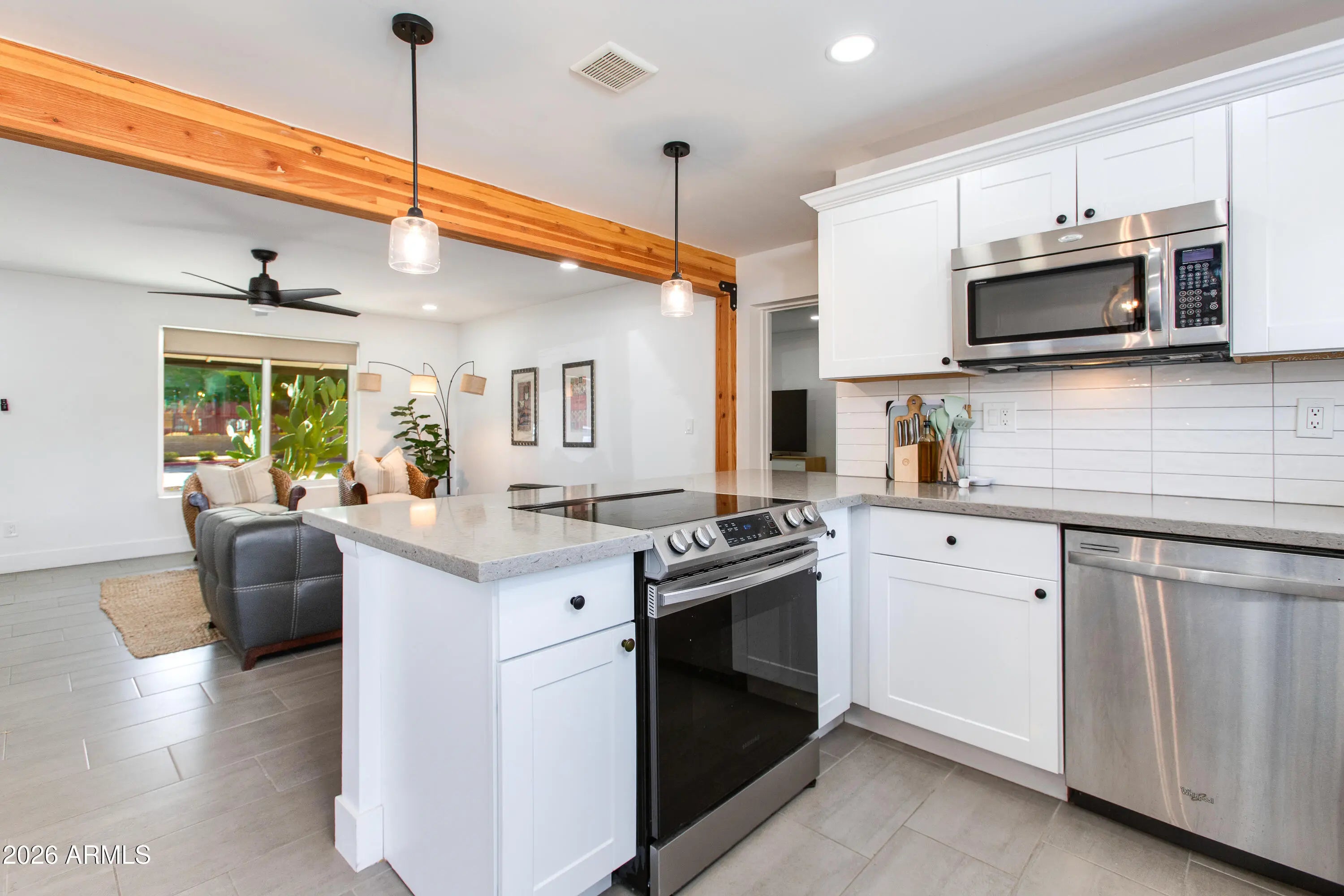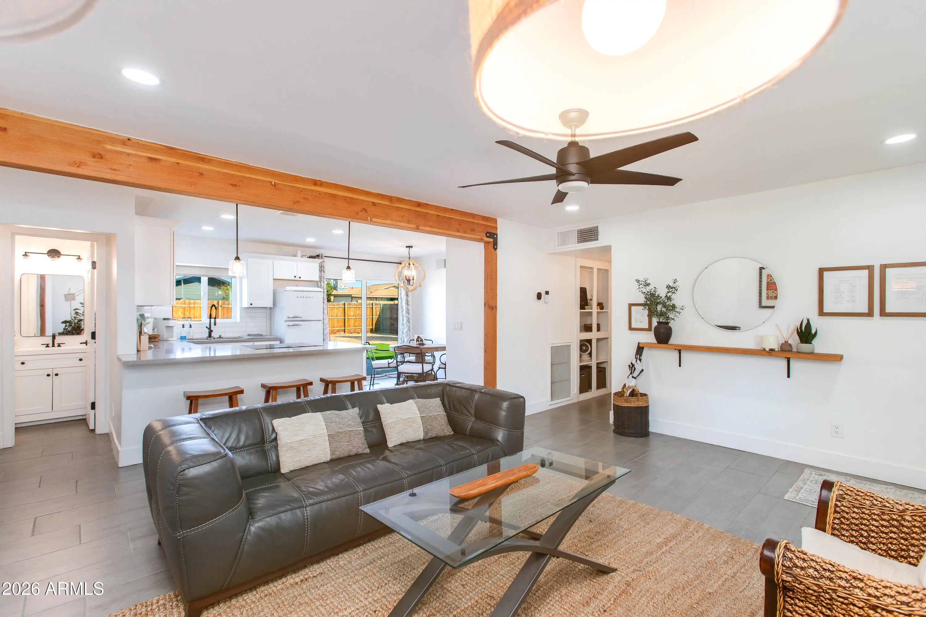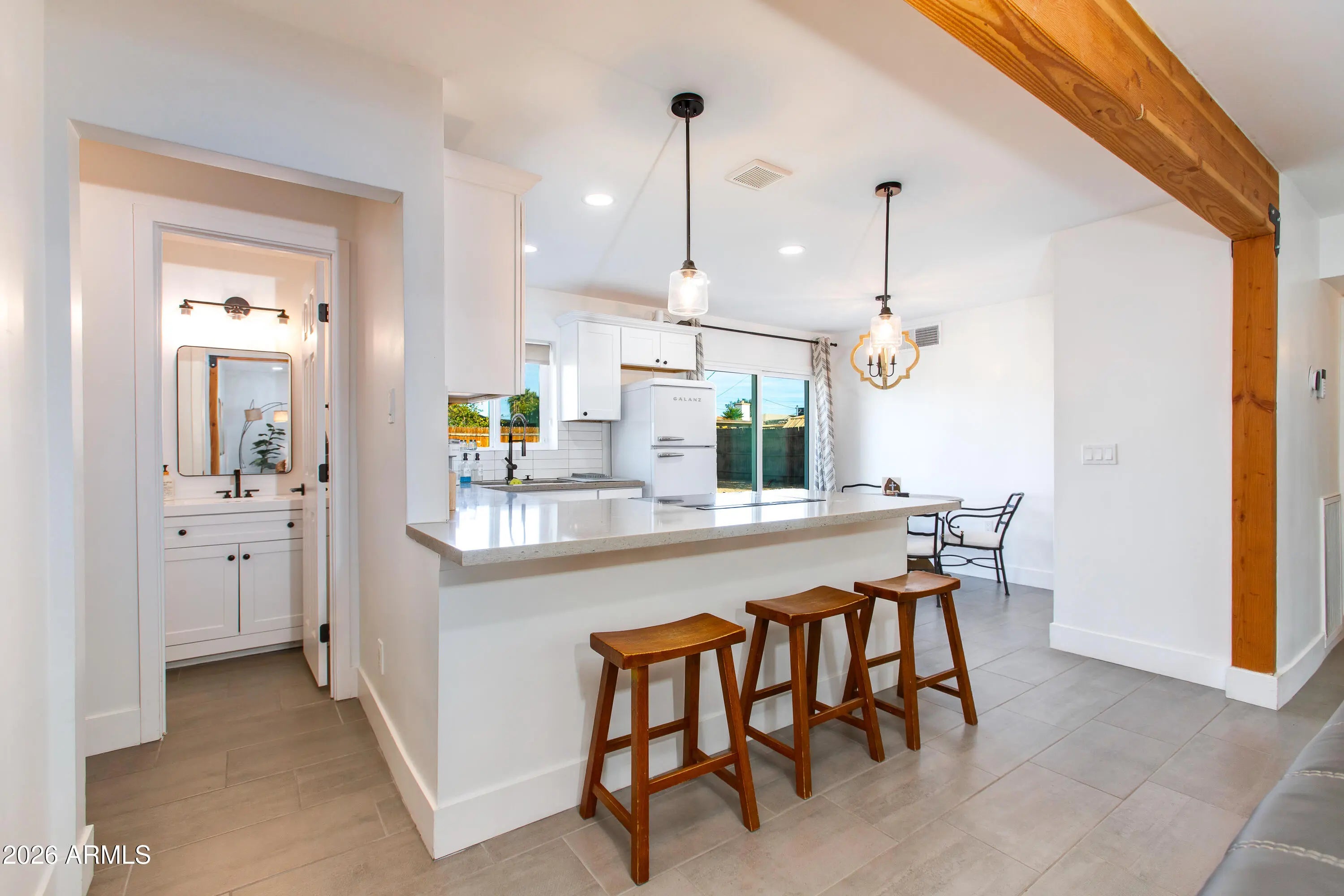 This home is conveniently located directly across the street from the prestigious Grand Canyon University. It is fully remodeled, has 4 bedrooms, 2.5 bathrooms and completely finished in 2022. This beautiful home features gorgeous ceramic tile throughout the main living areas and plush carpet in the bedrooms. The upgraded kitchen showcases white shaker cabinets, stainless steel appliances, subway tile backsplash, quartz countertops, and stylish light fixtures. The bathrooms have been fully upgraded with hardware and tiled showers. The large backyard is perfect for entertaining and has an RV gate! This home is fantastic as a primary residence or rental home.
