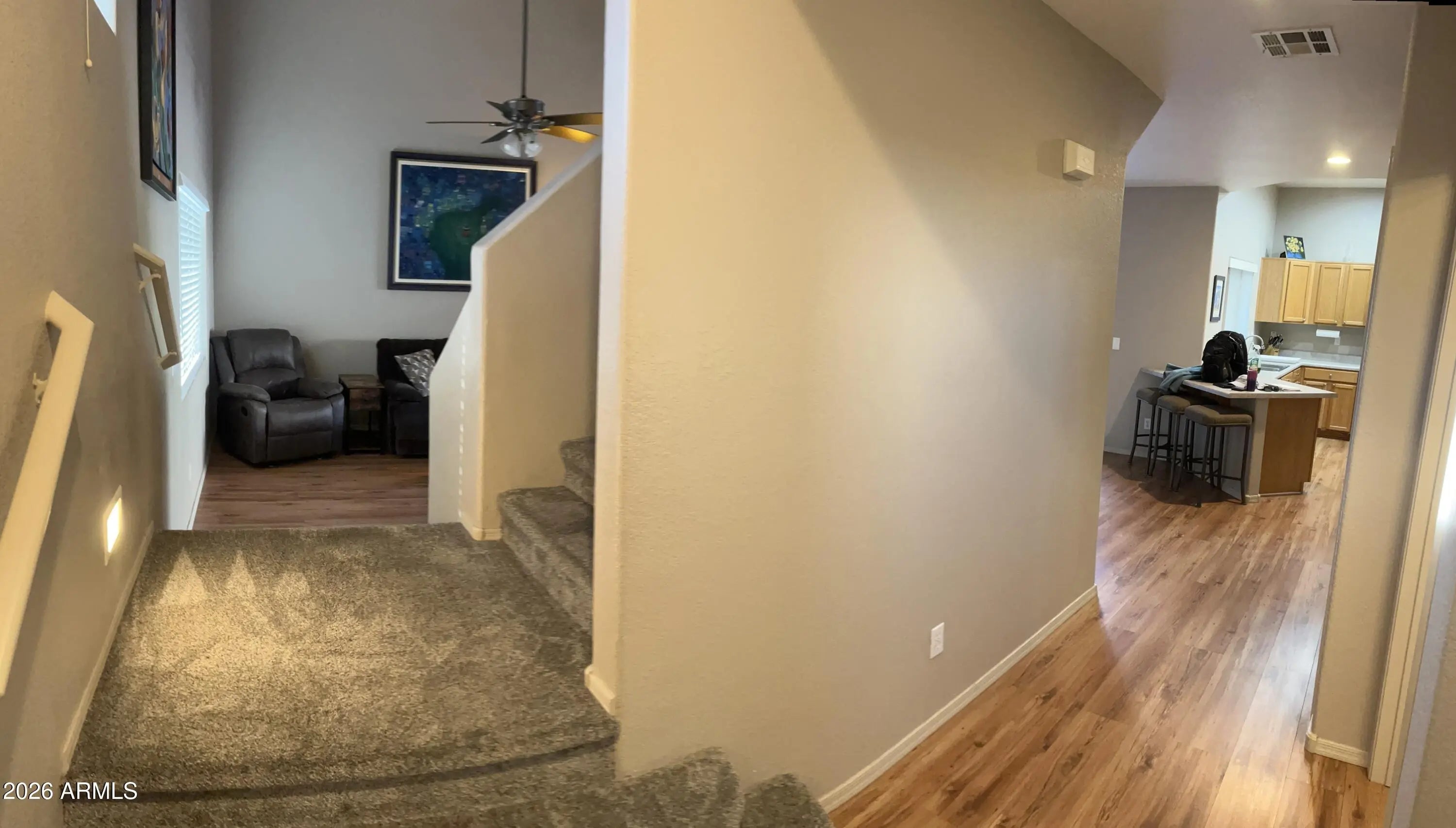 Beautifully maintained 3-bedroom, 2.5-bath two-story home ideally located in a quiet, gated community adjacent to the Peoria Sports Complex. This inviting residence offers an open great-room floor plan highlighted by soaring vaulted ceilings that create a bright, spacious feel from the moment you enter. The thoughtfully designed kitchen features ample cabinetry, a breakfast bar, dining area, and smart stainless appliances including refrigerator, stove, and microwave, making it both functional and modern. Neutral paint tones, plush carpet upstairs, and wood-style tile flooring throughout the main living areas provide a clean, timeless aesthetic. Upstairs, generously sized bedrooms include ceiling fans and large closets. The primary suite offers a walk-in closet and a well-appointed bath with dual sinks and a private toilet room. Enjoy Arizona outdoor living in the private, low-maintenance backyard, complete with a covered patio, mature shade tree, and a new automatic drop-down patio shade blind - perfect for year-round comfort. Additional highlights include an updated smart furnace, inside laundry with washer and dryer, a 2-car garage with opener, and access to community amenities such as a pool, spa, and scenic biking/walking paths. Conveniently located near Paseo Verde Elementary, Centennial High School, shopping, dining, and major freeways. This home offers the perfect blend of comfort, technology, and location ideal for full-time living or a seasonal Arizona retreat.