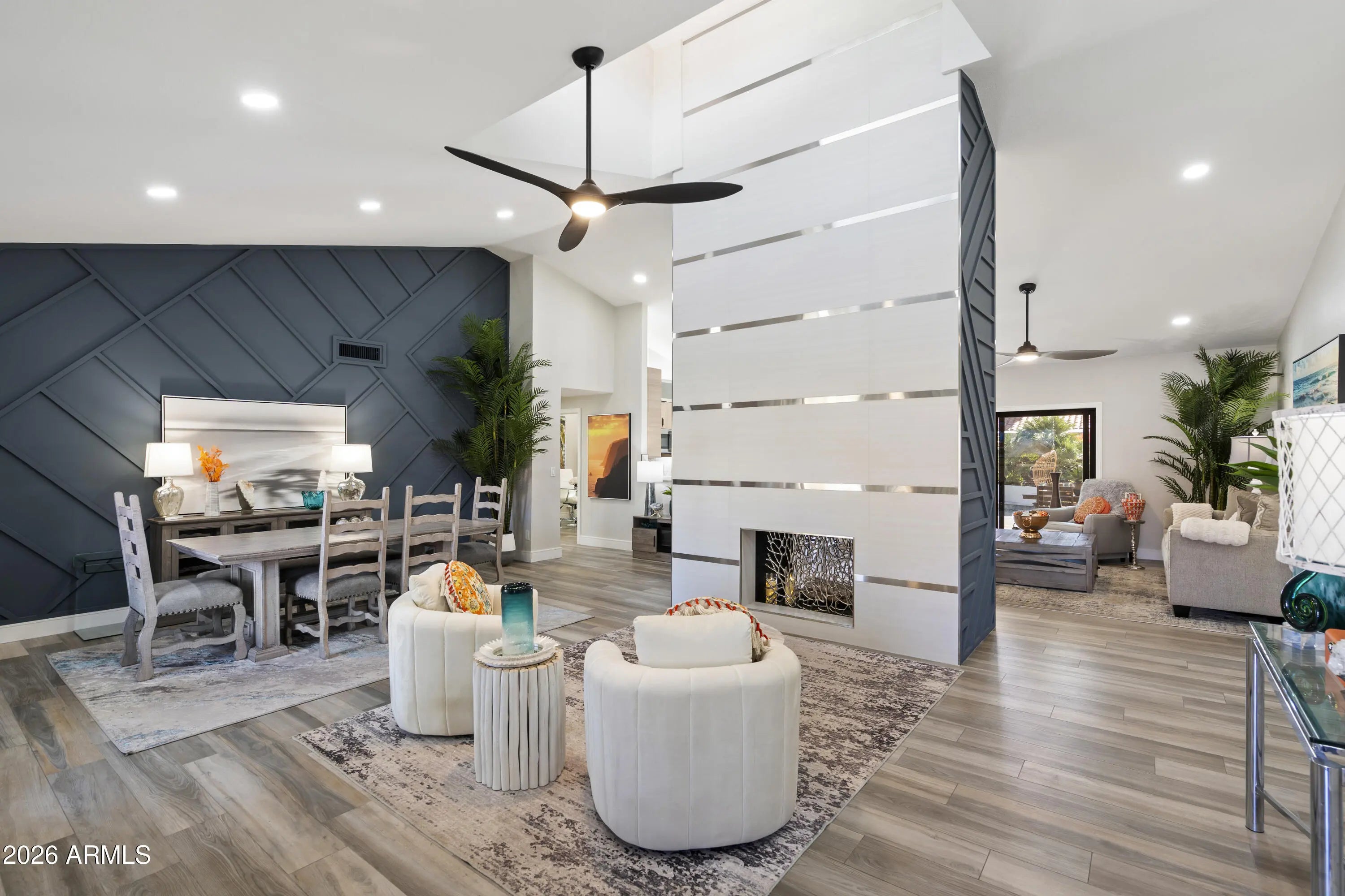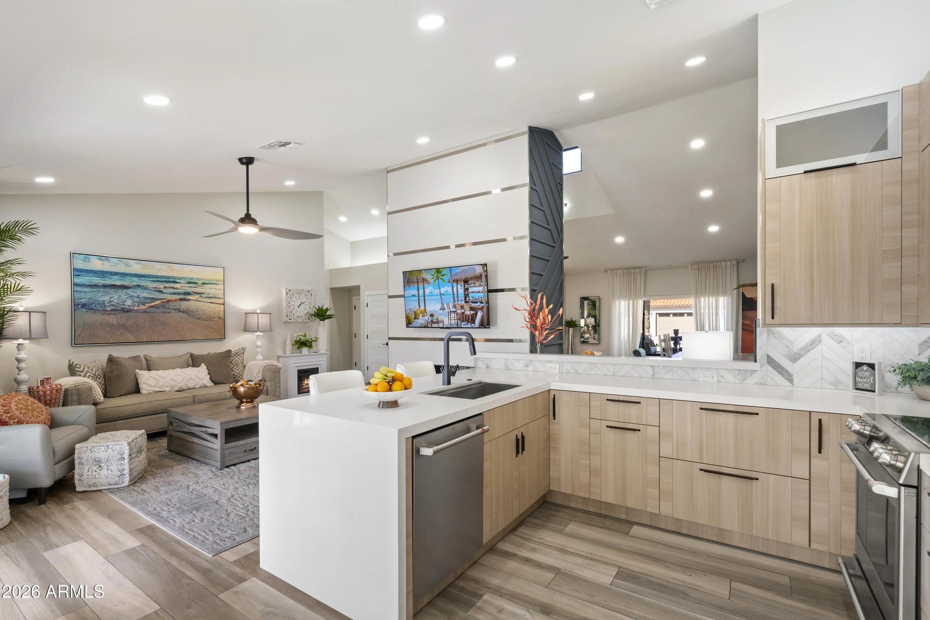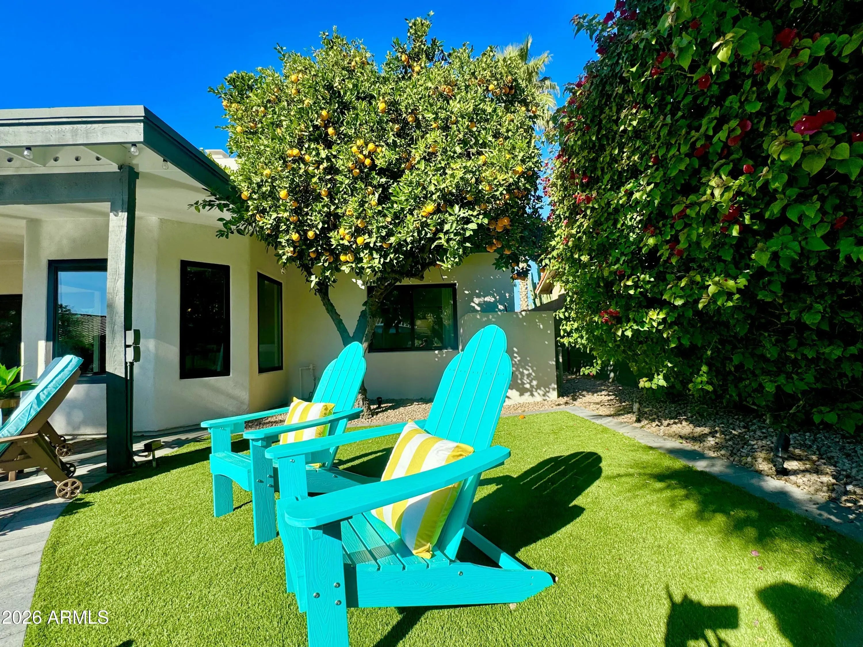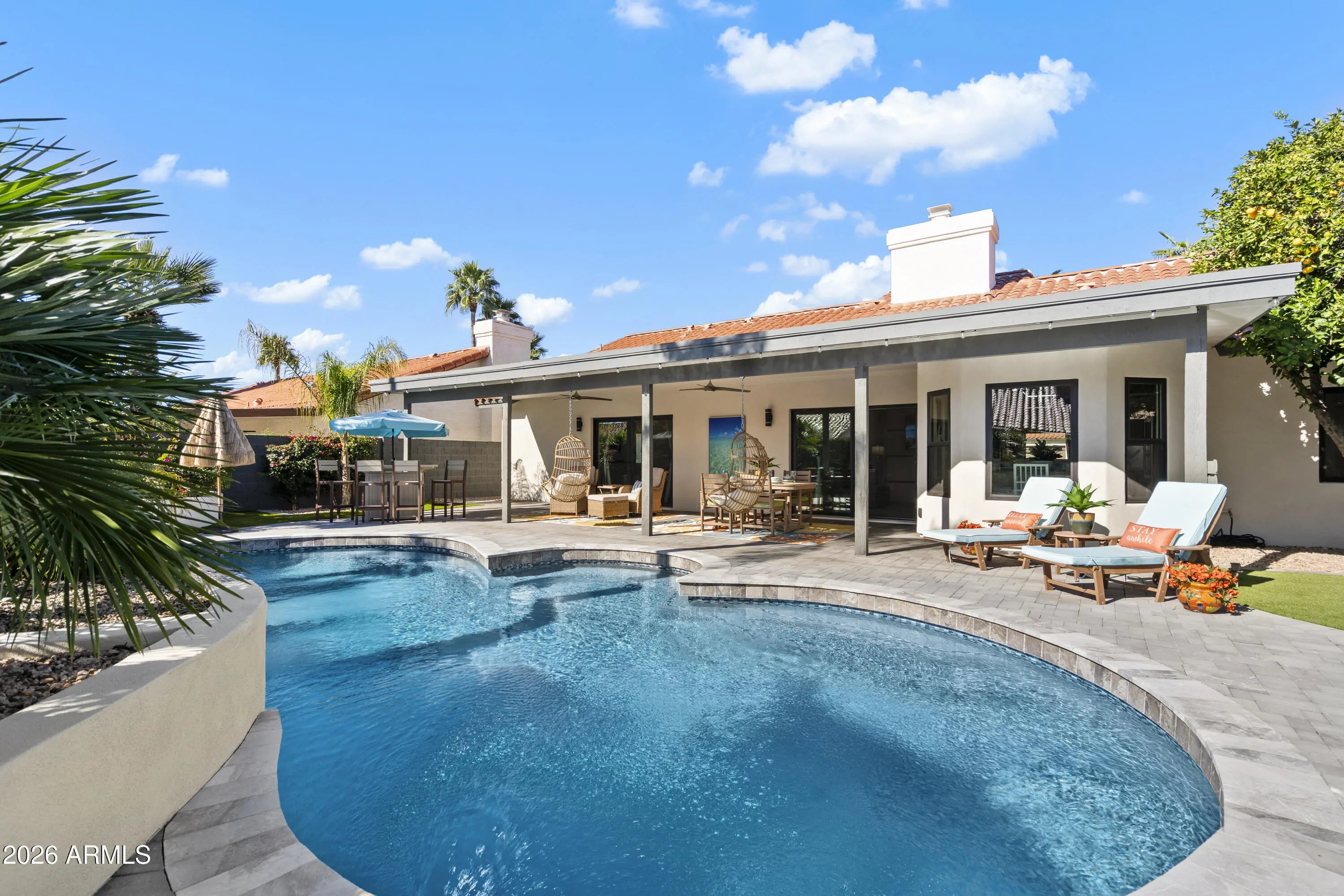 Completely reimagined dream home in highly sought after Scottsdale Ranch! This light and bright residence has been thoughtfully redesigned from top to bottom with stunning, high end finishes throughout. The open concept living area showcases custom design elements including a dramatic floor to ceiling fireplace, eye catching 3D accent wall, and curated designer touches at every turn. Enjoy seamless indoor-outdoor living in the lush backyard oasis featuring a pavered patio, artificial turf, mature trees, and vibrant flowering plants; your own private tropical retreat. Situated on a quiet interior lot with no busy roads, this single-level home offers NO STEPS and effortless living.... The spacious primary suite includes a luxurious ensuite with designer tile, walk-in shower, walk-in closet, and direct access to the backyard paradise. Two additional bedrooms complete this 3-bedroom home. Extensive improvements completed in 2024see attached list. This home truly feels brand new and is not to be missed!