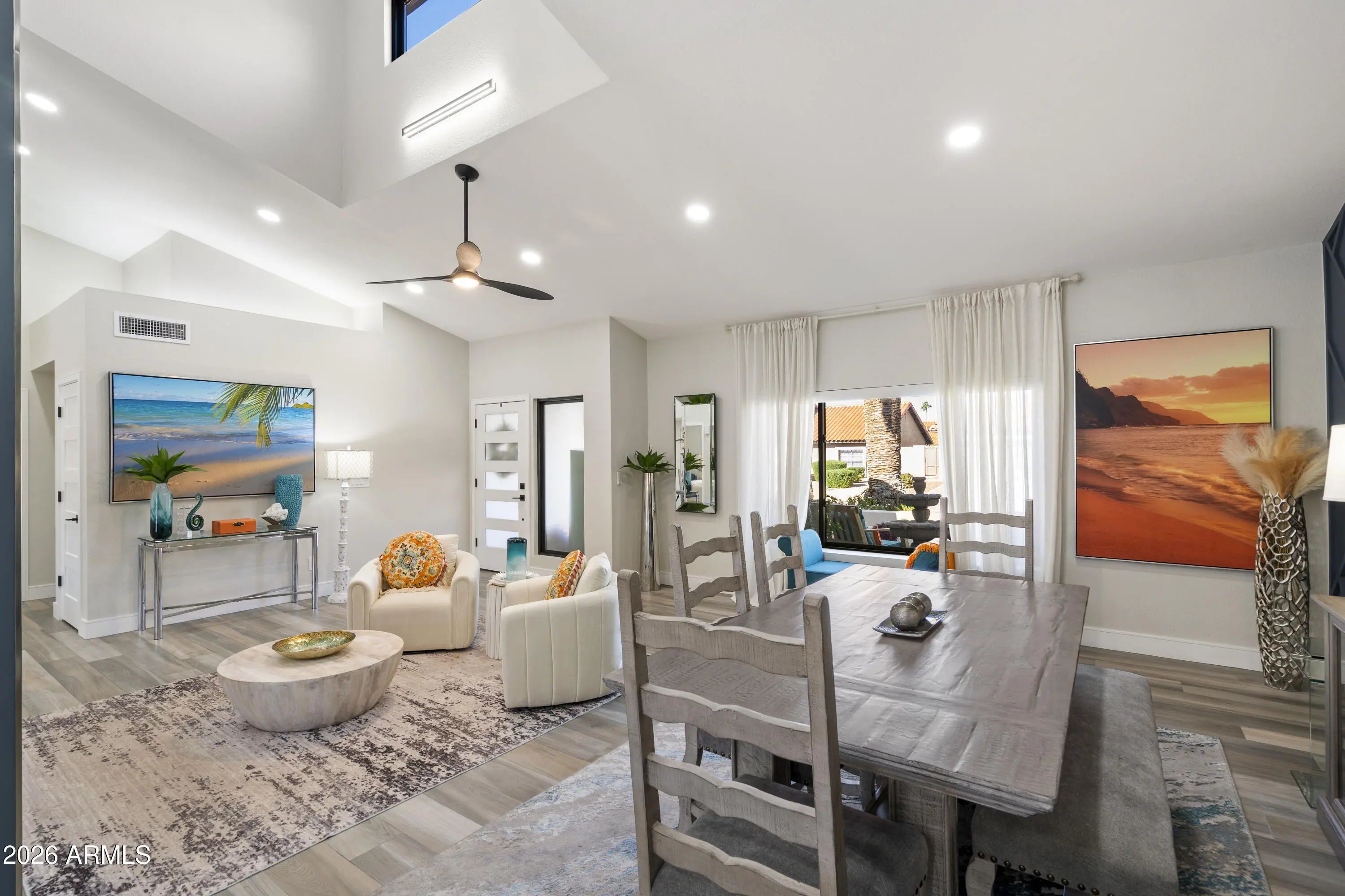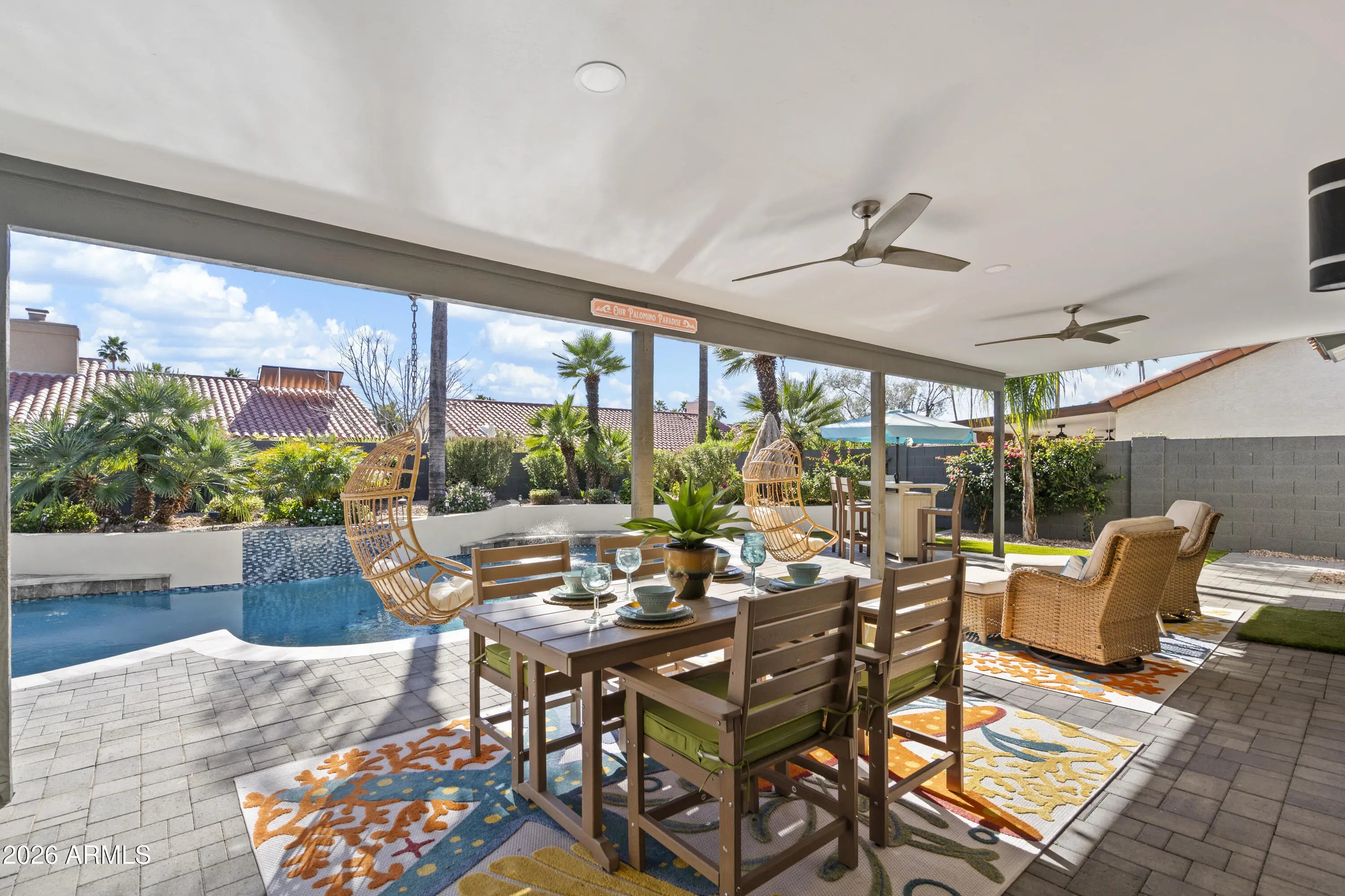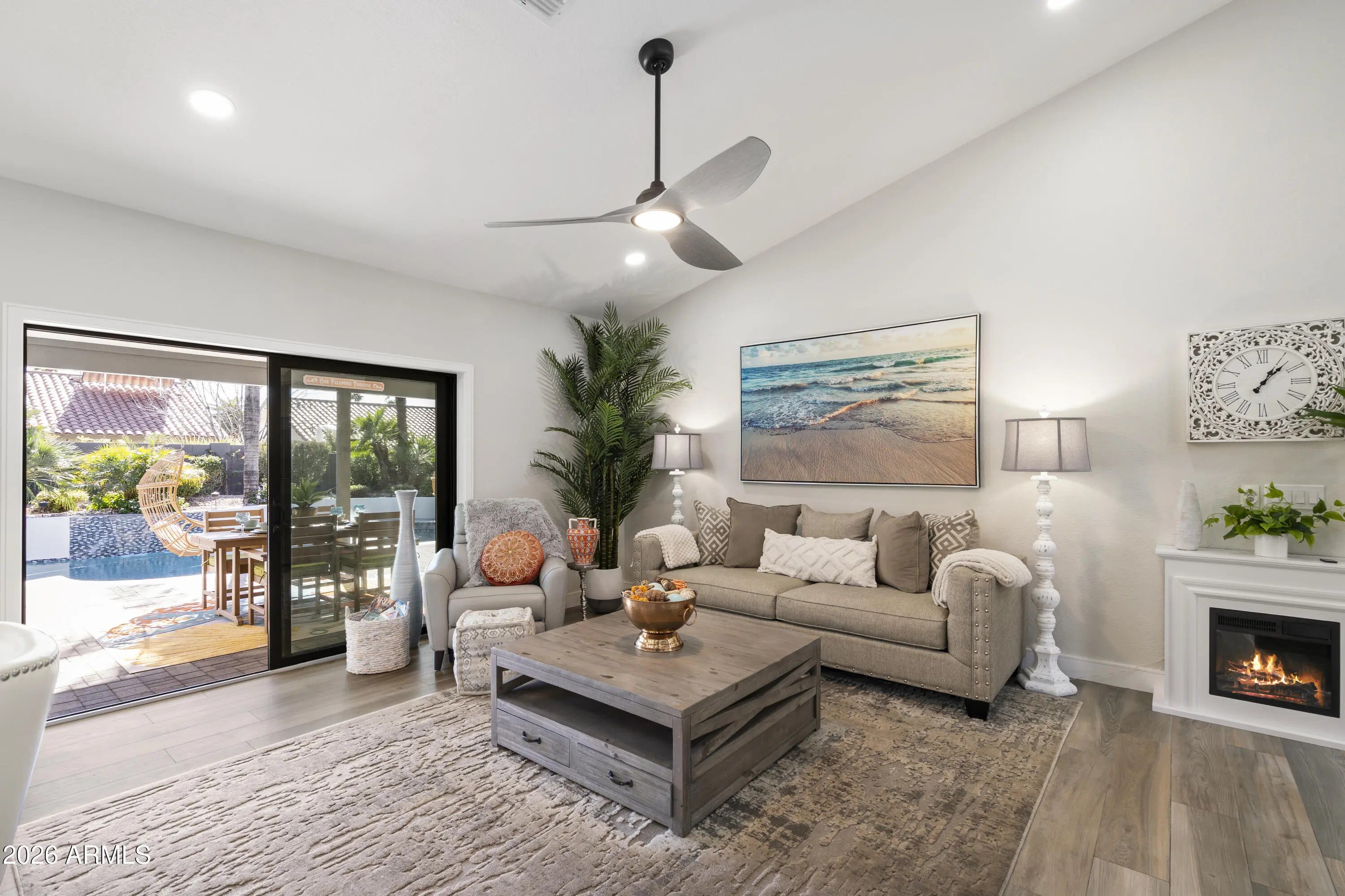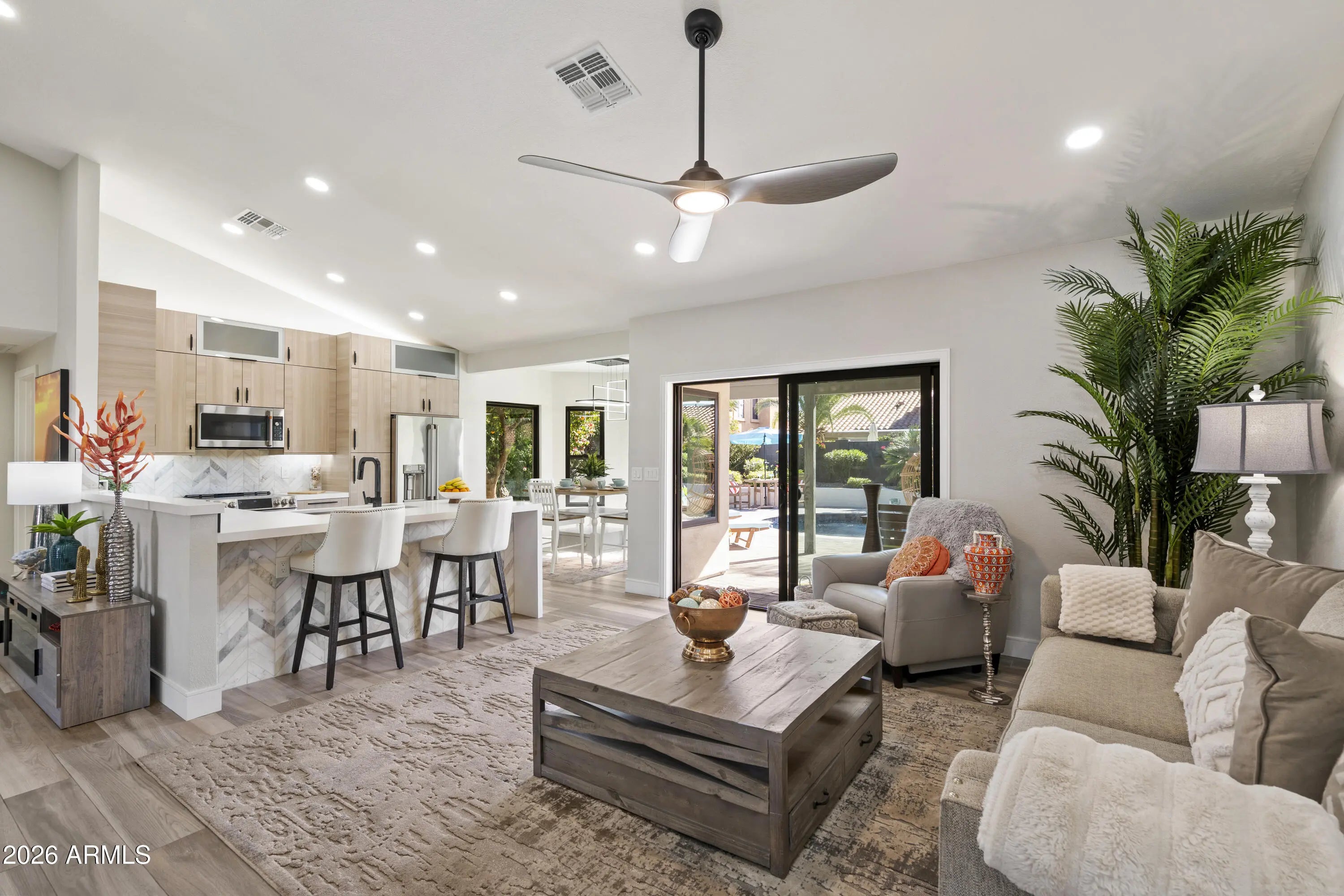 Completely reimagined dream home in highly sought after Scottsdale Ranch! This light and bright residence has been thoughtfully redesigned from top to bottom with stunning, high end finishes throughout. The open concept living area showcases custom design elements including a dramatic floor to ceiling fireplace, eye catching 3D accent wall, and curated designer touches at every turn. Enjoy seamless indoor-outdoor living in the lush backyard oasis featuring a pavered patio, artificial turf, mature trees, and vibrant flowering plants; your own private tropical retreat. Situated on a quiet interior lot with no busy roads, this single-level home offers NO STEPS and effortless living.... The spacious primary suite includes a luxurious ensuite with designer tile, walk-in shower, walk-in closet, and direct access to the backyard paradise. Two additional bedrooms complete this 3-bedroom home. Extensive improvements completed in 2024see attached list. This home truly feels brand new and is not to be missed!