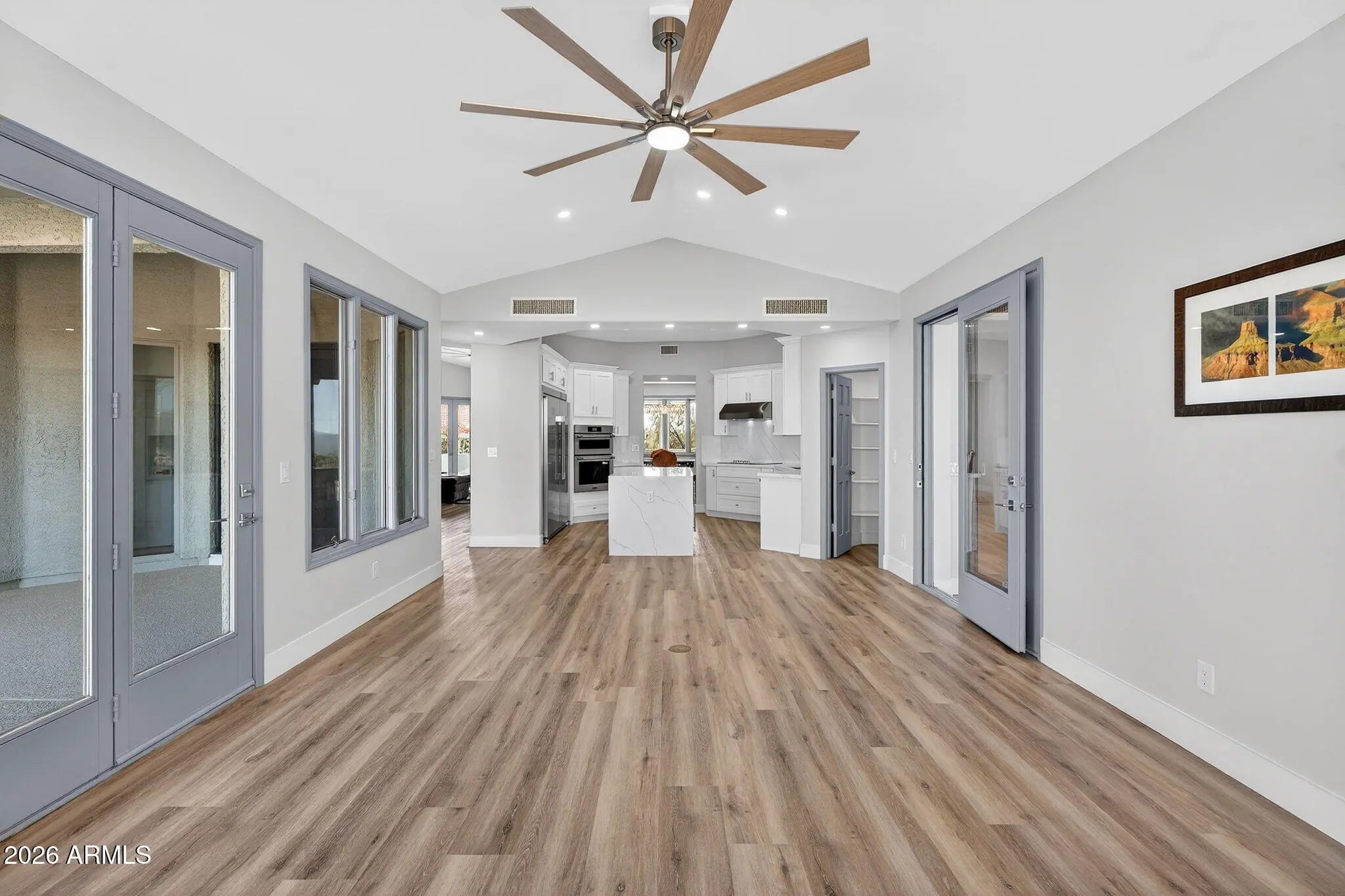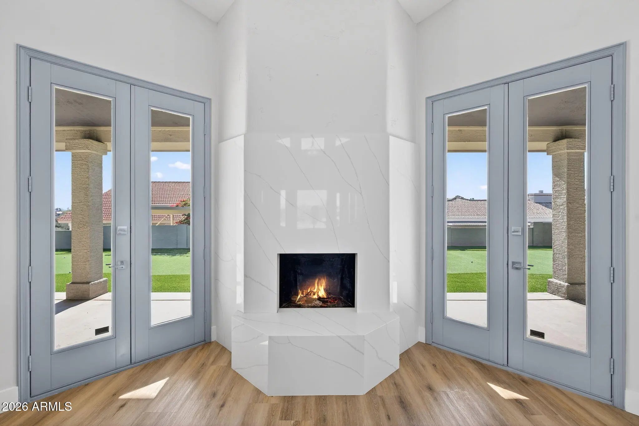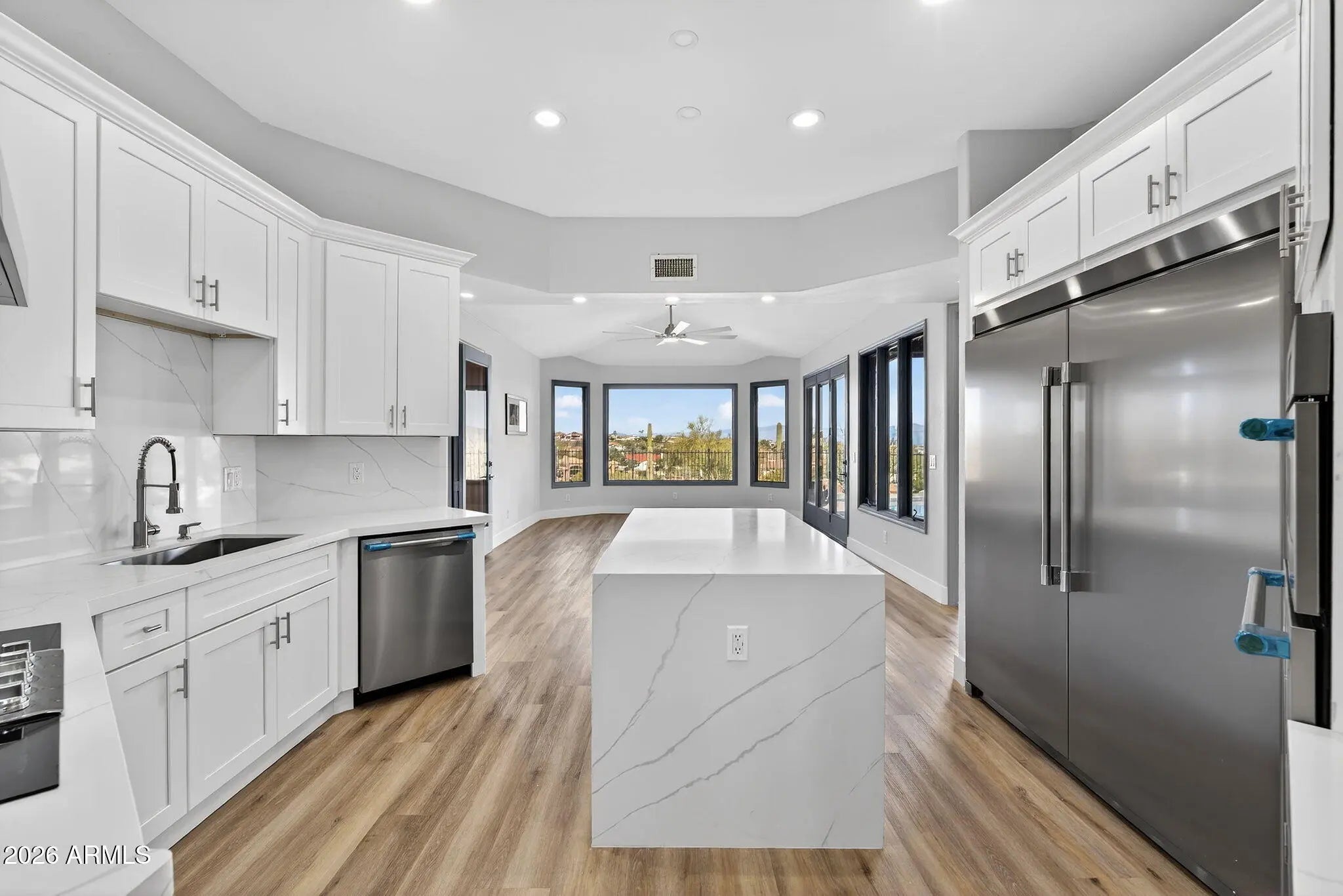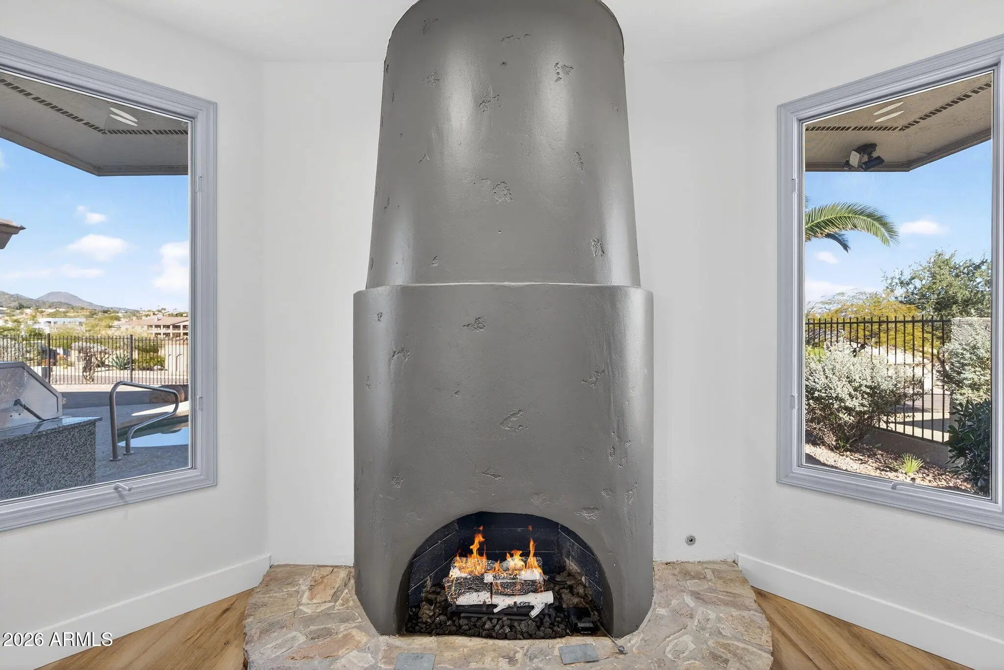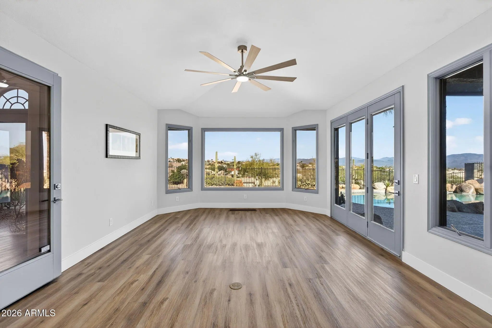 Completely renovated from top to bottom, this exceptional Fountain Hills estate offers all-new finishes and true single-level living with no interior steps throughout. Upon stepping inside a dramatic 6x8 ft pivot front door,, you are welcomed by an impressive foyer featuring soaring ceilings and an elegant chandelier, setting the tone for the refined design found throughout the home. The home features an abundance of windows, adding exceptional brightness and an airy, open feel throughout. Spanning 3,888 sqft (including a 350 sqft addition that could be used as an additional bedroom, library, home gym, or flex space), this 3-bedroom, 3-bath residence is thoughtfully designed to maximize comfort, functionality, and breathtaking views. Every room offers a walk-in closet, while the primary suite is enhanced with his-and-her walk-in closets and skylights in the master closets, bringing in even more natural light. Take in sweeping panoramas of Four Peaks, Fort McDowell, Red Mountain, and the iconic Fountain from multiple living spaces. The desirable floor plan features expansive living areas, formal dining, and a versatile bonus room framed by stunning mountain scenery. The kitchen is beautifully appointed with tasteful modern finishes like a new stainless steel professional grade appliances (67x78 refrigerator, combo microwave oven, wine cooler), a striking quartz island, and a spacious walk-in pantry, The primary suite is a private retreat, offering its own fireplace, separate sitting area, and a bathroom with dual vanities, soaking tub, and separate rain shower. Outdoor living shines with a resort-style pool with poolside bathroom, new pool deck (updated 2026), barbeque, and mini golf course. The pool is equipped with a variable-speed pump (added in 2026) and can be heated with the addition of a heating component for extended seasonal enjoyment. Additional upgrades include pre-plumbing for a water softener, an instant hot water circulation pump for added efficiency and convenience, and 72 inch ceiling fans in living and family room. Ample parking is provided with both attached and detached garages offering EV charger, 4 car garage and 6 slab parking. Both gargages are 18x8 and private gate surrounding the home. This move-in-ready home delivers unmatched views, thoughtful design, and effortless single-level living!