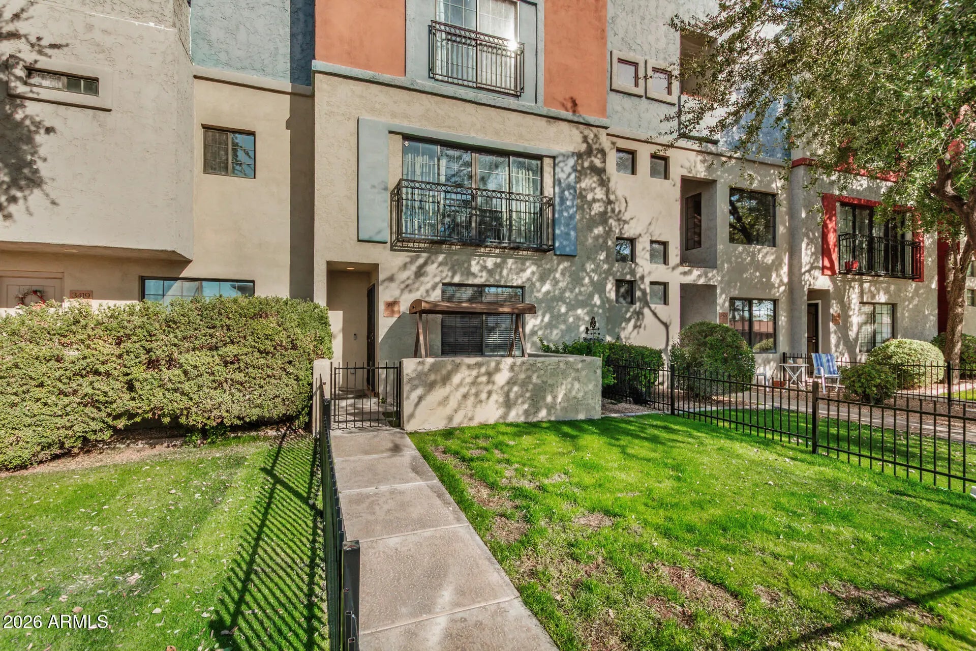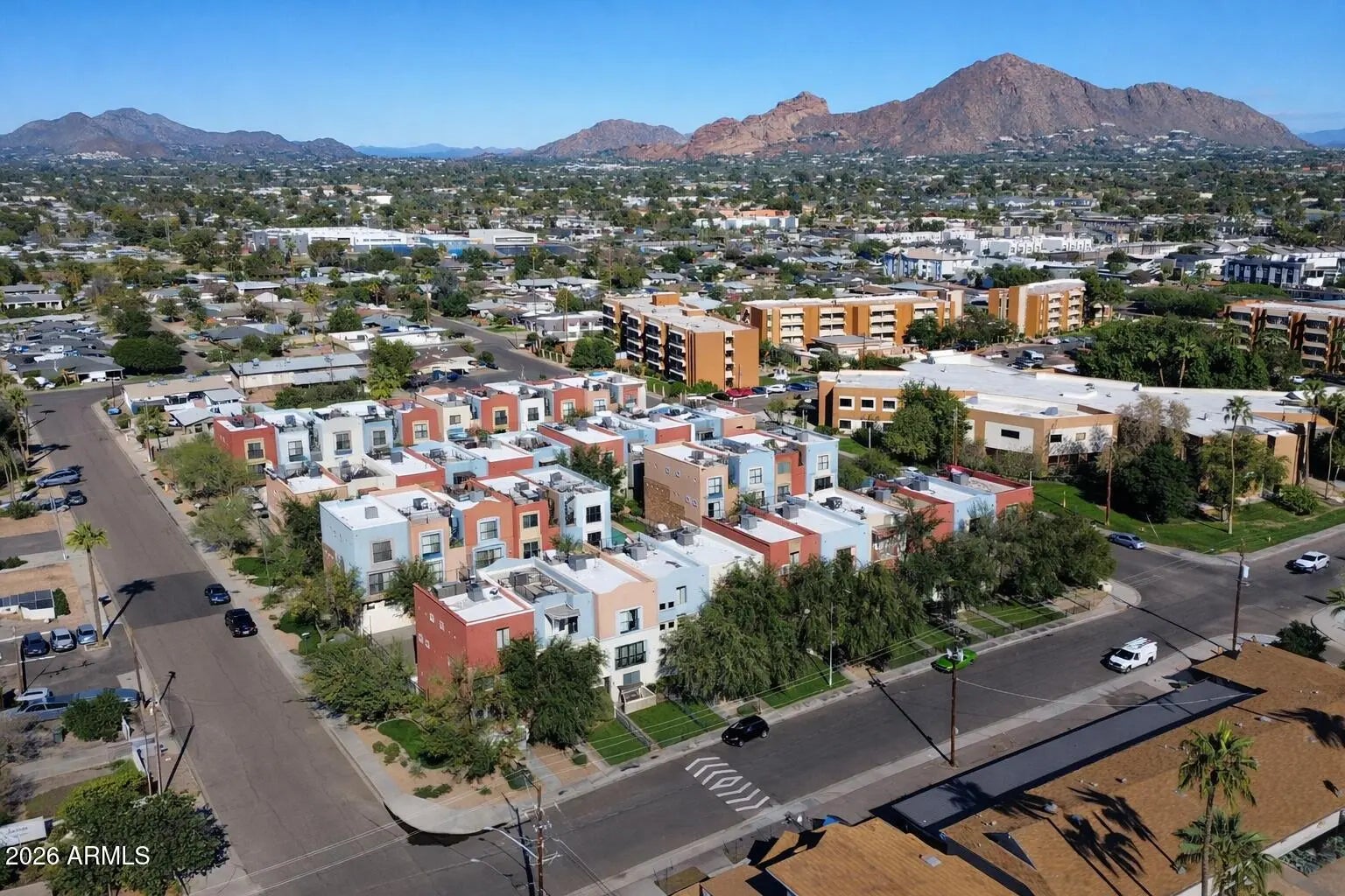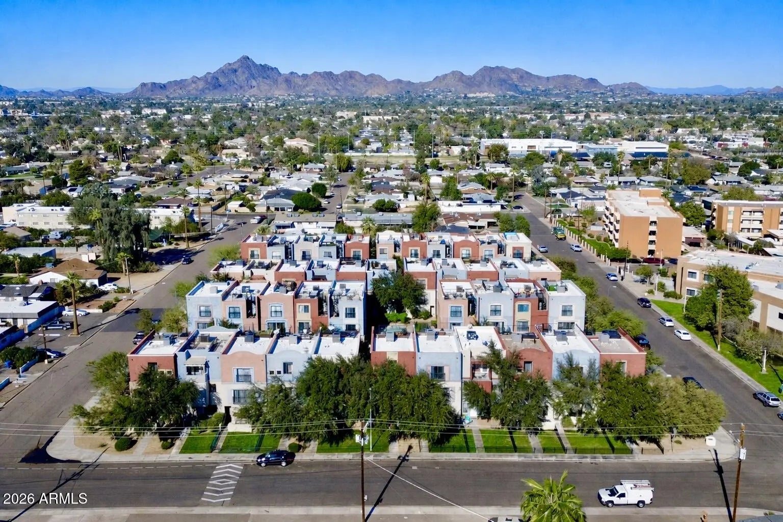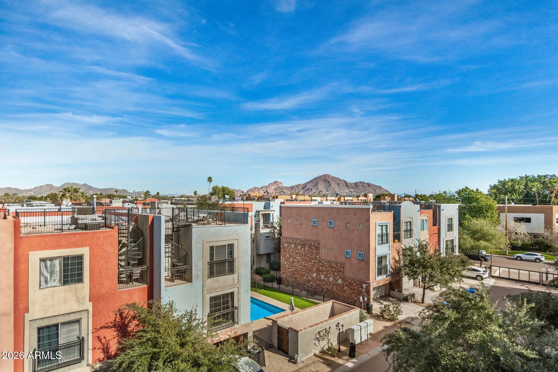 Stunning tri-level townhome in Arcadia-lite! Located in a sought-after community with a private drive, sparkling pool, lush landscape, and breathtaking mountain views from a private rooftop patio, this home blends style and function effortlessly. Enjoy charming renovations throughout, including an updated kitchen with stainless steel appliances, subway tile backsplash, island, and breakfast nook. All three bathrooms have been beautifully updated, and each bedroom offers its own private bath, perfect for guests or roommates. New AC adds comfort and peace of mind, fenced in front yard and 2 car garage! Enjoy unbeatable proximity to Arcadia and Biltmore's top restaurants, shopping, and nightlife, plus an under-10-minute commute to Phoenix Sky Harbor. A rare opportunity in a prime location.
