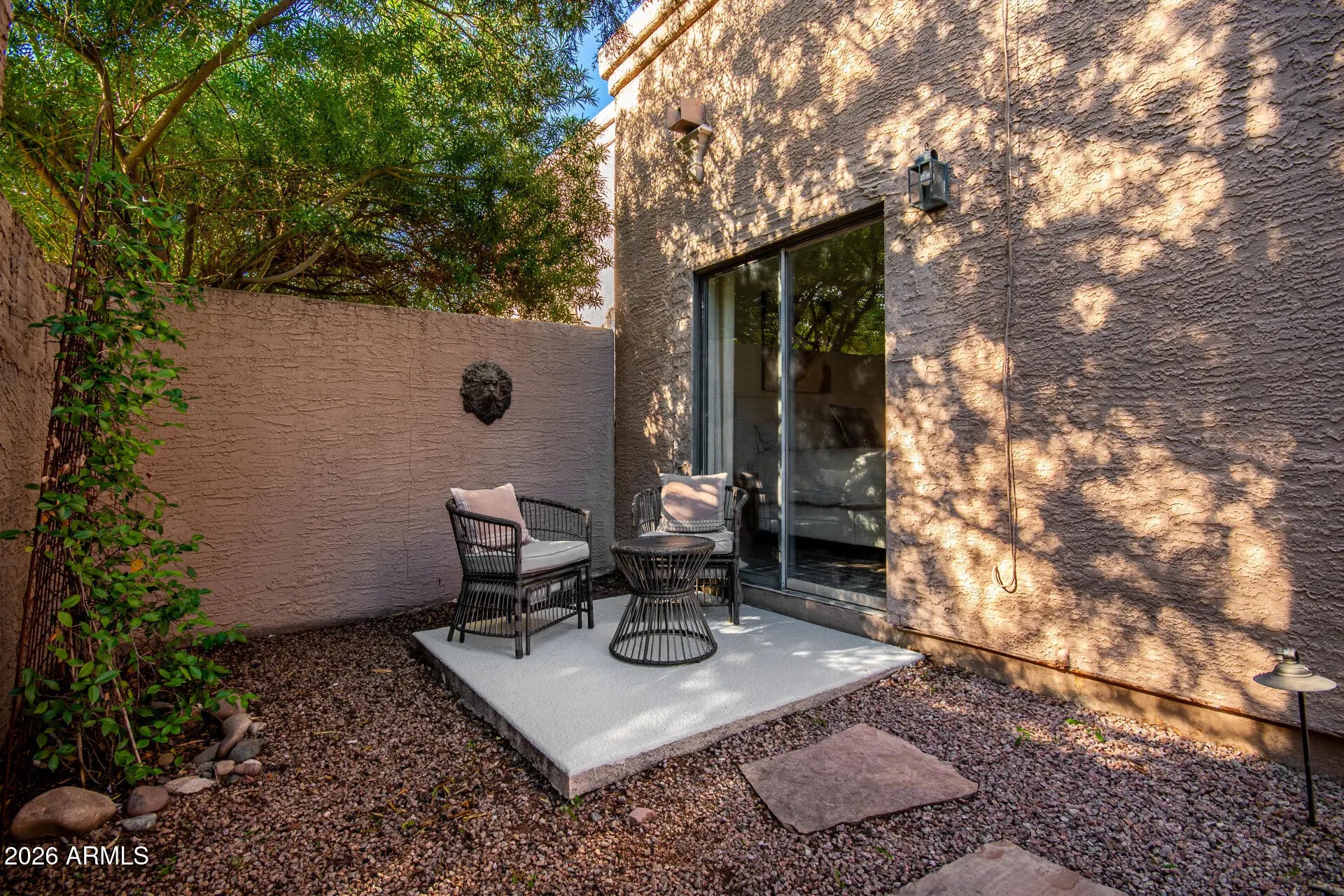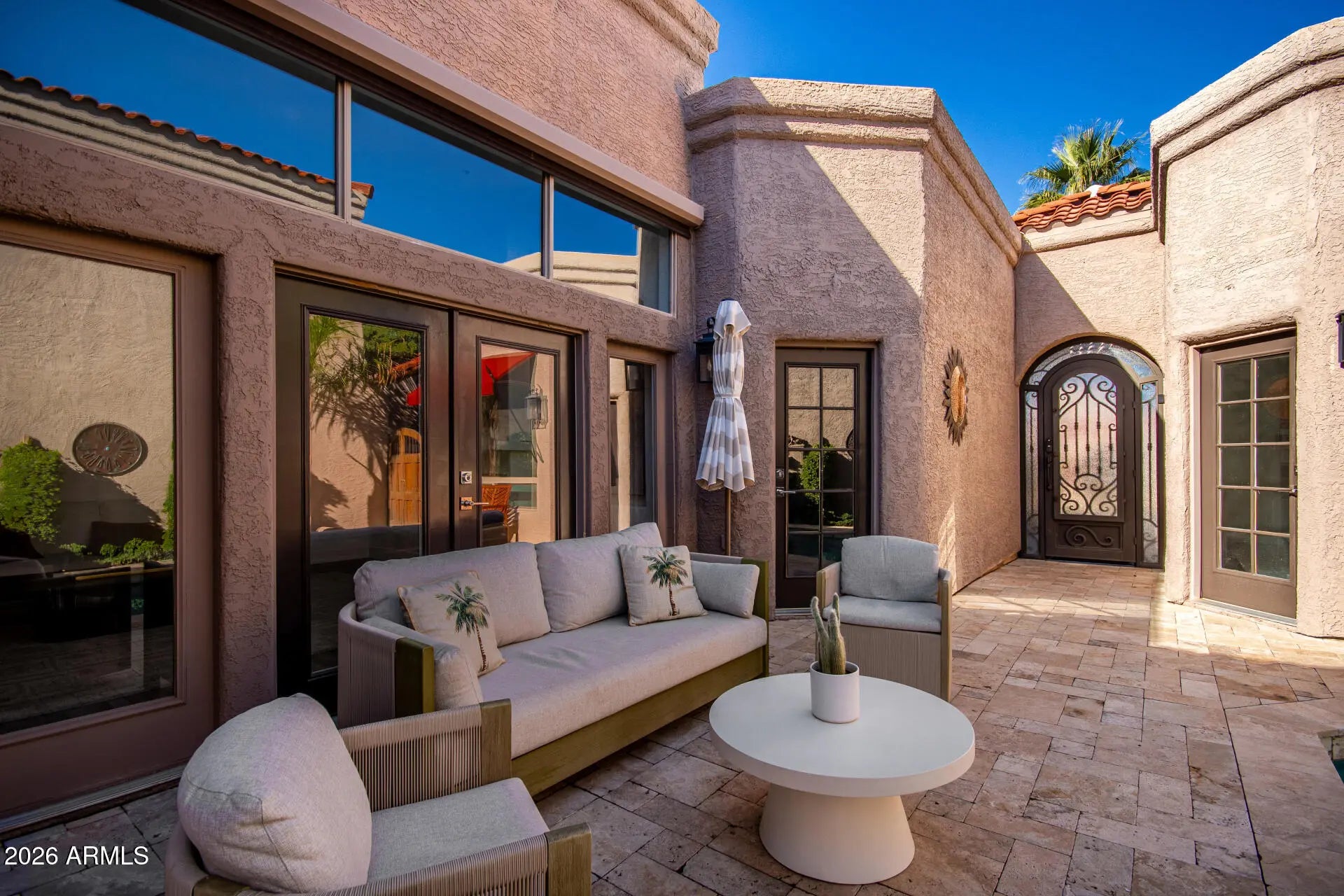 Pride of ownership is evident in this remodeled villa-style home in McCormick Ranch. The single level floor plan features 11+ foot ceilings, multiple skylights and 3 ensuite bedrooms including the detached 284 sq. ft. casita. The spacious greatroom includes a fireplace and French doors opening to the outdoor courtyard and heated pool. Dining room with custom ceiling fixture. The kitchen features Taj Mahal quartzite counter tops with limestone back splash, new cabinets, recessed lighting and stainless-steel appliances. The spacious primary bedroom opens to the courtyard and heated pool. Other features include tile floors throughout the home and 2 car garage. La Mariposa is centrally located with dining, shopping and entertainment options all within walking distance. MUST SEE!