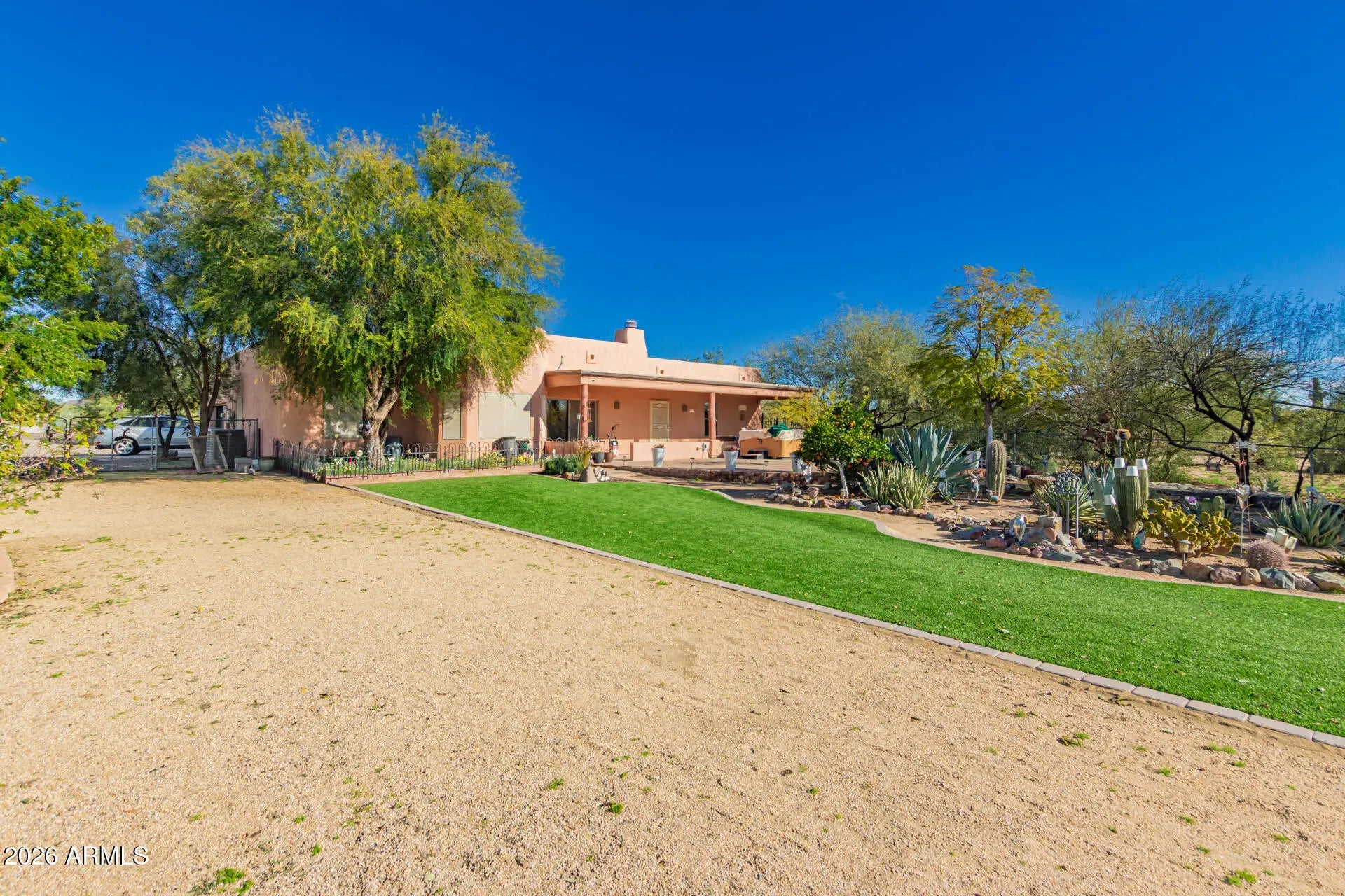 Beautiful Custom 4 bedroom 2 Bathroom Home w/ a 3 Car Garage located on a 1.183 acre lot with a circular driveway surrounded by mountain views! A gated courtyard lined with pavers leads to the covered front door entrance. Through the front door a foyer opens to a great room floor plan w/ ceramic tile flooring and high ceilings overhead accented by a cozy fireplace as well as decorative fans and fixtures. The kitchen is complete w/ granite countertops, wood cabinetry, recessed lighting, stainless steel appliances, a pantry, & a large center island. The primary bedroom features a direct backyard access, an ensuite w/ dual sinks, new walk-in shower, a walk-in closet. The expansive outdoor space is the true highlight, boasting a covered patio, a spa, a shed for a workshop, breathtaking mountain views, and tons of space. Close to freeway access, TSMC Plant, Deer Valley Airport, dining, shopping and entertainment. Come and see!
