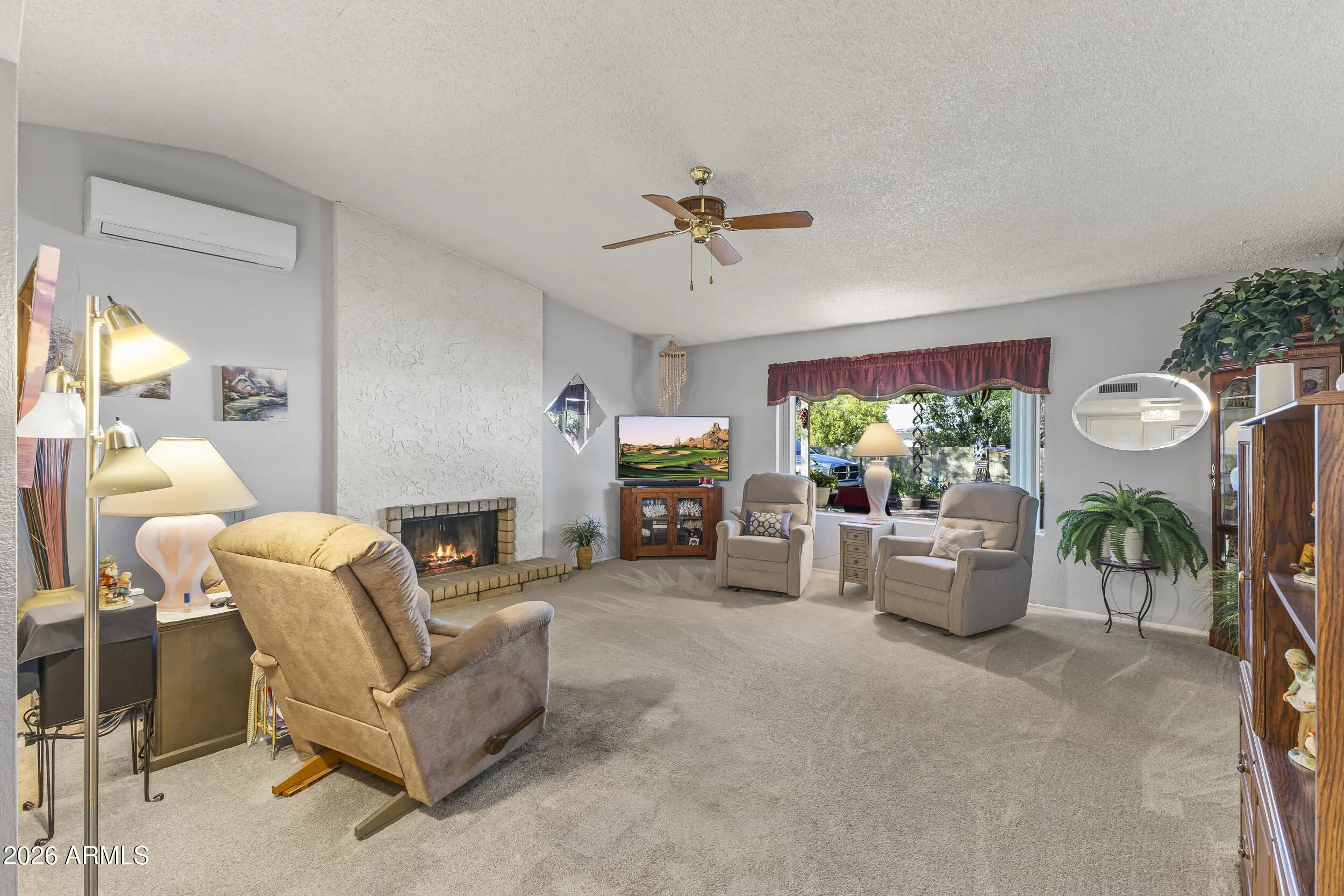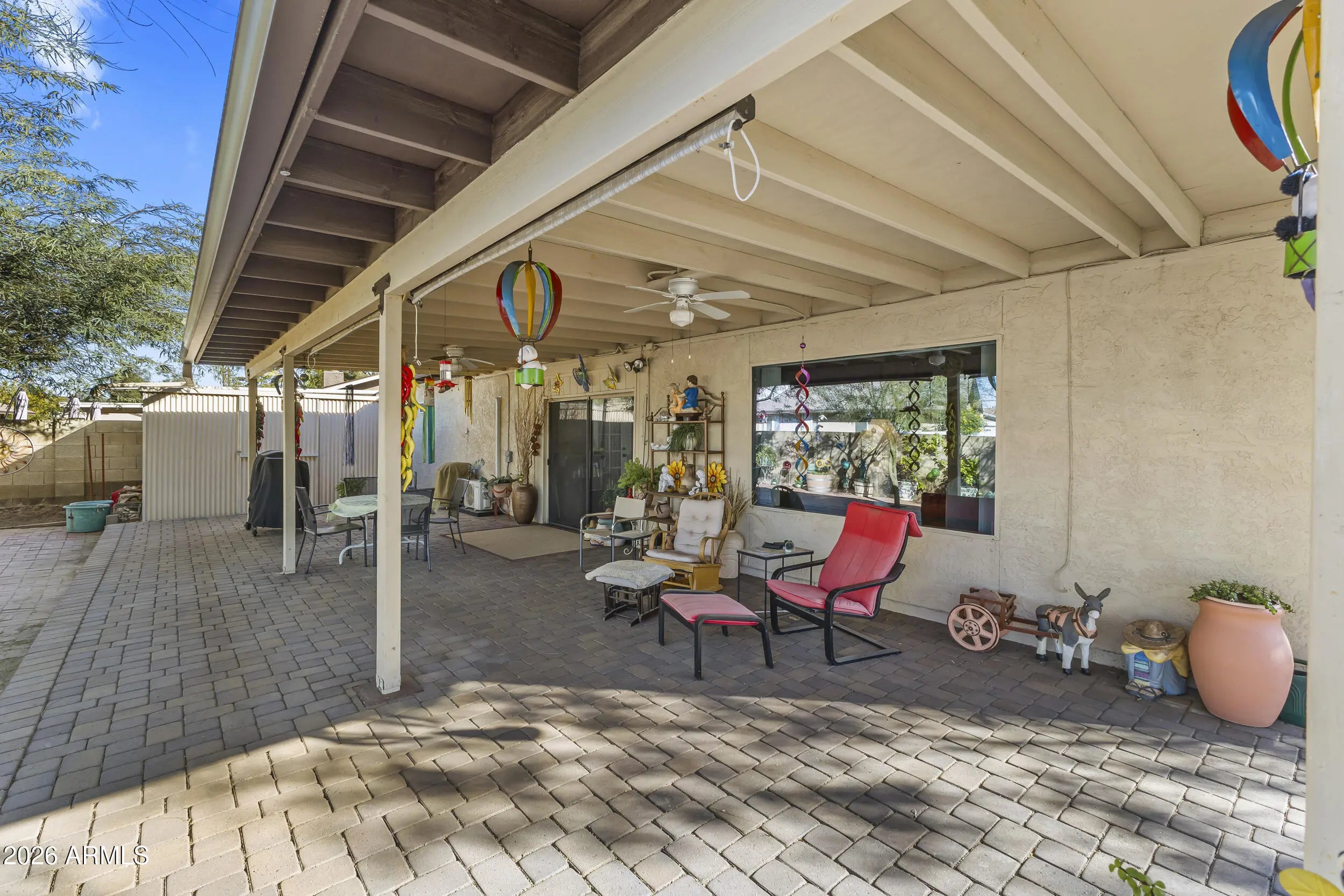 Now available in the non-HOA community of Via De Paz, this 2 Bed 2 Bath home can be yours! Located on a corner lot, with an RV gate! You'll have not only a 2-car garage with an additional storage room but also a quality storage shed out back! The covered patio with brick pavers, provides a private outdoor space along with an enclosed AZ Room. Inside, you're greeted with clean, stylish tile and carpeting, an updated kitchen in '23 with quartz counters and quality appliances! The main living room has vaulted ceilings, a fireplace, and a newer mini split. Both bedrooms boats ample space, plus the primary has a walk-in closet, and an additional, newer mini split. New roof in 2011, HVAC replaced in 2016 and most windows have been updated.