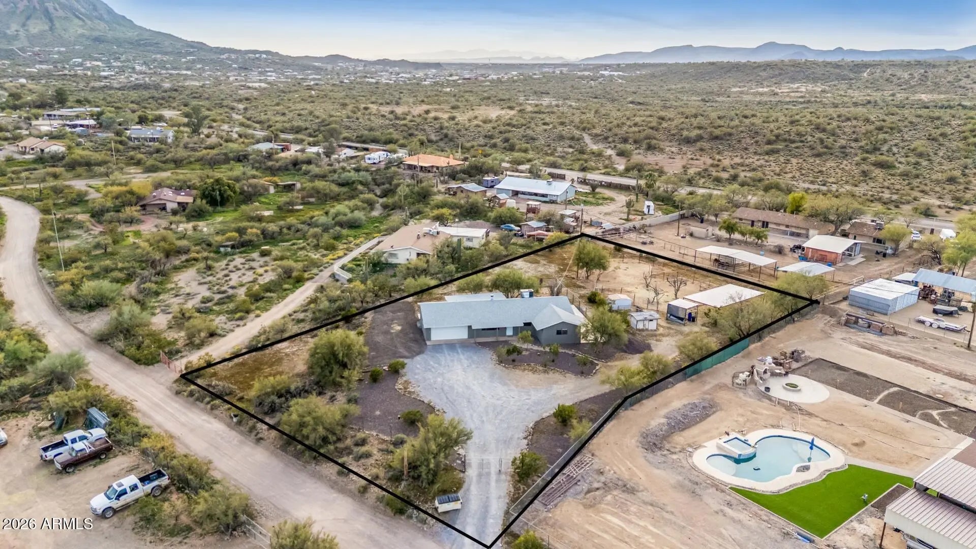 Set on a full acre in desirable New River, this beautifully updated 4 BEDROOM, 2 BATH horse property offers privacy, space, and versatility. Interior upgrades include TILE FLOORING THROUGHOUT, UPDATED BATHROOMS, and UPDATED EXTERIOR STUCCO. The home features an ORIGINAL WOOD-BURNING VINTAGE FIREPLACE, adding character and warmth. The fully FENCED YARD provides ample room for animals, toys, and outdoor living. Equestrian amenities include a 20X40 STEEL SHELTER, 10X10 HAY STRUCTURE, and HORSE PEN. Additional highlights include a 2023 A/C UNIT and PRIVATE WELL. Ideal for EQUESTRIAN USE, RURAL LIVING, OR THOSE SEEKING SPACE AND FREEDOM.