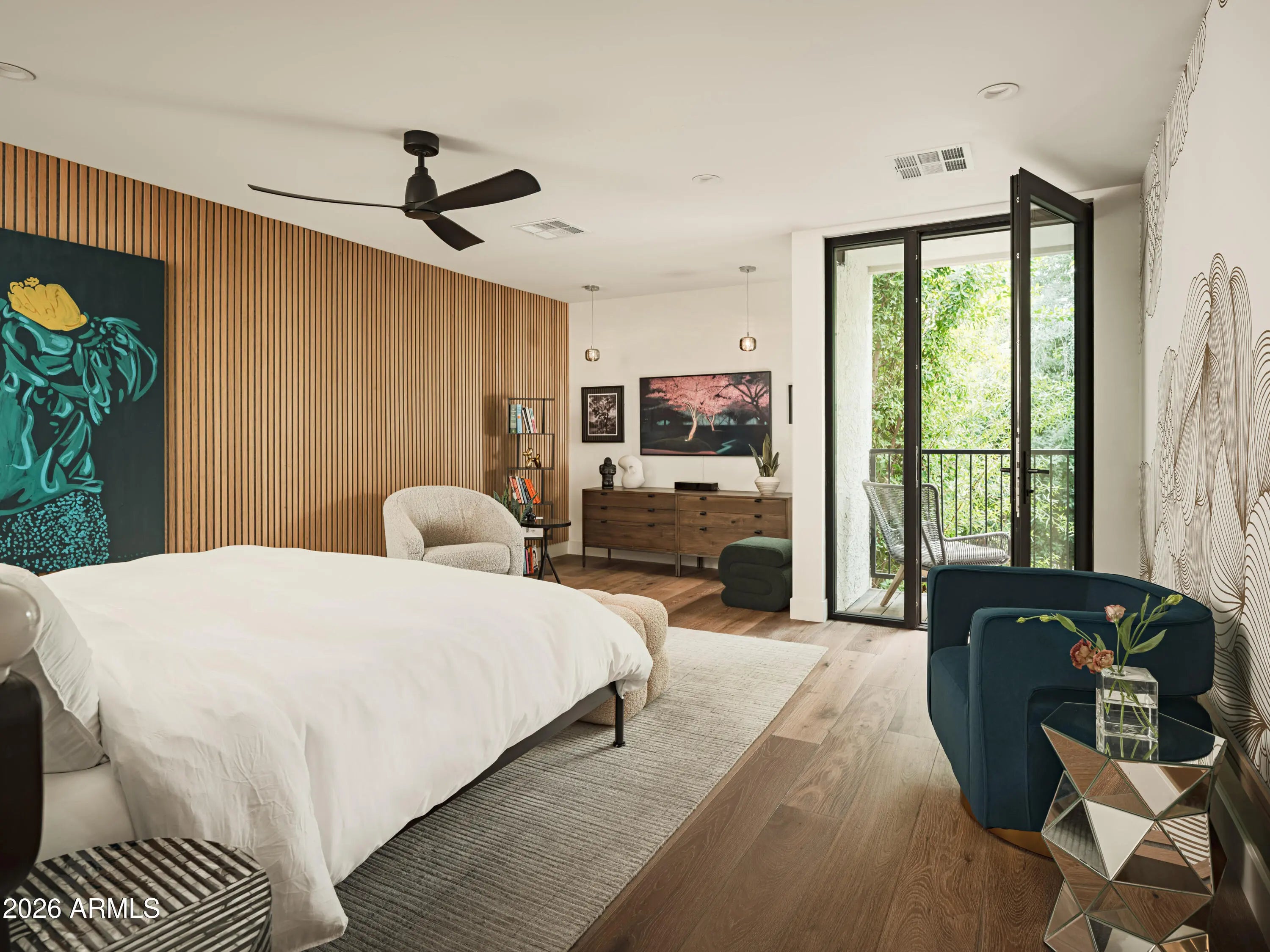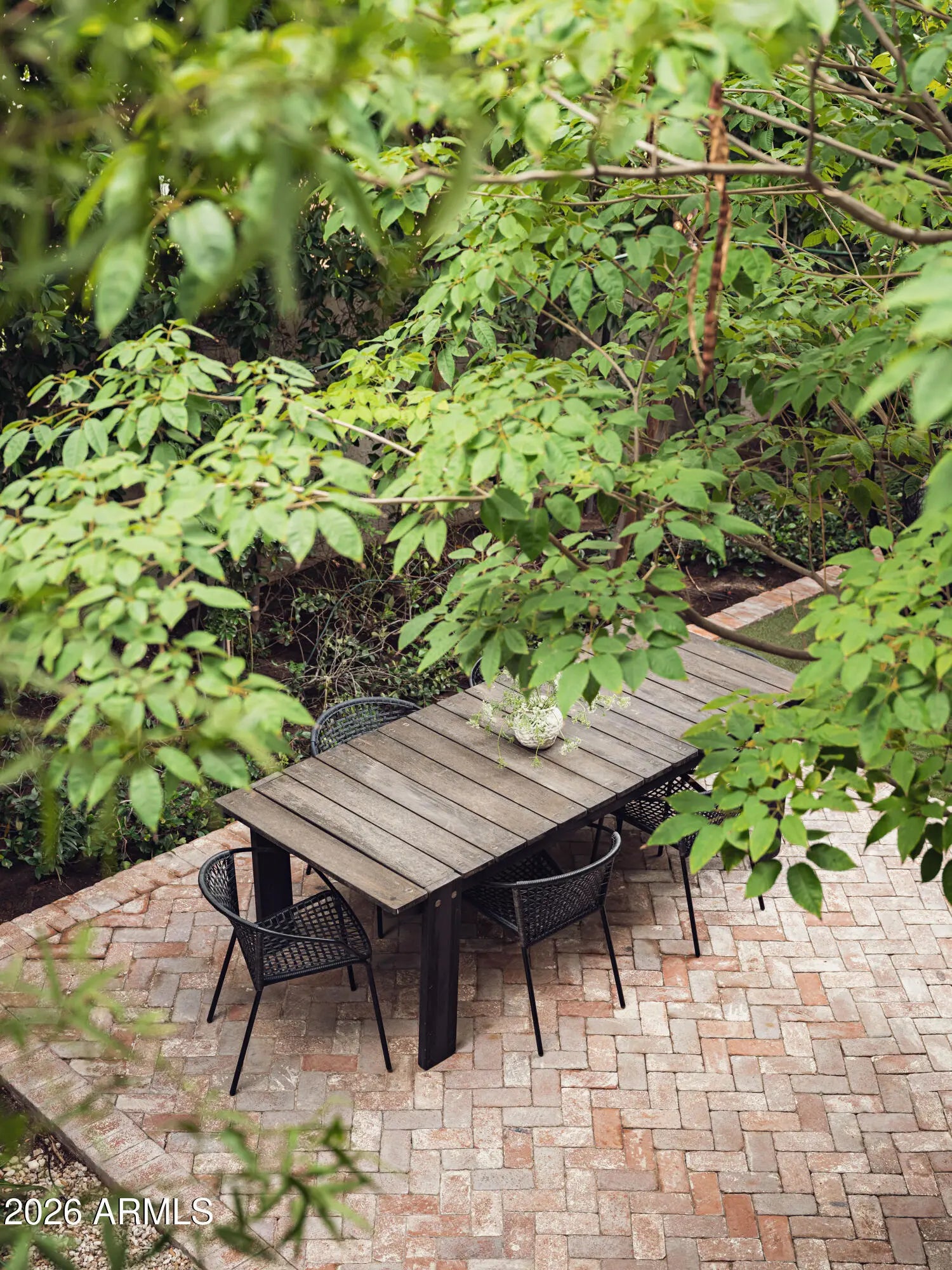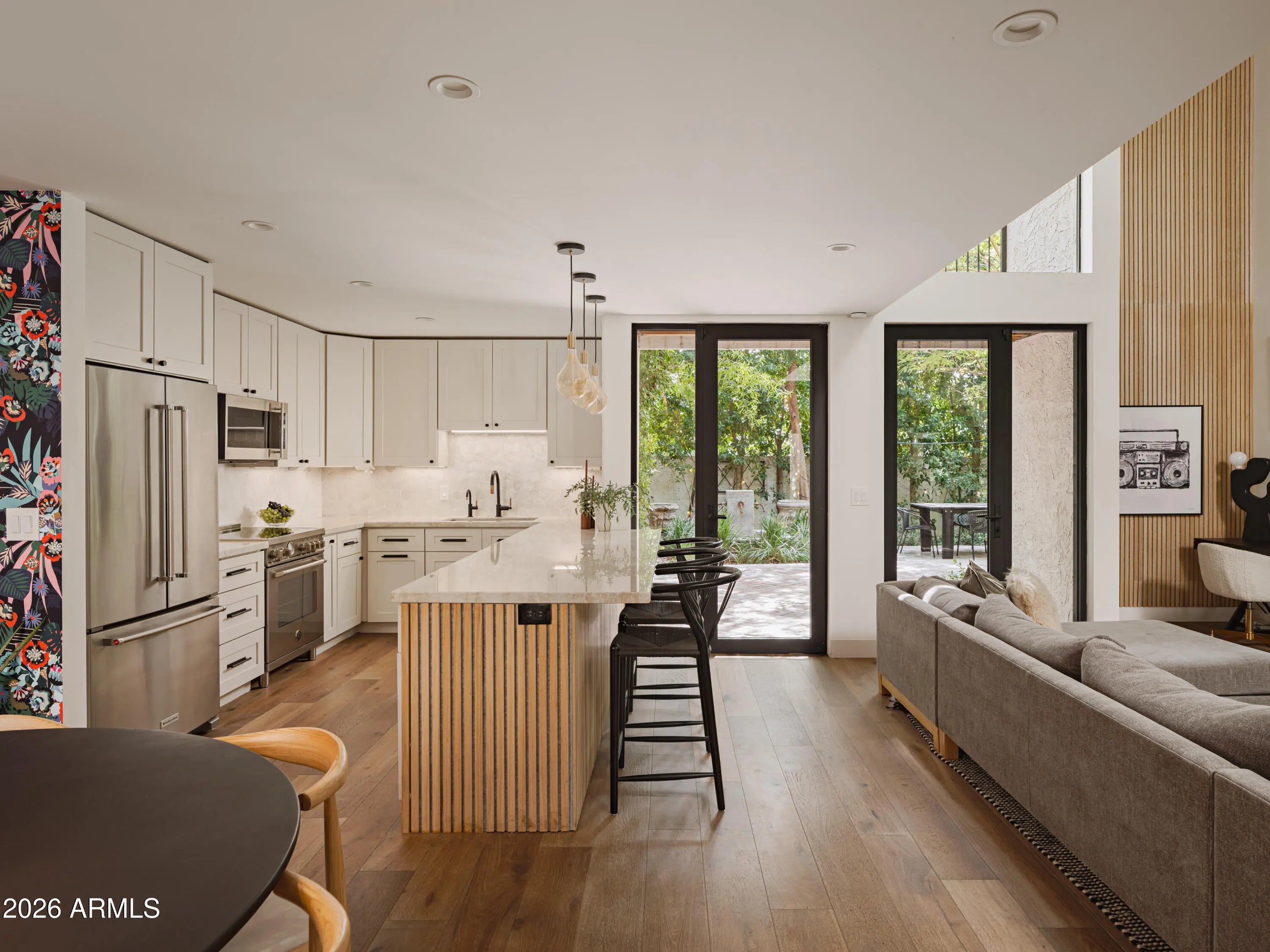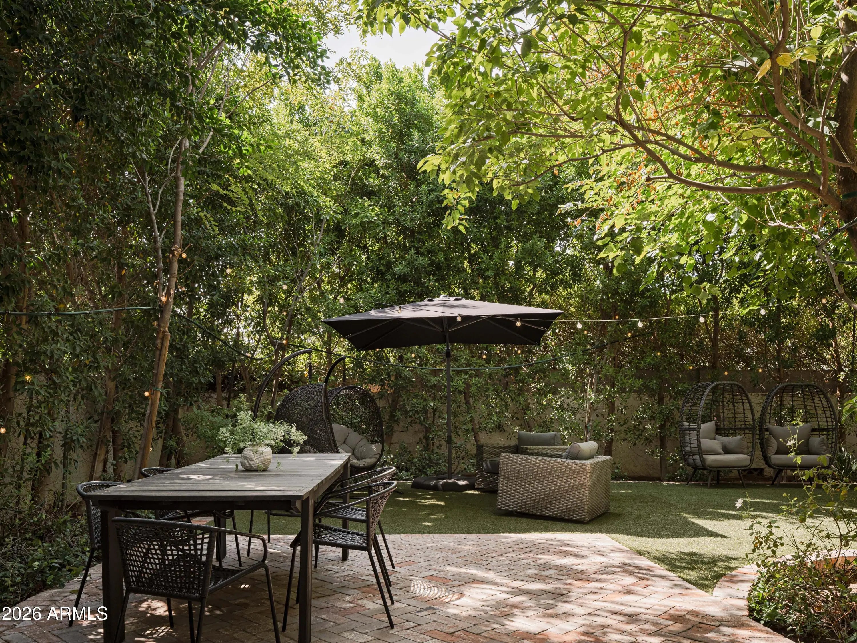 Welcome to Bridgewood North, one of Arcadia's best-kept secrets, a gated and hidden enclave of iconic townhomes designed by Al Beadle, known for their timeless modernism and strong architectural identity. This coveted corner residence stands apart, featuring a living room with soaring 20-foot ceilings, chic updates, a recently updated kitchen, and the best private yard in the complex, a rare and lush retreat that's perfect for Arizona indoor-outdoor living. Light-filled and thoughtfully updated, the home features a dramatic floating staircase, expansive windows, a custom fashion closet, and a spa-like bathroom designed for relaxation. Outdoors, a leafy patio and yard surrounded by mature trees creates an unexpected oasis, perfect for entertaining or unwinding in privacy. Ideally located near Arcadia's top restaurants, coffee shops, and boutiques, this home embodies modern desert living at its best, architectural, timeless, and effortlessly livable.