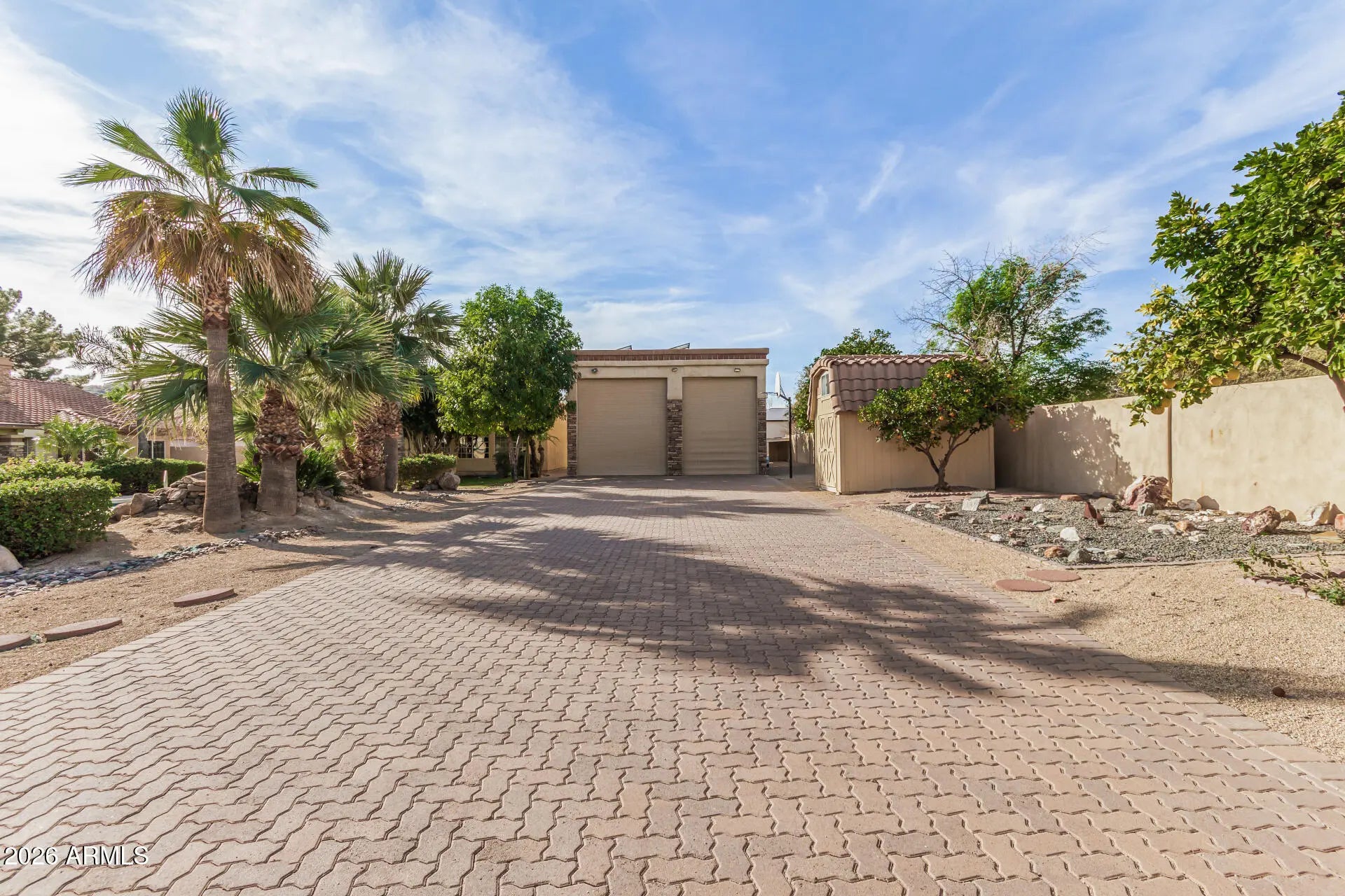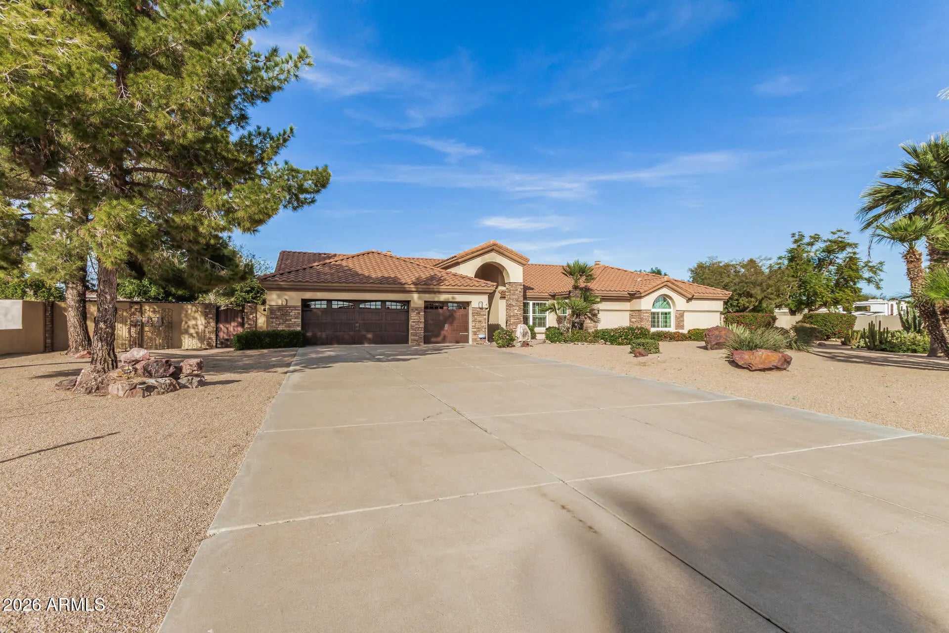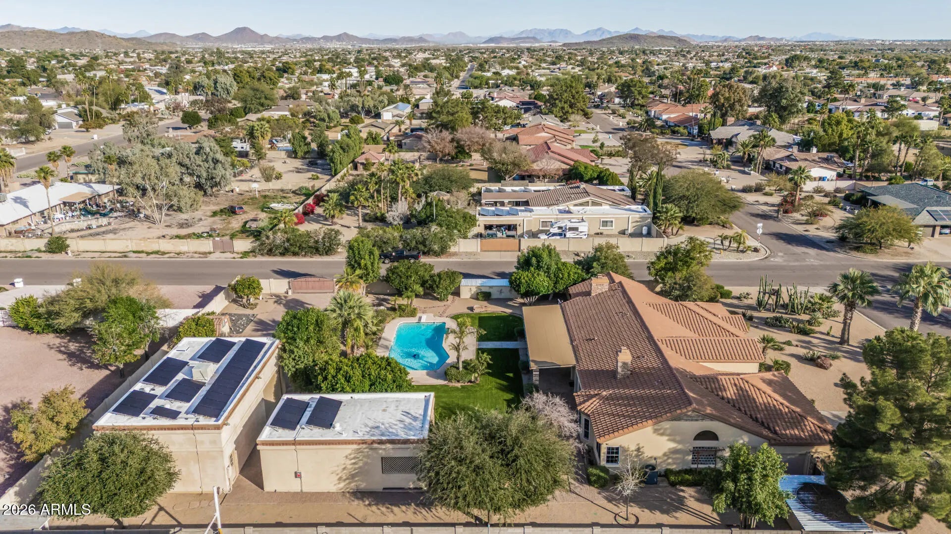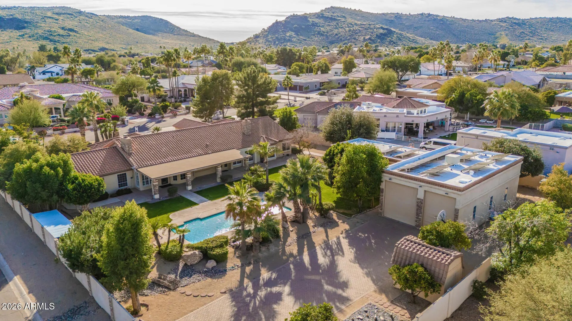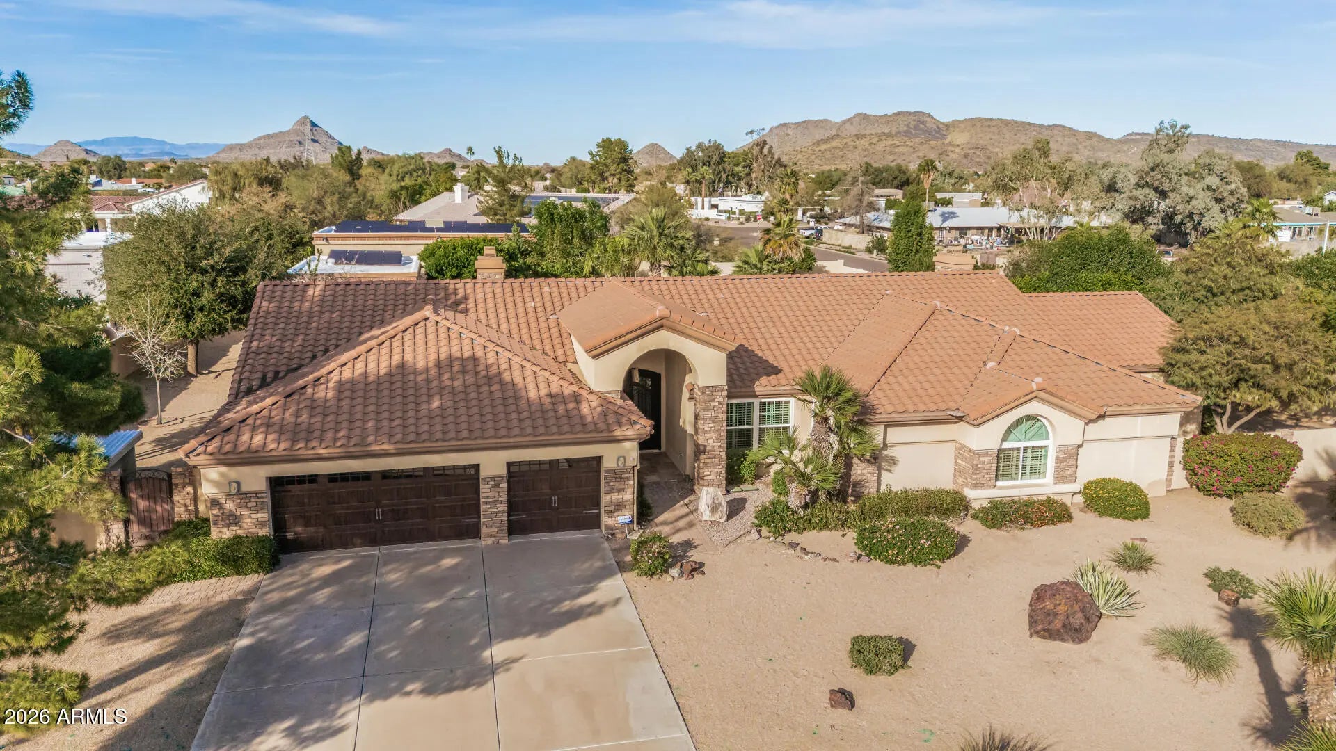 HARD TO FIND SINGLE LEVEL BLOCK HOME ON ALMOST AN ACRE WITH RV GARAGE, CASITA, MTN VIEWS & OWNED SOLAR! 1269SF RV Garage on corner for easy entry with huge pavered driveway, electronic gates, 540 sf casita with full kitchen & full bath, pebbletec pool & lush gorgeous landscaping. Main home (3849sf) features a split primary suite, an additional 3 bedrooms, a game room, office and an additional office area (hobby room) with separate exit off laundry room. All roofs have been redone (solar located on casita and rv garage roof only) AC's replaced in 2023. Almost all windows replaced. Open concept floor plan with spacious kitchen open to large family room with fireplace. Vaulted ceilings, light & bright throughout with large windows overlooking backyard. This home is priced to sell The chef's kitchen has a center island, abundant cabinetry, granite counters, tile backsplash, built-in appliances, & a charming breakfast nook highlighted by a sunny bay window. A perfectly sized den provides flexible living space for an office! Huge main bedroom is a true sanctuary with its own backyard access, a bay window, a walk-in closet, & a lavish bathroom w/dual vanities, a jetted tub, & a shower w/glass block wall. Secondary bedrooms are comfortably carpeted & share a convenient Jack-&-Jill bathroom. The laundry room includes a sink & built-in cabinets for convenience. Fall in love with the detached casita offering a bathroom, full kitchen, & open common areas, making it ideal for guests or extended family. Backyard oasis comprises sparkling blue pool, grassy areas, shade/citrus trees, covered patio, lovely pavers, storage shed, & breathtaking mountain views. This remarkable property also includes a sided RV gate, parking, & garage for all your toys! See it, love it, live it!