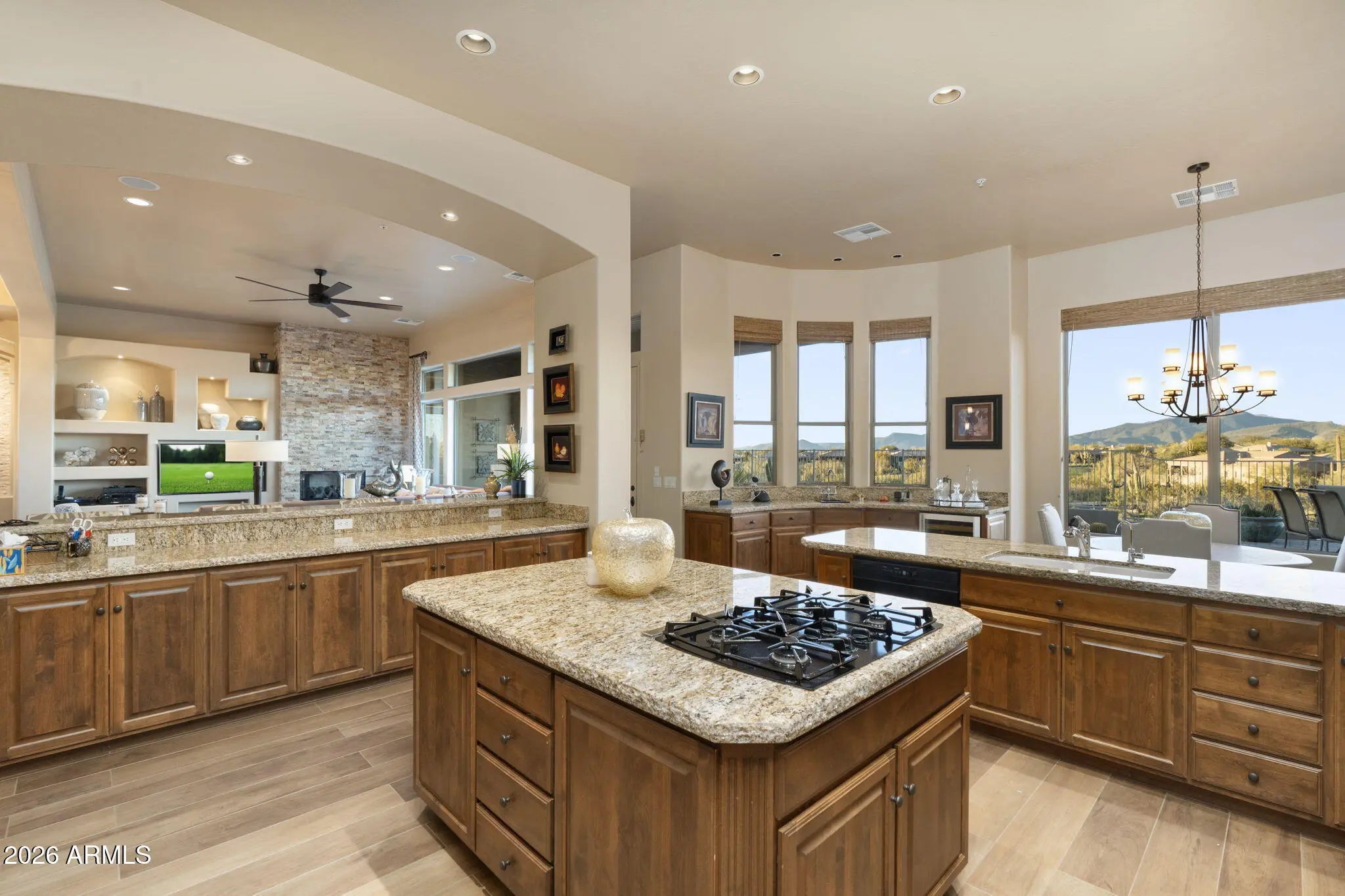 Views! Views! Views! Perched on the highest ridge in the gated section of Legend Trail, this stunning Avron Kachina floor plan offers magnificent panoramic views of the Continental Mountains and golf course. The home has been meticulously maintained & beautifully furnished. It truly shows like a model home. The open great room plan features tall windows showcasing the spectacular mountain views from the moment you approach the front door. Designer updates include wood look tiles in main living areas, stoned fireplace & art niches, and elegant light fixtures. All of the bathrooms have been fully updated with quartzite countertops and stylish neutral finishes. The spacious office and private guest ensuite are split from master. The expansive master ensuite boasts mountain views, luxurious bathroom, and large walk-in closet. From the courtyard, access a private 2 room guest casita with bathroom. The resort style backyard offers heated pool, spa, built-in bbq, and firepit sitting area that is perfect for admiring the AZ sunrises and sunsets! With low HOA fees, Legend Trail Community is rich with amenities including: pickleball, tennis, heated pools and spa, fitness center, games room, social activities, hiking/biking trails and more!!
