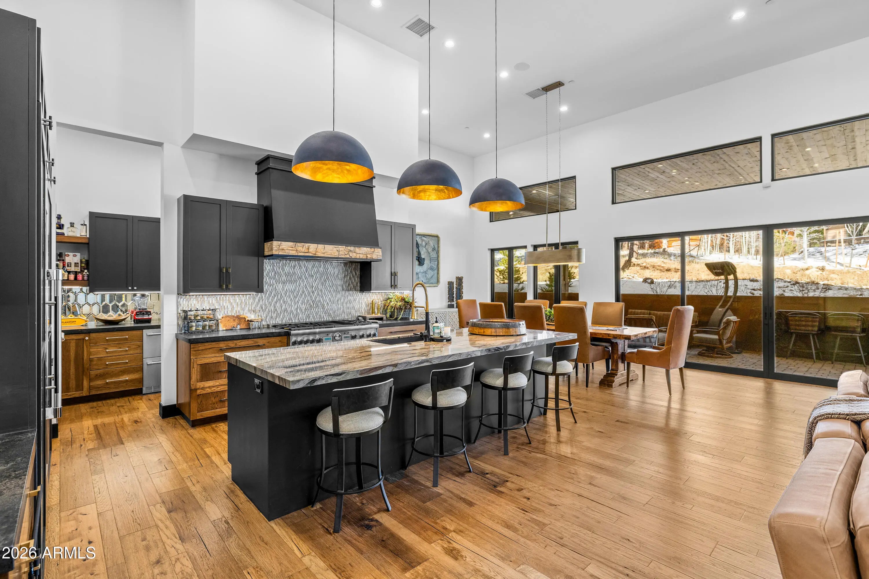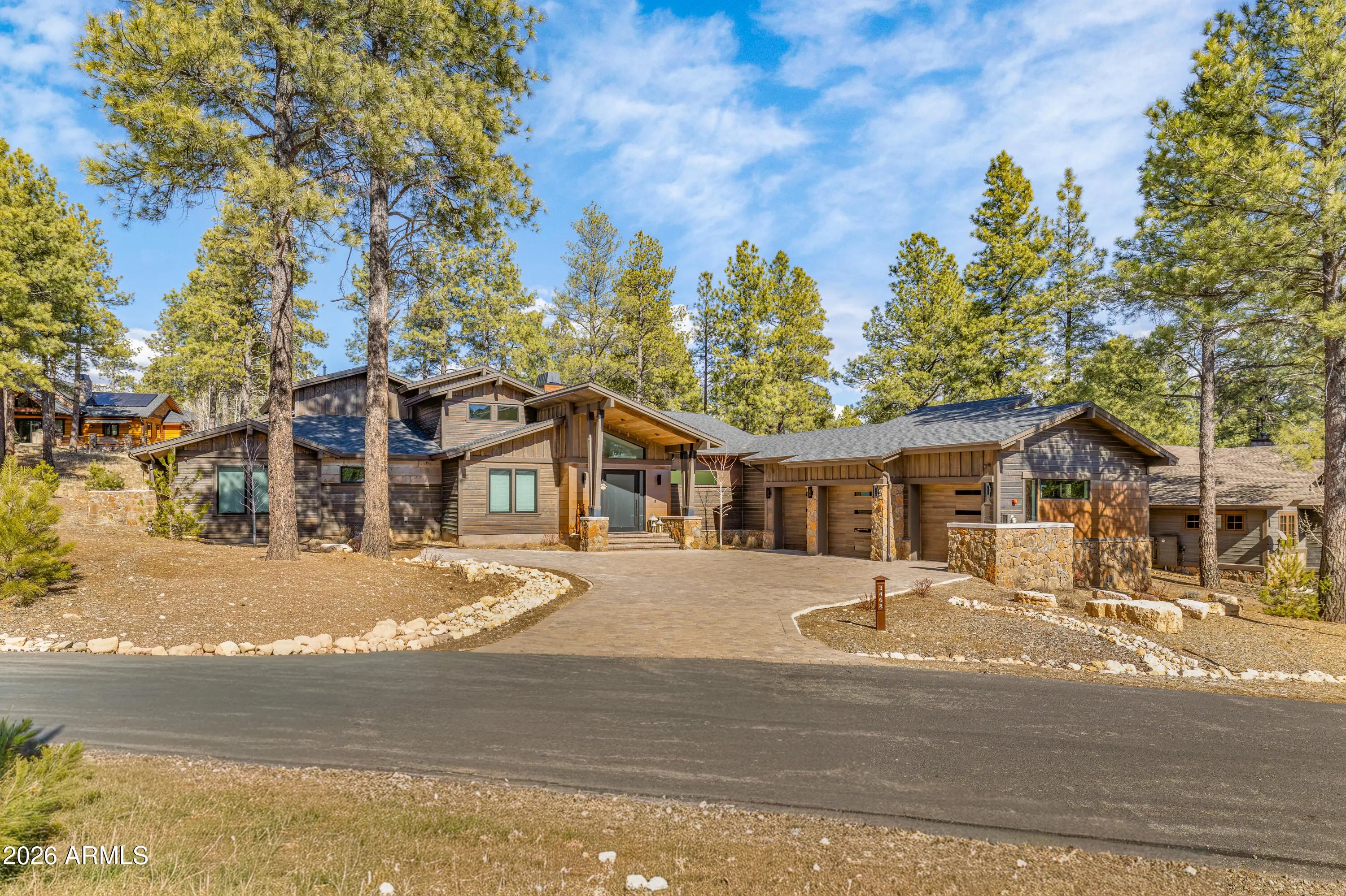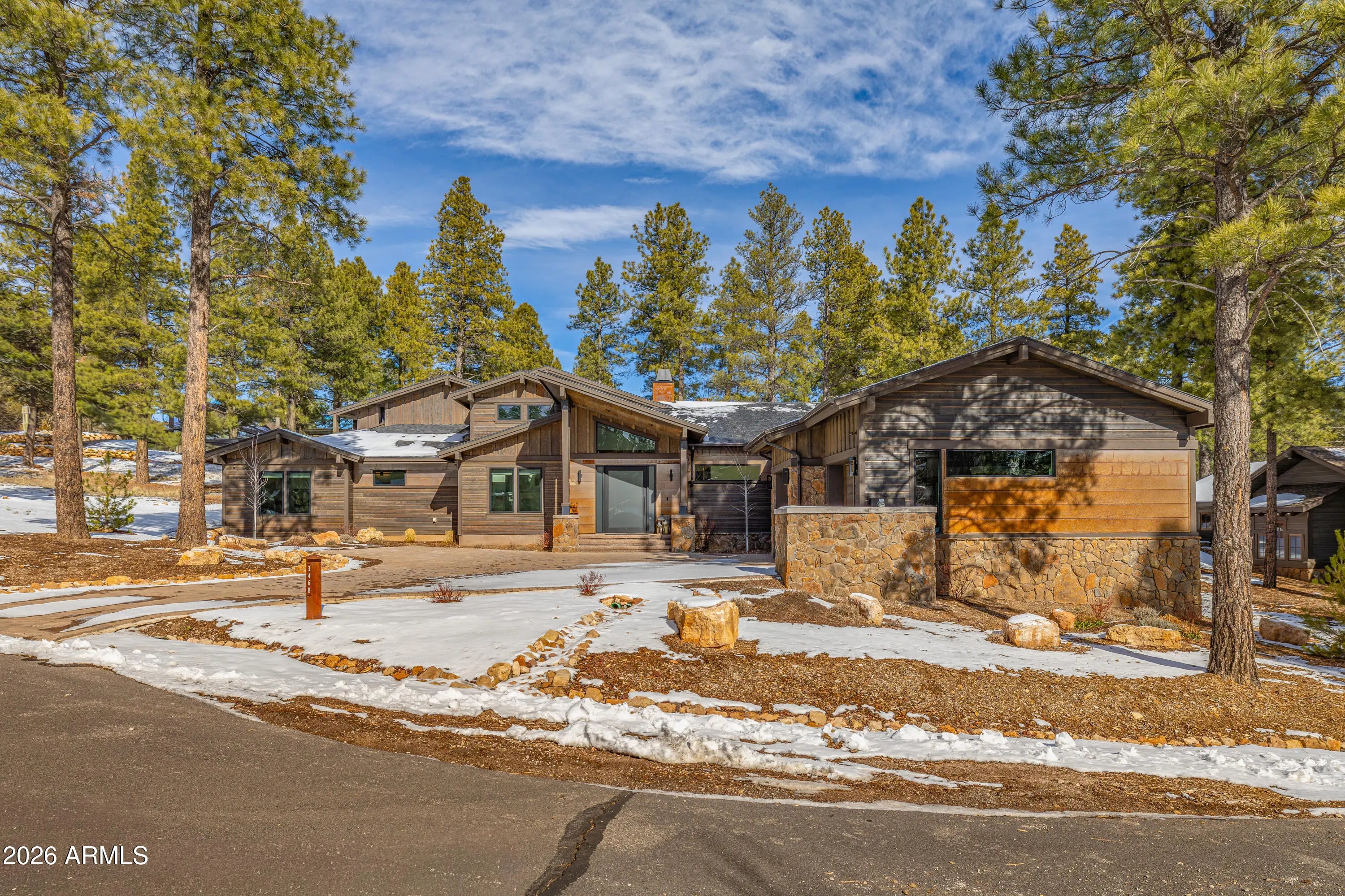 3468 S Del Mar CT, Flagstaff, AZ 86005. High Country modern featuring the most luxurious timeless finishes offered! Truly exceeds all standards of elegance, quality and function. Single level, four bedroom/four bath creates mountain living luxury throughout with soaring walls of windows, stone fireplace surround while creating an intimate mountain sophistication. Hard surfaces with edgy backsplash, Thermador appliances, scullery kitchen, heated bathroom floors, top of the industry lighting/camera and av systems, three ensuites (one primary) and a bunk room to capture all family enjoyment throughout all seasons. Back patio captures privacy, large entertainment area, hot tub under covered patio with heaters. This home is designed for lifestyle enjoyment.