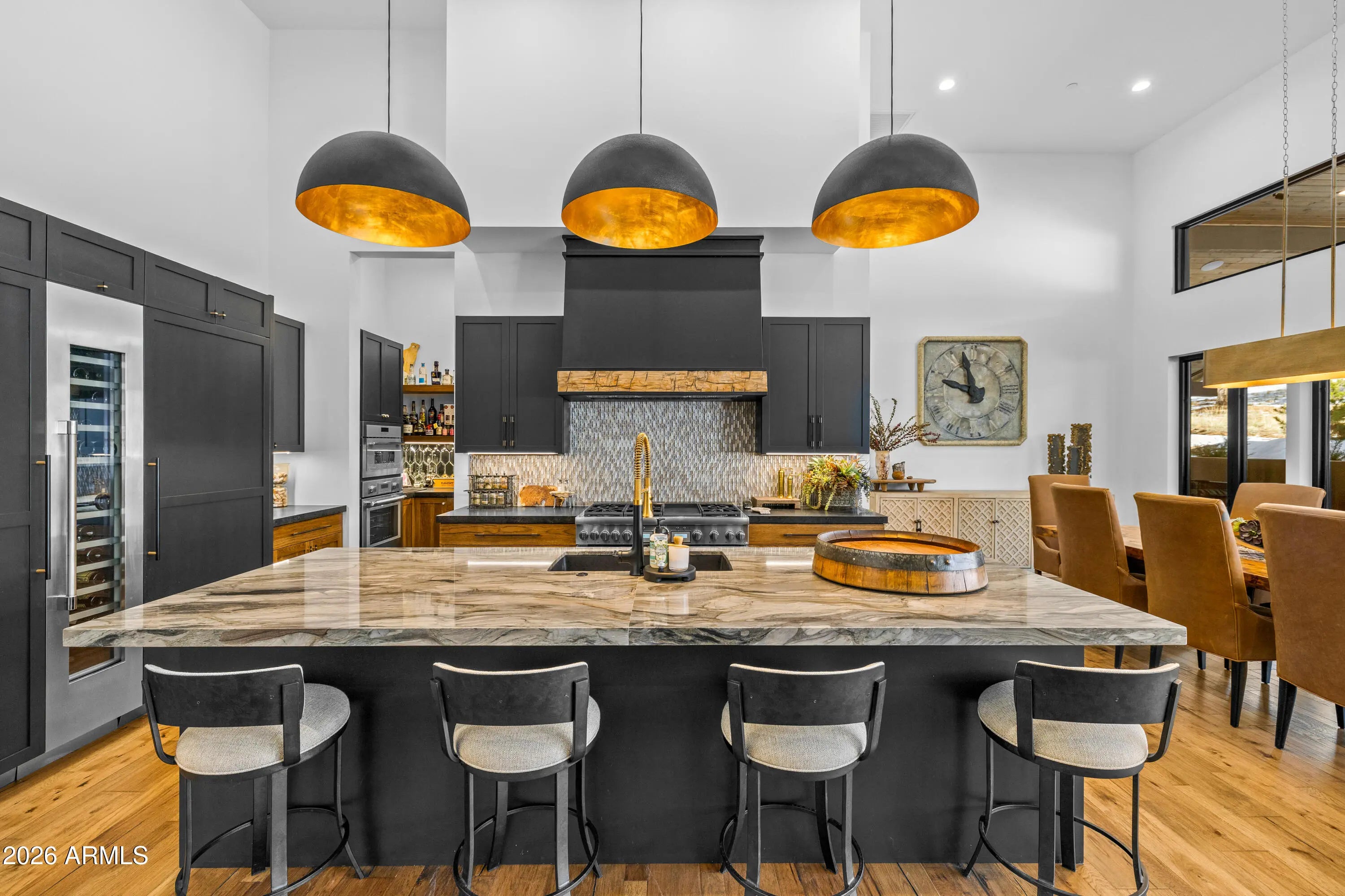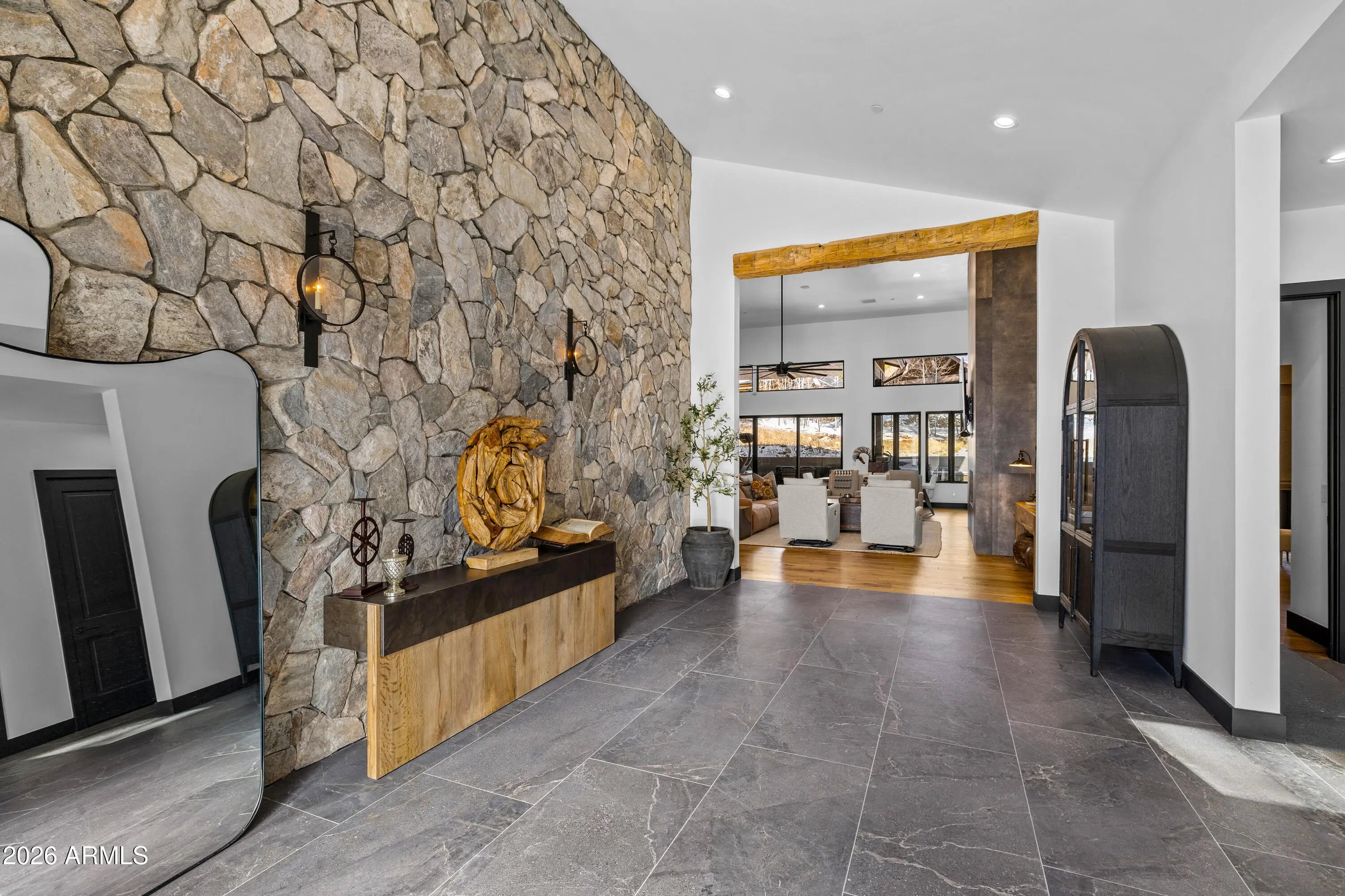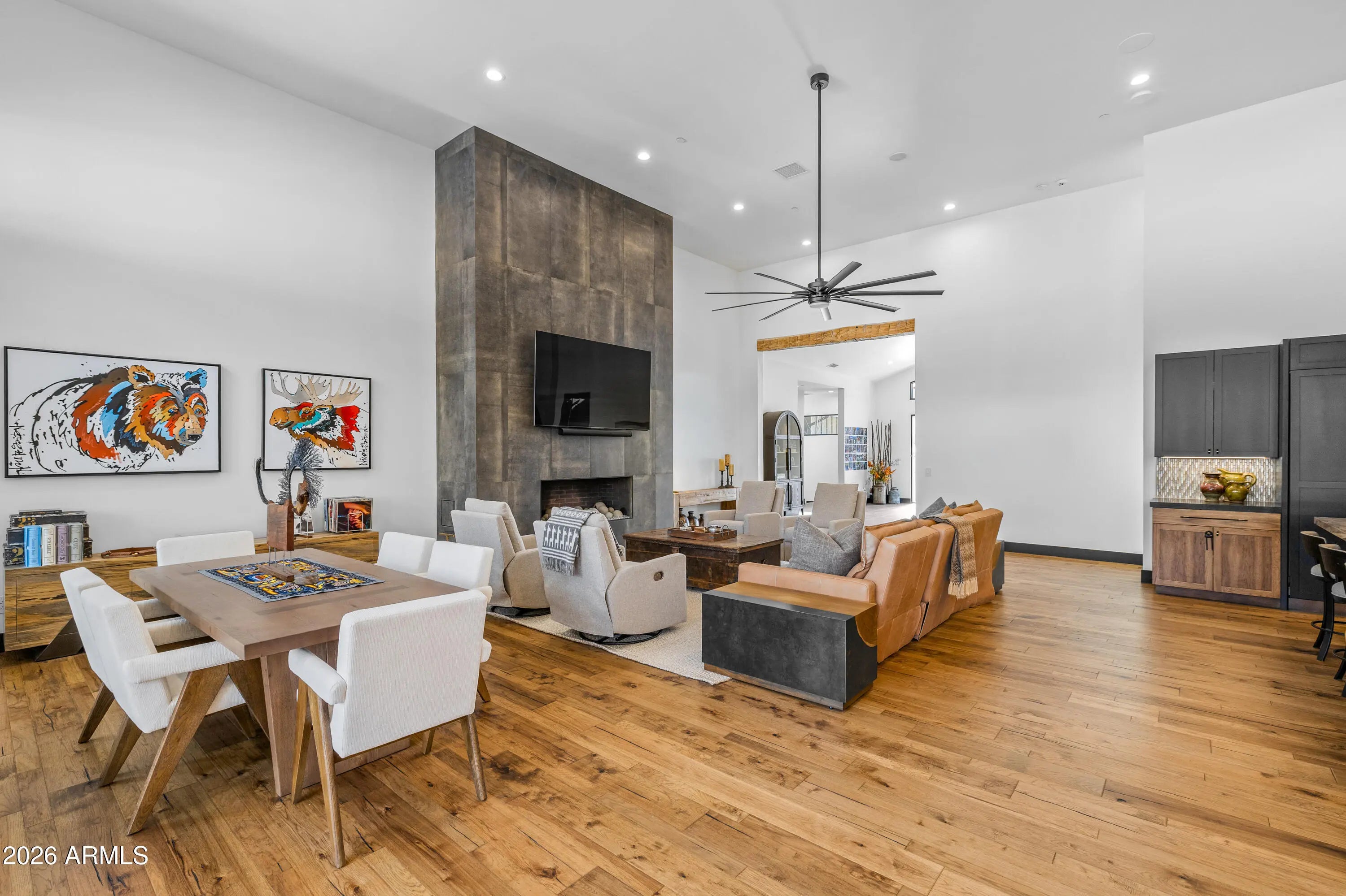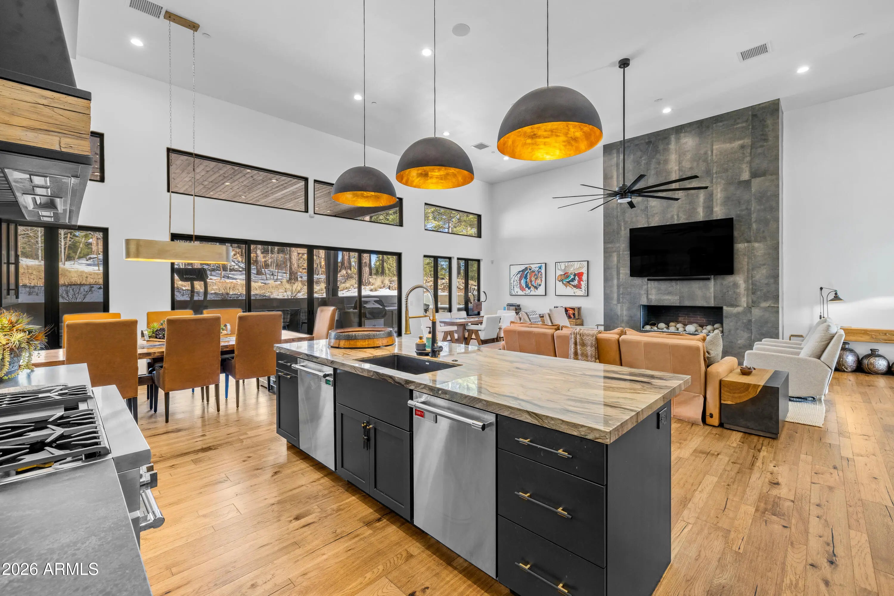 3468 S Del Mar CT, Flagstaff, AZ 86005. High Country modern featuring the most luxurious timeless finishes offered! Truly exceeds all standards of elegance, quality and function. Single level, four bedroom/four bath creates mountain living luxury throughout with soaring walls of windows, stone fireplace surround while creating an intimate mountain sophistication. Hard surfaces with edgy backsplash, Thermador appliances, scullery kitchen, heated bathroom floors, top of the industry lighting/camera and av systems, three ensuites (one primary) and a bunk room to capture all family enjoyment throughout all seasons. Back patio captures privacy, large entertainment area, hot tub under covered patio with heaters. This home is designed for lifestyle enjoyment.