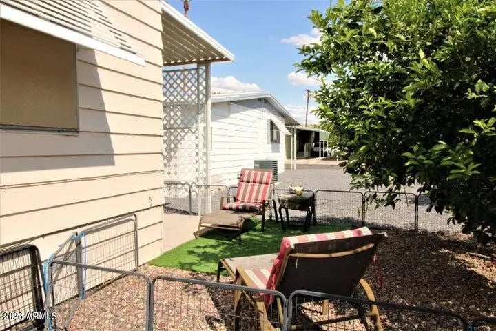 Beautiful and spacious 2 bedroom 2 bath manufactured home in a 55+ community. This home has been well maintained and has a spacious storage room under the carport. The home has new wave bladeless ceiling fans. The covered deck entry makes for a great relaxing gathering place for entertaining. You'll have fresh citrus in the fall. There are lemons and oranges. There is also a lower patio and an area for your small dog to enjoy the outdoors.