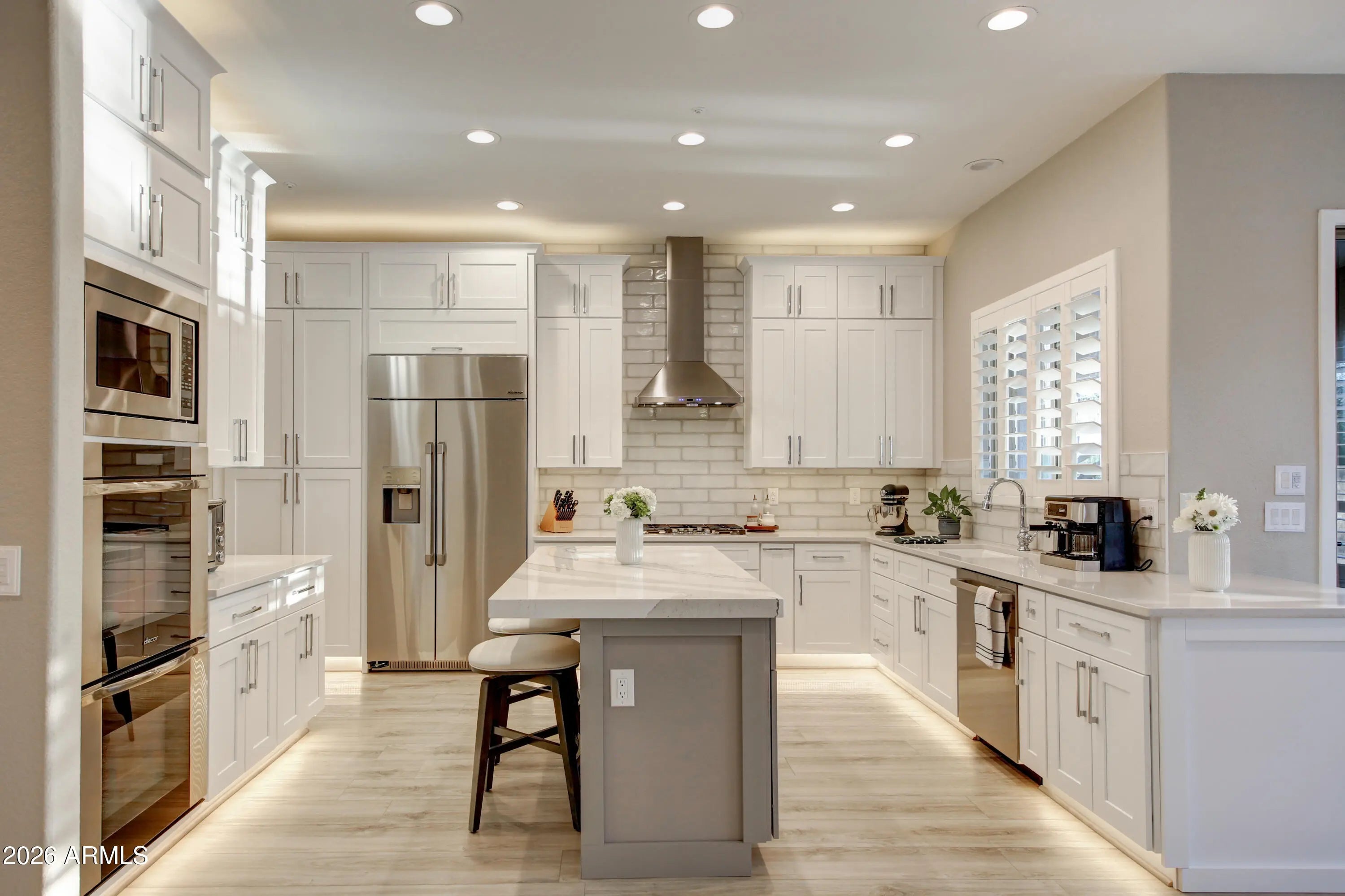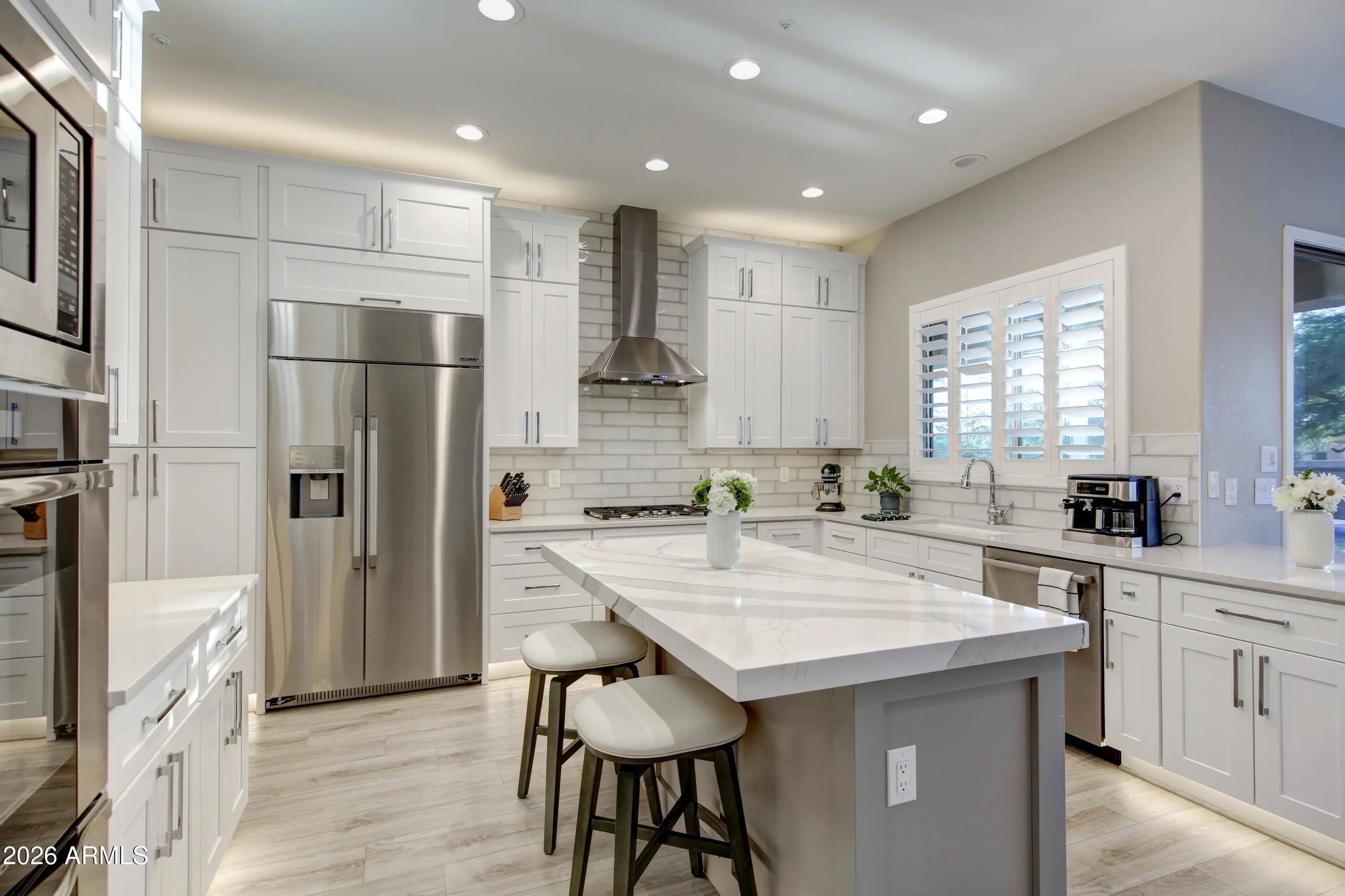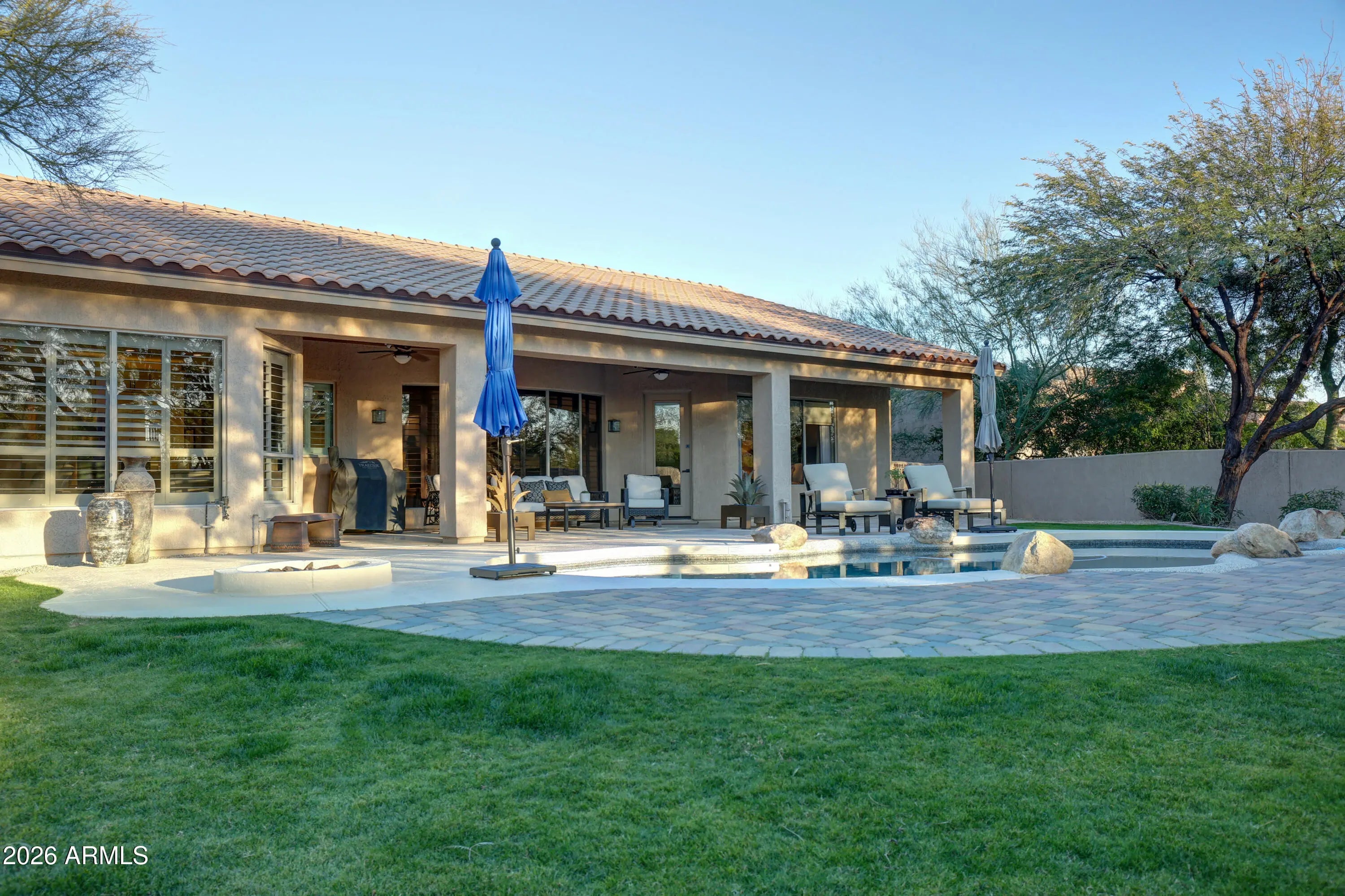 Beautiful North Scottsdale home in Scottsdale Vista Estates w/ upgrades galore! Features include 9-foot ceilings, plantation shutters, and a spacious 3-car garage. The freshly remodeled kitchen features double Dacor ovens, built-in Dacor stainless steel refrigerator, gas cooktop, and a view overlooking the expansive backyard. The primary suite includes an electric fireplace and an updated bathroom with a large walk-in shower, soaking tub, new cabinets, and quartz countertops. Situated on an oversized 16,000+ sq ft lot, the backyard offers a sparkling pool and a large covered patio with tongue-and-groove ceiling, perfect for everyday enjoyment and entertaining. All the big ticket items have been replaced: Roof in '24, HVAC units in '24 and '22 and much more!