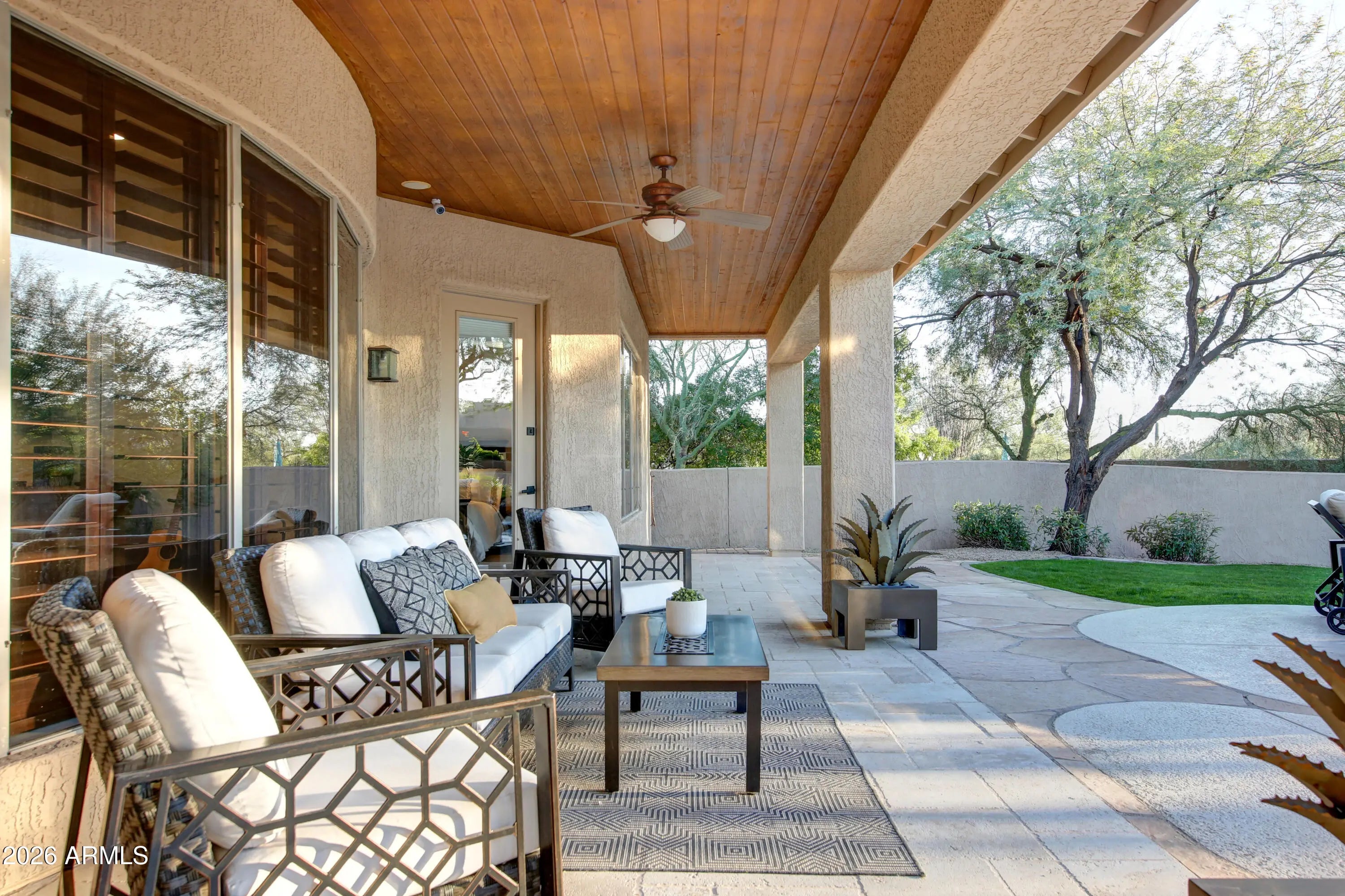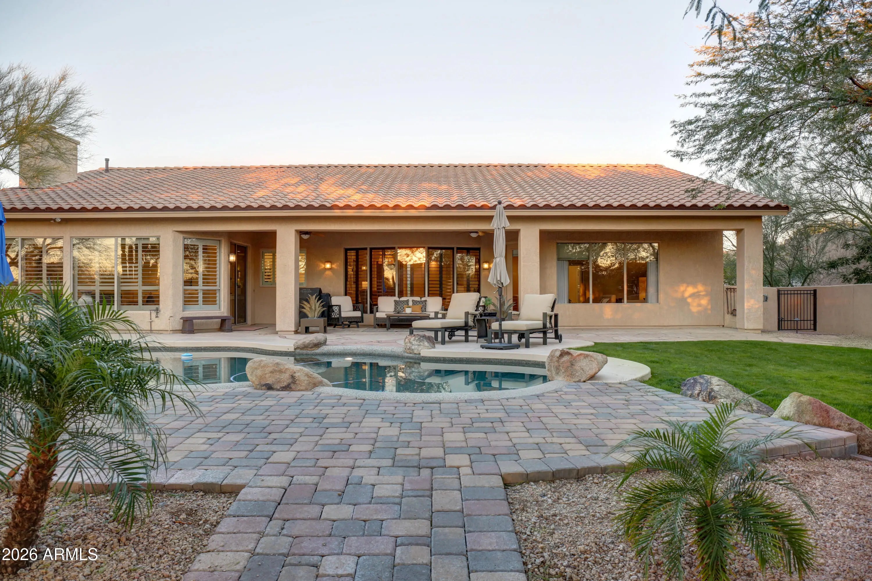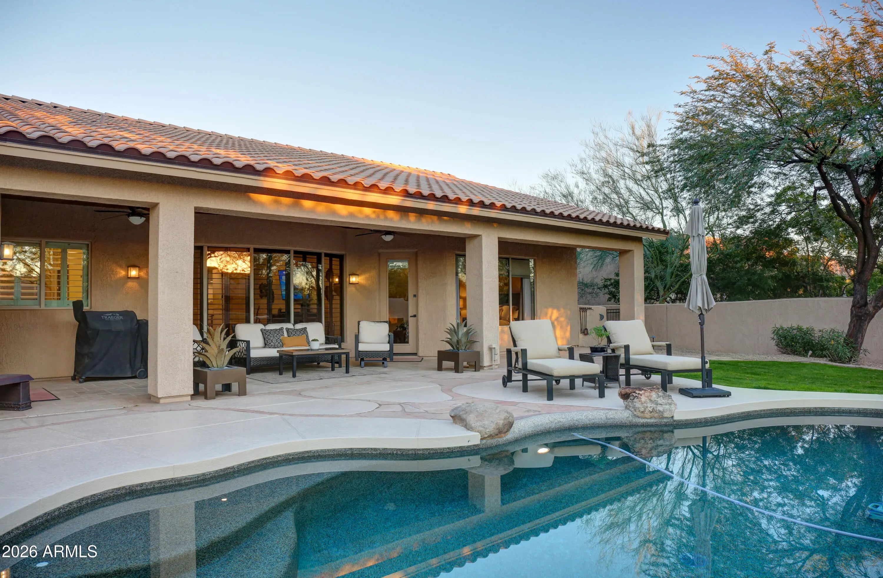 Beautiful North Scottsdale home in Scottsdale Vista Estates w/ upgrades galore! Features include 9-foot ceilings, plantation shutters, and a spacious 3-car garage. The freshly remodeled kitchen features double Dacor ovens, built-in Dacor stainless steel refrigerator, gas cooktop, and a view overlooking the expansive backyard. The primary suite includes an electric fireplace and an updated bathroom with a large walk-in shower, soaking tub, new cabinets, and quartz countertops. Situated on an oversized 16,000+ sq ft lot, the backyard offers a sparkling pool and a large covered patio with tongue-and-groove ceiling, perfect for everyday enjoyment and entertaining. All the big ticket items have been replaced: Roof in '24, HVAC units in '24 and '22 and much more!