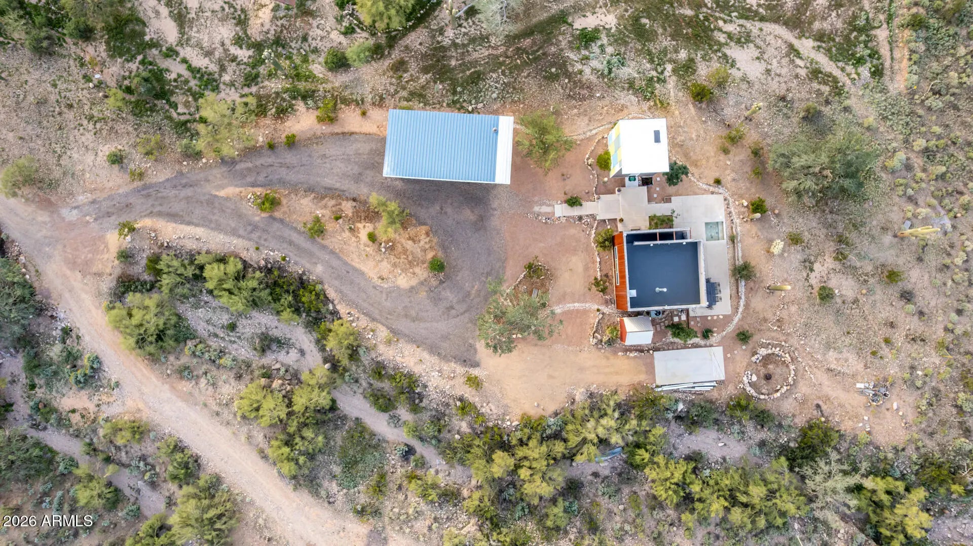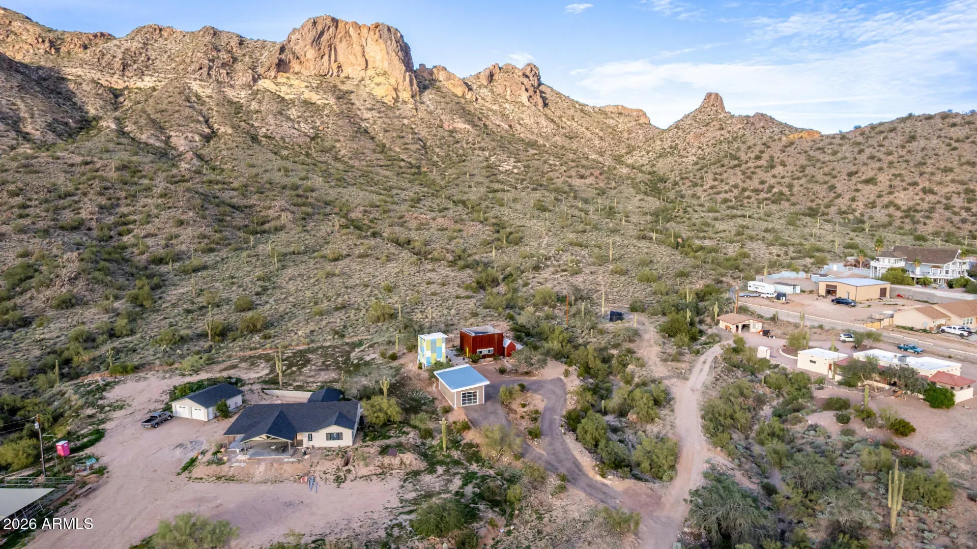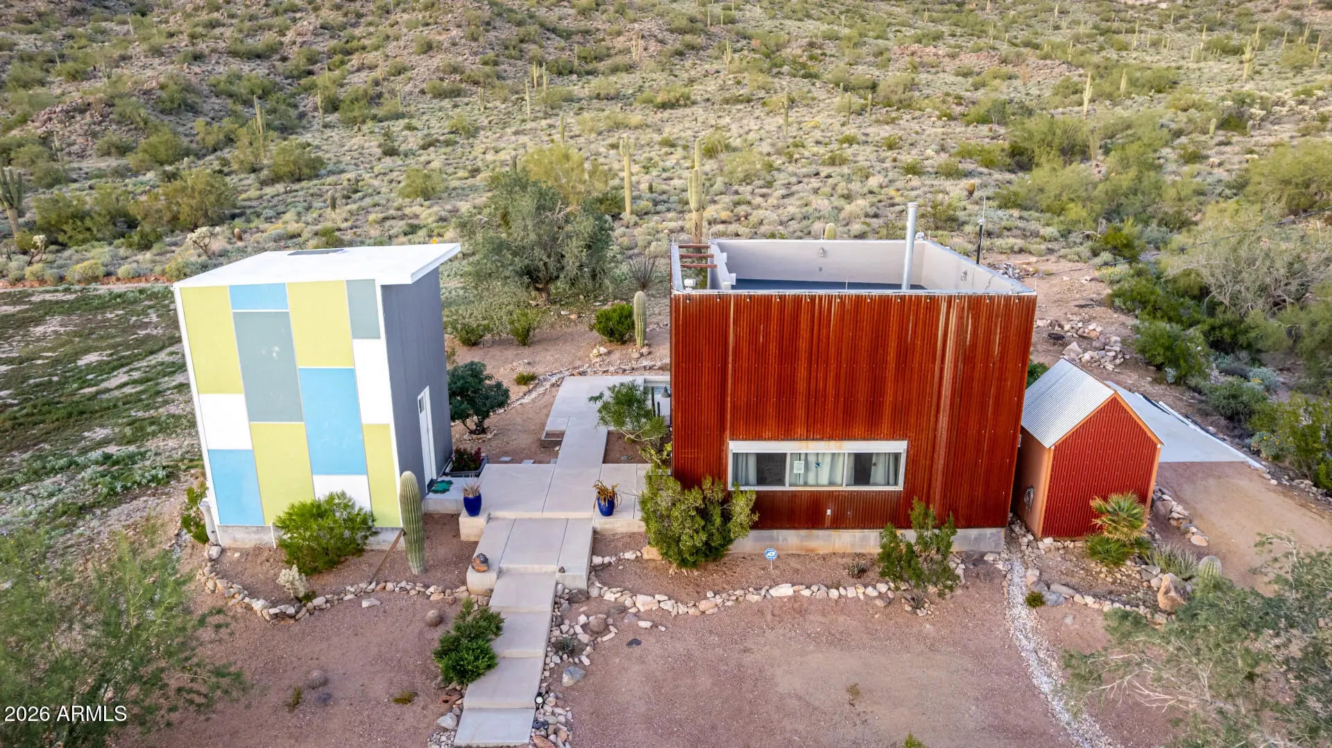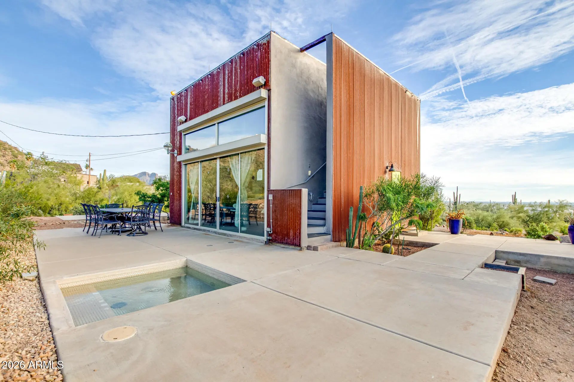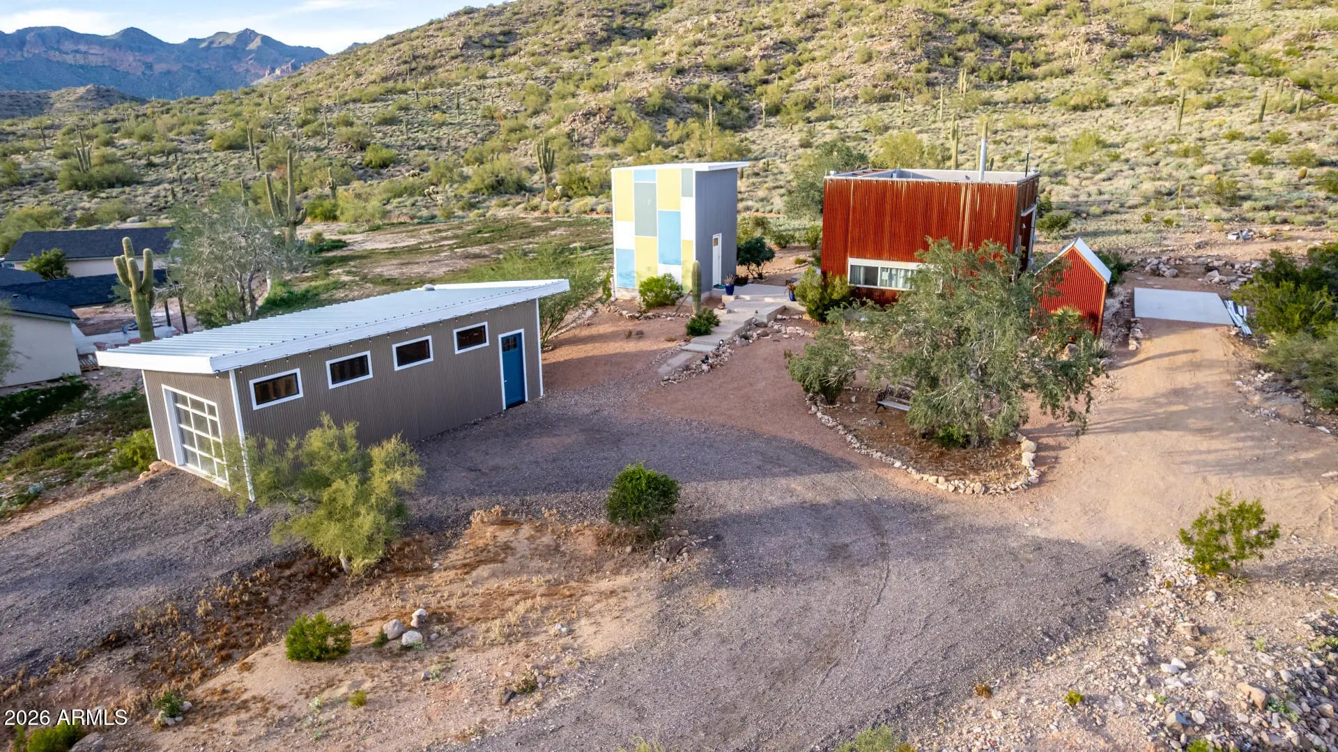 Architectural Desert Compound | Backs to National Forest Featured in Urban Home Magazine, this industrial retreat borders the National Forest with stunning valley and city light views. There were engineered plans for expansion. MAIN STUDIO: Modern studio w/ soaring ceilings, gas fireplace, & open kitchen. Features floor-to-ceiling glass w/ motorized steel security shutters. Spa bath w/ Jacuzzi, steam shower, & skylight. Roof is a full walk-on observation deck for stargazing. GUEST HOUSE: Unique colored tower w/ kitchen, bath, living, & upstairs bed. Mini-split AC. GARAGE & MORE: 35'x17' separate garage w/ electric, water, & septic access. Private dipping pool, north-side patio, & laundry shed. An artist's dream sanctuary with unmatched privacy and high-design efficiency. High on the forestry fence line. Backs right up to the Tonto National Forest with fantastic views of the Goldfield Mountains and the Superstition Mountains. Fantastic views of valley wide and unbelievable valley night lights.