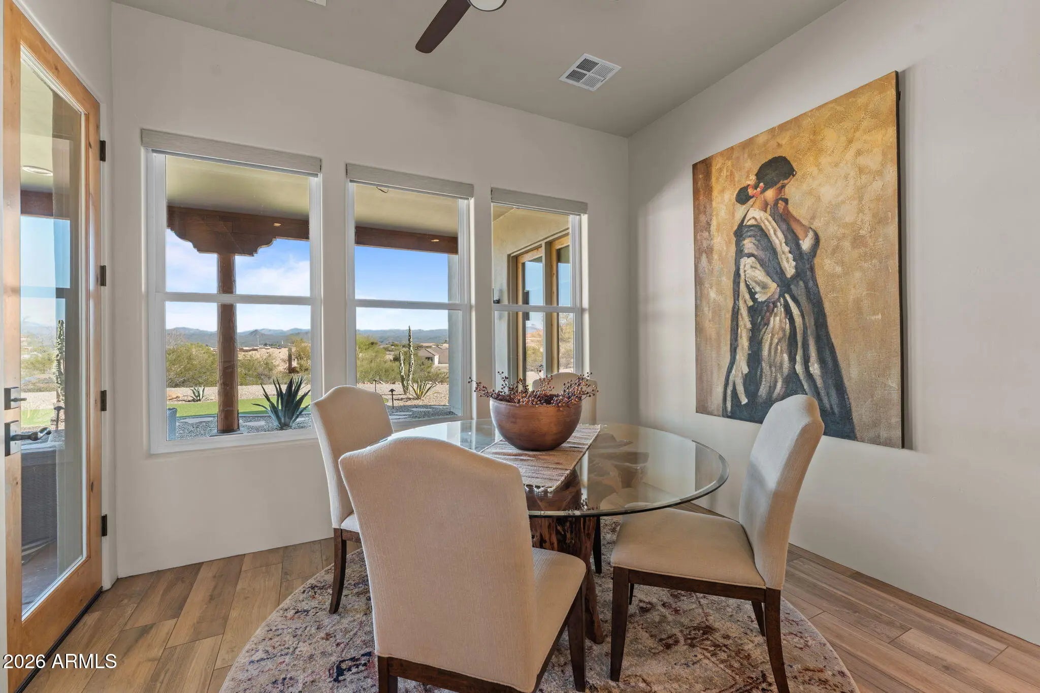 Exquisite one-owner custom Territorial-style home designed for the most discerning buyer. This stunning residence features a desirable split floor plan, wood-look tile flooring, and a cozy gas fireplace. Entertain in the formal dining room or enjoy the bright breakfast nook, highlighted by quartz countertops, breakfast bar, and gorgeous custom cabinetry. Solid wood doors throughout showcase exceptional craftsmanship. A spacious office with a large window offers the perfect work-from-home space. The primary suite is generous in size with private access to the full covered patio, while the luxurious primary bath boasts a fully tiled walk-in shower and separate soaking tub. Perfectly landscaped cul-de-sac lot with a long concrete driveway and breathtaking mountain views—truly exquisite!