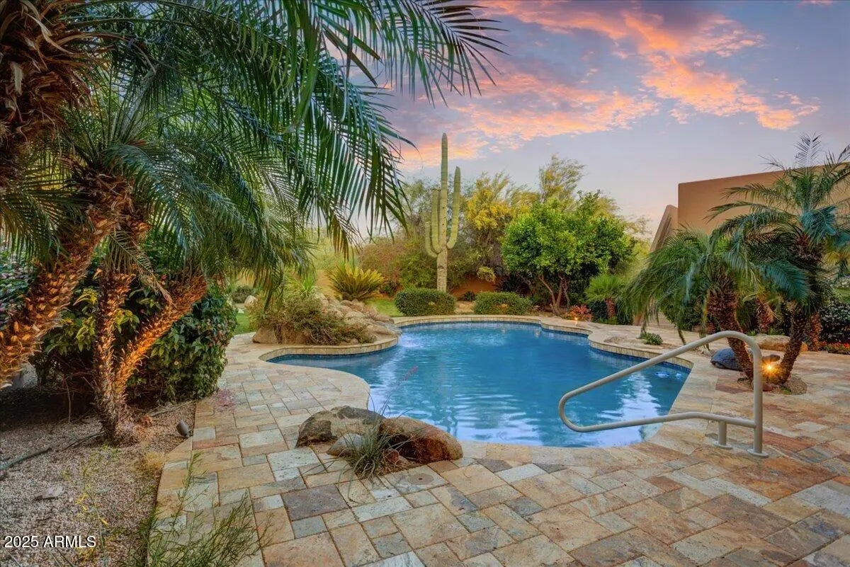 Custom home in North Scottsdale! Four bedroom, three bath home on a private ¾ acre cul-de-sac lot surrounded by NAOS (natural area open space) in the prestigious community of Happy Valley Ranch. The light & bright kitchen has plenty of cabinets, granite counters and S/S appliances. Enjoy entertaining or family gatherings in the expansive great room featuring fireplace, wet bar, dining area, and billiards space. The freshly painted oversized primary has a separate exit to the back patio and a large bathroom with dual sinks, a separate tub & shower, and walk-in closet. The split floor plan includes a guest bedroom en-suite. The backyard oasis is amazing with travertine decking, pebble sheen pool, huge tranquil rock waterfall, horseshoe pits, gigantic saguaros, and stunning mountain views.