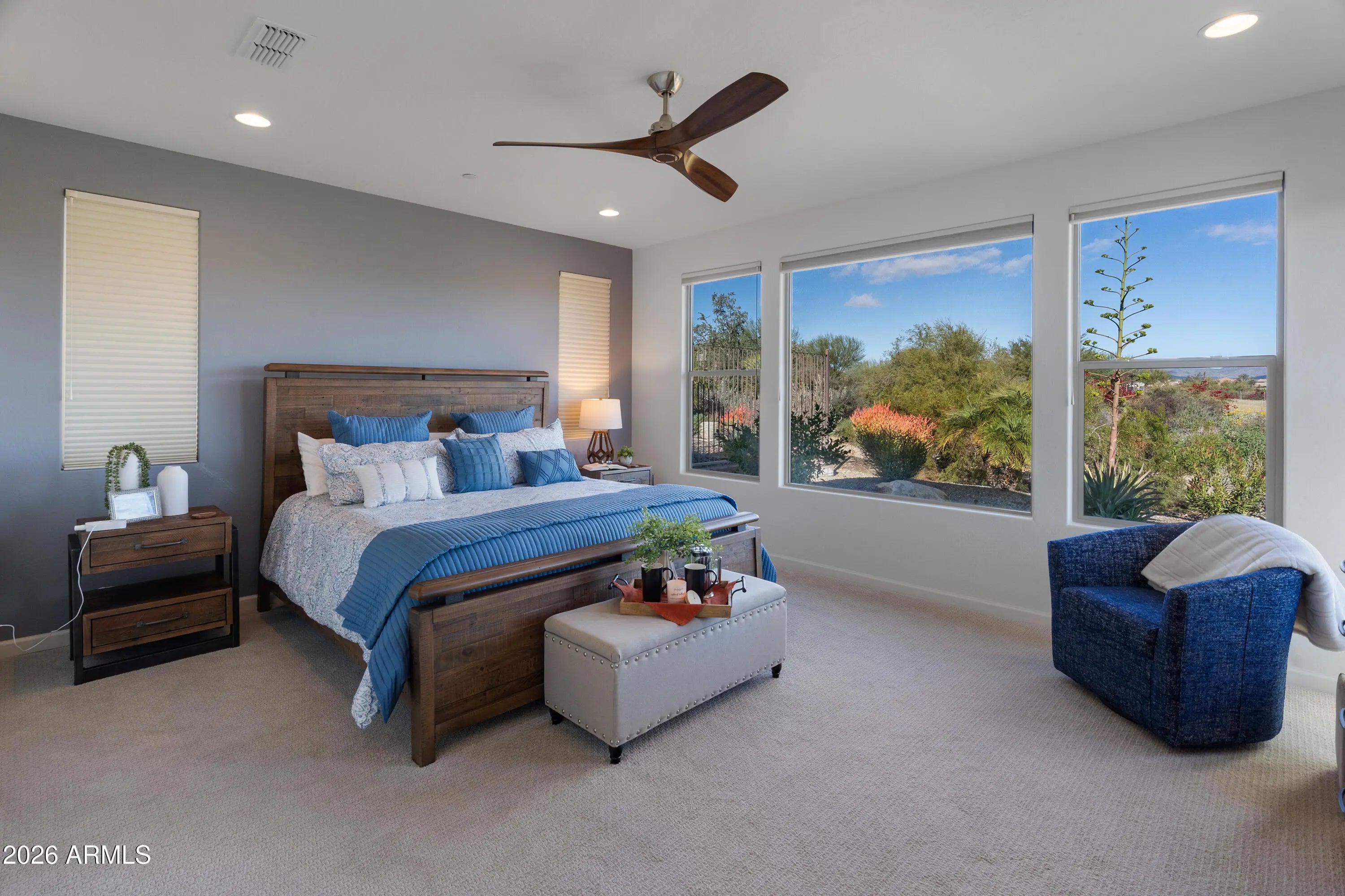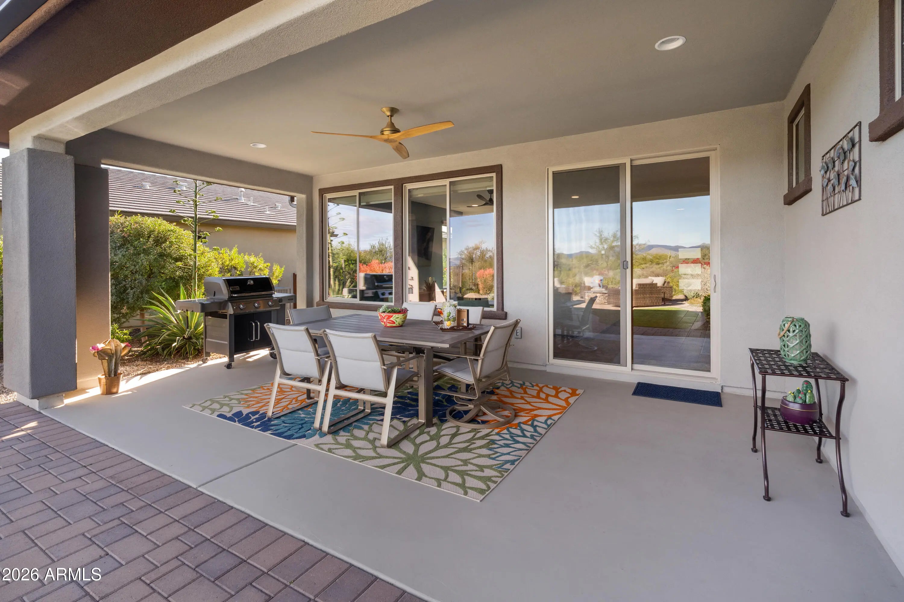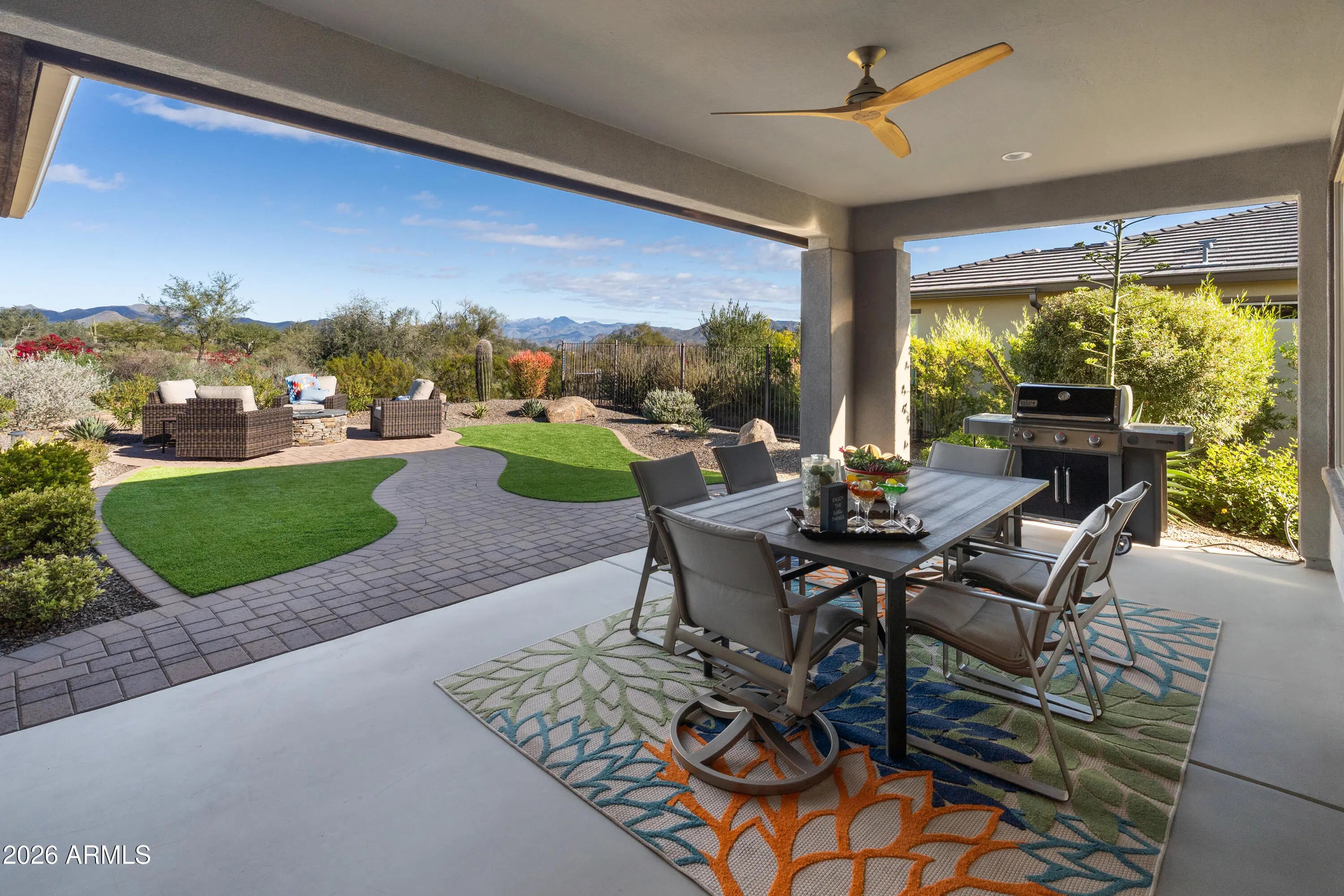 Wake up to PANORAMIC MOUNTAIN VIEWS that steal the show at this beautiful single level beauty. This light-filled open concept home offers 2 bedrooms + office, 2.5 baths. Walls of windows frame the desert and mountains, bringing the outdoors in from every angle. Outside, the gorgeously landscaped, low-maintenance yard with artificial turf & firepit means more time enjoying the view and less time working on it. Set inside the active adult community of Trilogy at Verde River, life here feels like a daily vacation. Championship golf, pickleball, gym, resort-style pools and spa, art classes, plus a full-service restaurant are all at your fingertips. This is more than a home. It's a lifestyle with a front-row seat to Arizona's mountains. Come see it before someone else claims the view.