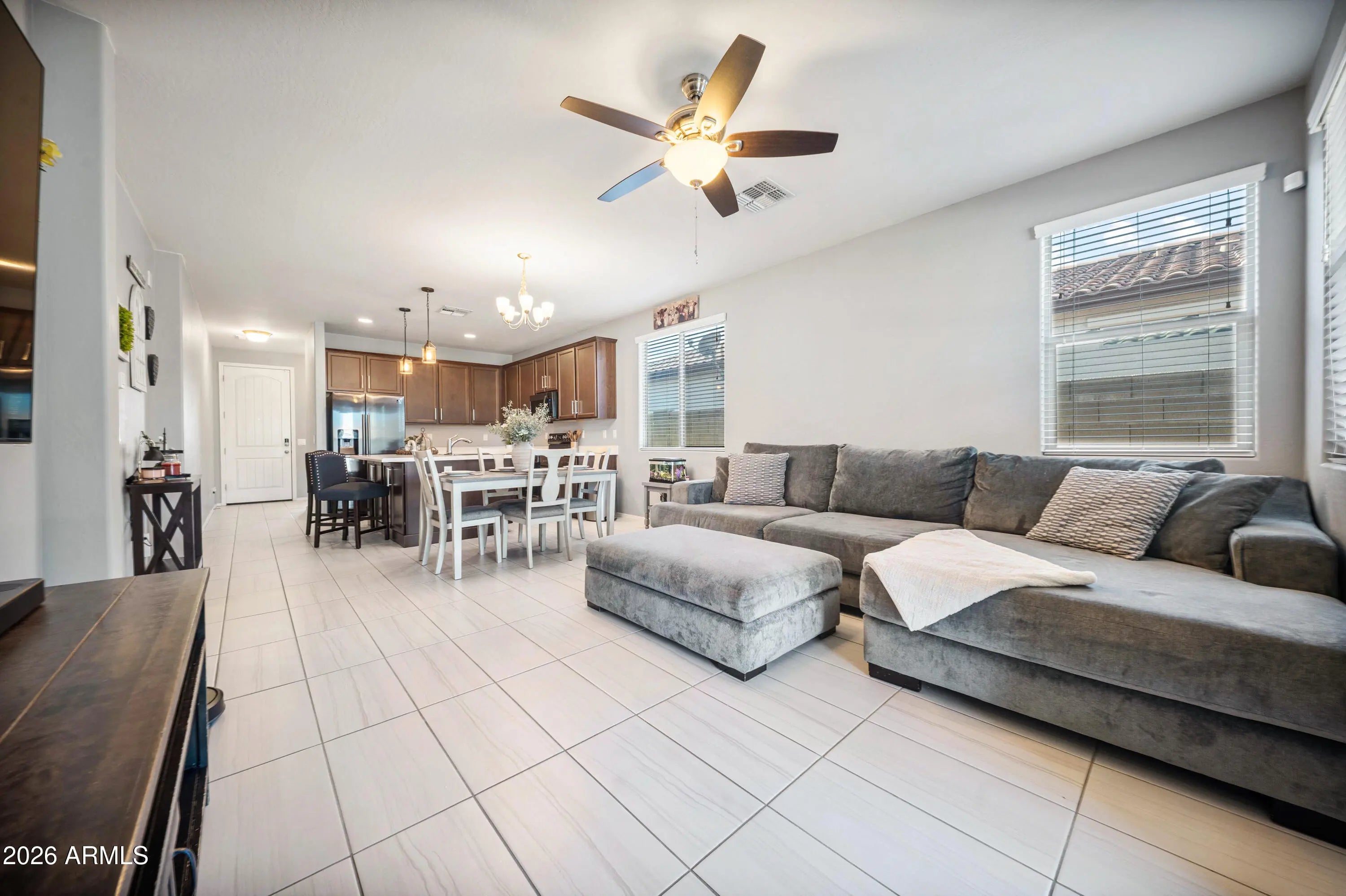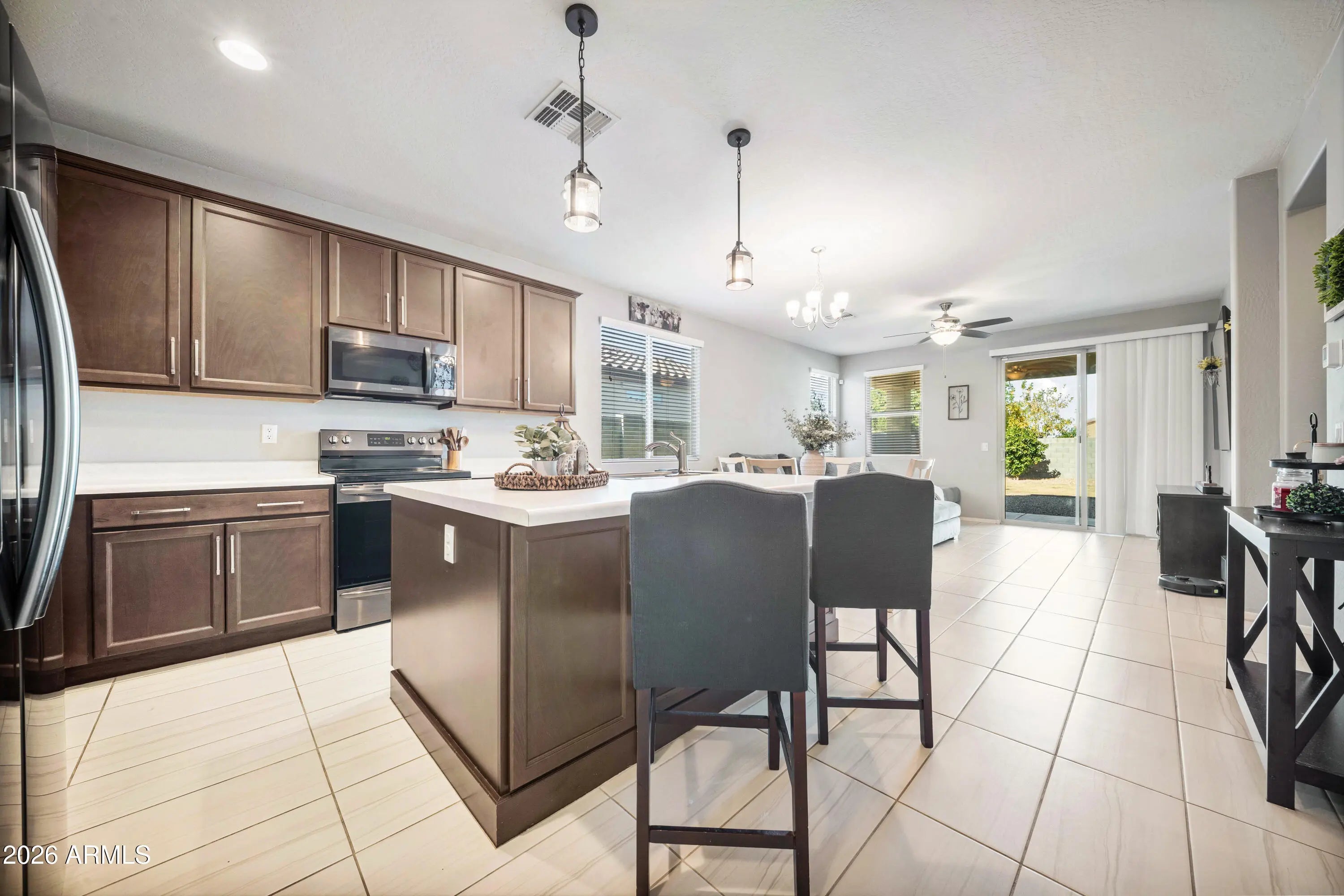 This is the one you've been waiting for! Beautiful 3 bedroom, 2 bath home featuring an ideal split floor plan with a bedroom and bath at the front and an open great room design. The kitchen shines with 42'' cabinets, a large island, and new 2025 upgrades including a farmhouse sink, dishwasher, and microwave, plus stainless steel appliances. Stunning tile floors, two-tone custom paint, ceiling fans, and 2-inch blinds throughout. Washer, dryer, and refrigerator included. Enjoy a landscaped backyard with grass area, fruit trees, and covered patio, perfect for entertaining and outdoor dining. The solar offers energy savings. PLUS the inspection has already been done. This home is move-in ready and ready for you, impeccably cared for. Don't miss it!.