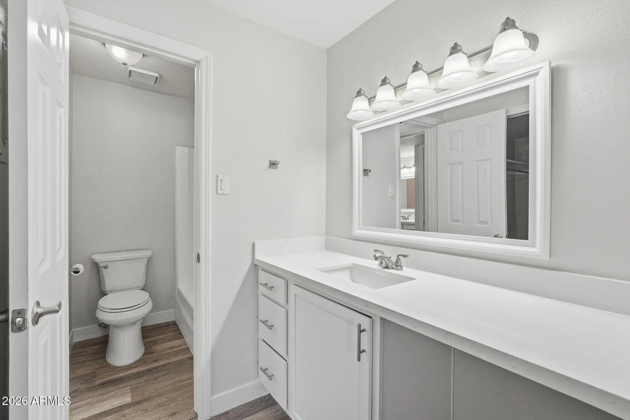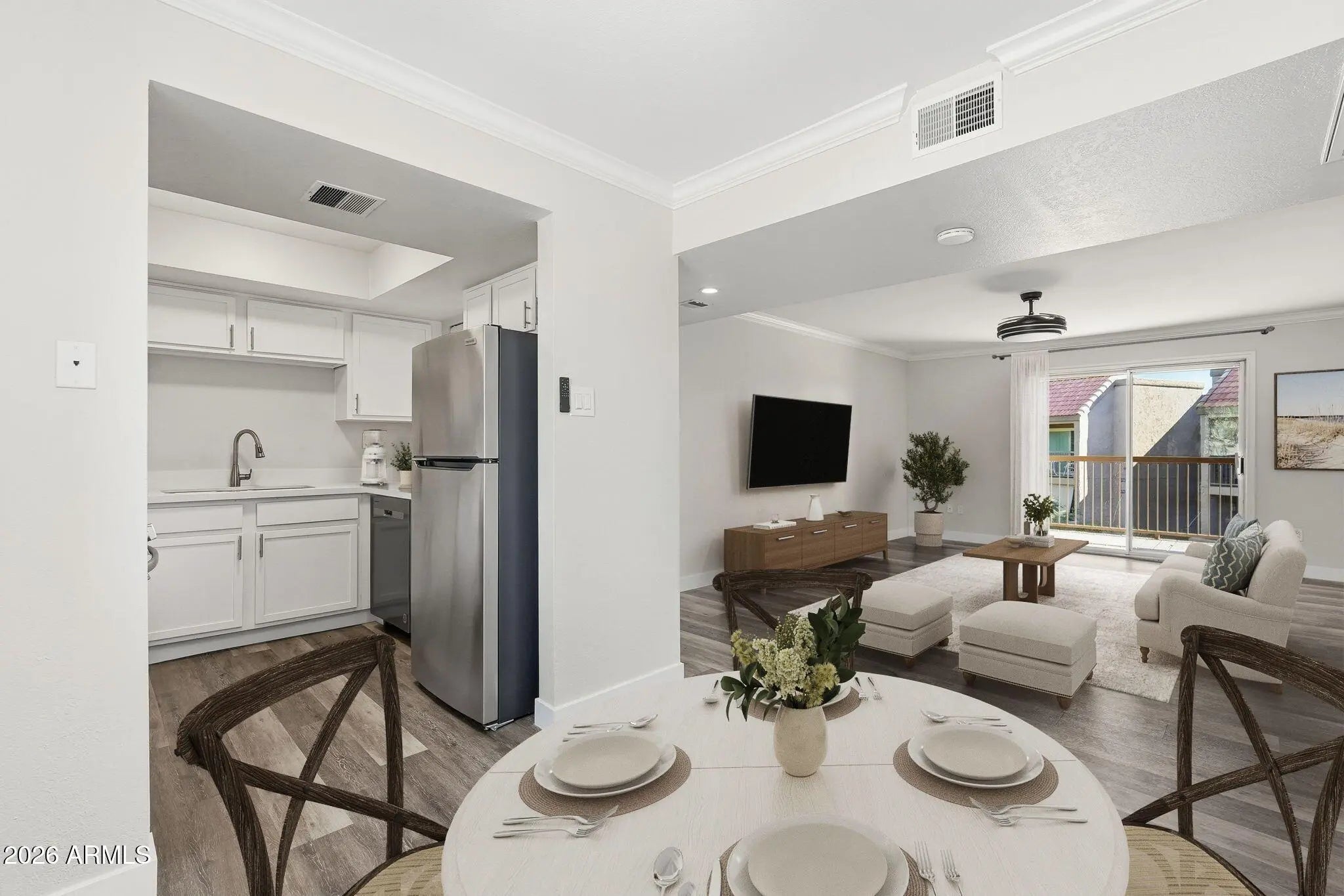 This immaculate condo has been expertly renovated with impeccable attention to detail. The luminous kitchen showcases sleek white cabinetry, gleaming white granite countertops, and premium stainless steel appliances, beautifully enhanced by contemporary LVP flooring throughout. Bathroom connects to both bedrooms for convenience and privacy. Experience seamless open-concept living flooded with natural light, plus your own tranquil private patio. Nestled in the coveted McCormick Ranch, you'll enjoy greenbelts, inviting resort-style pools, a well-equipped community center, and scenic walking and biking trails—all moments from vibrant shops, exceptional dining, and championship golf courses. With effortless access to Old Town Scottsdale, this property won't last long!