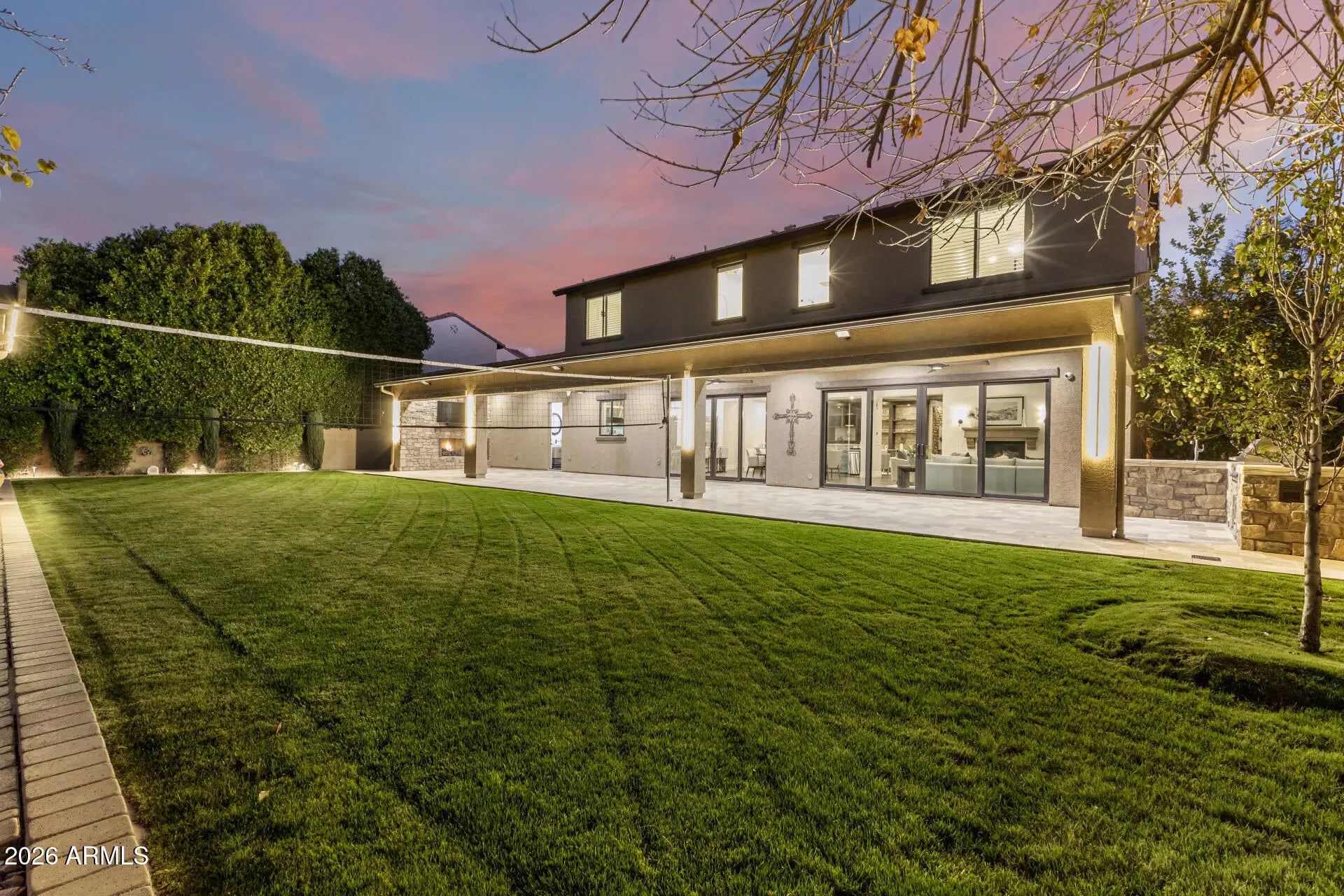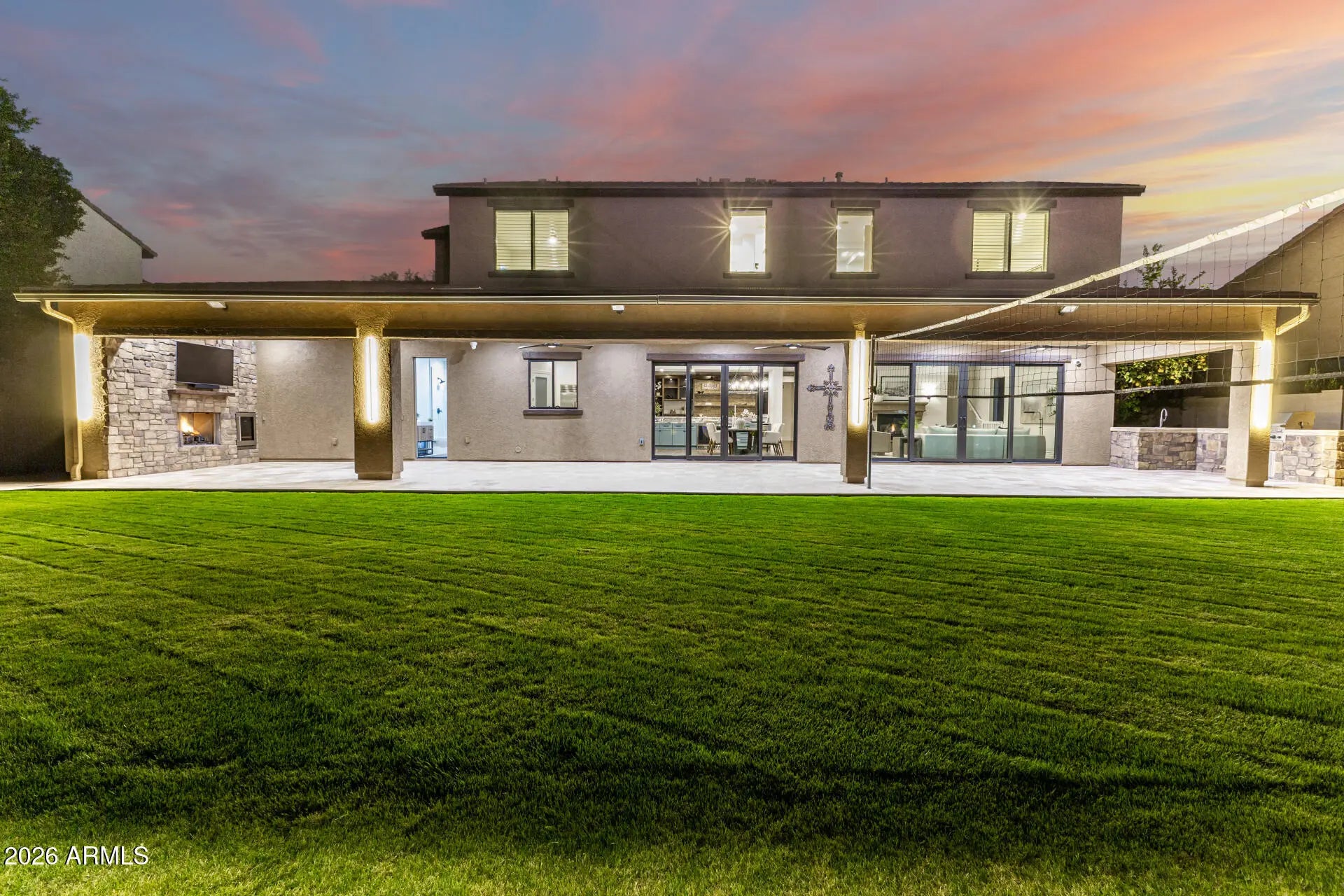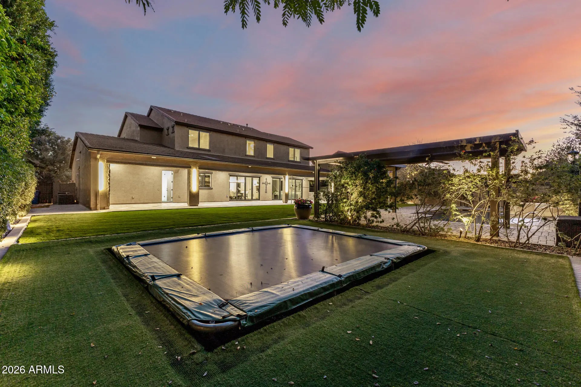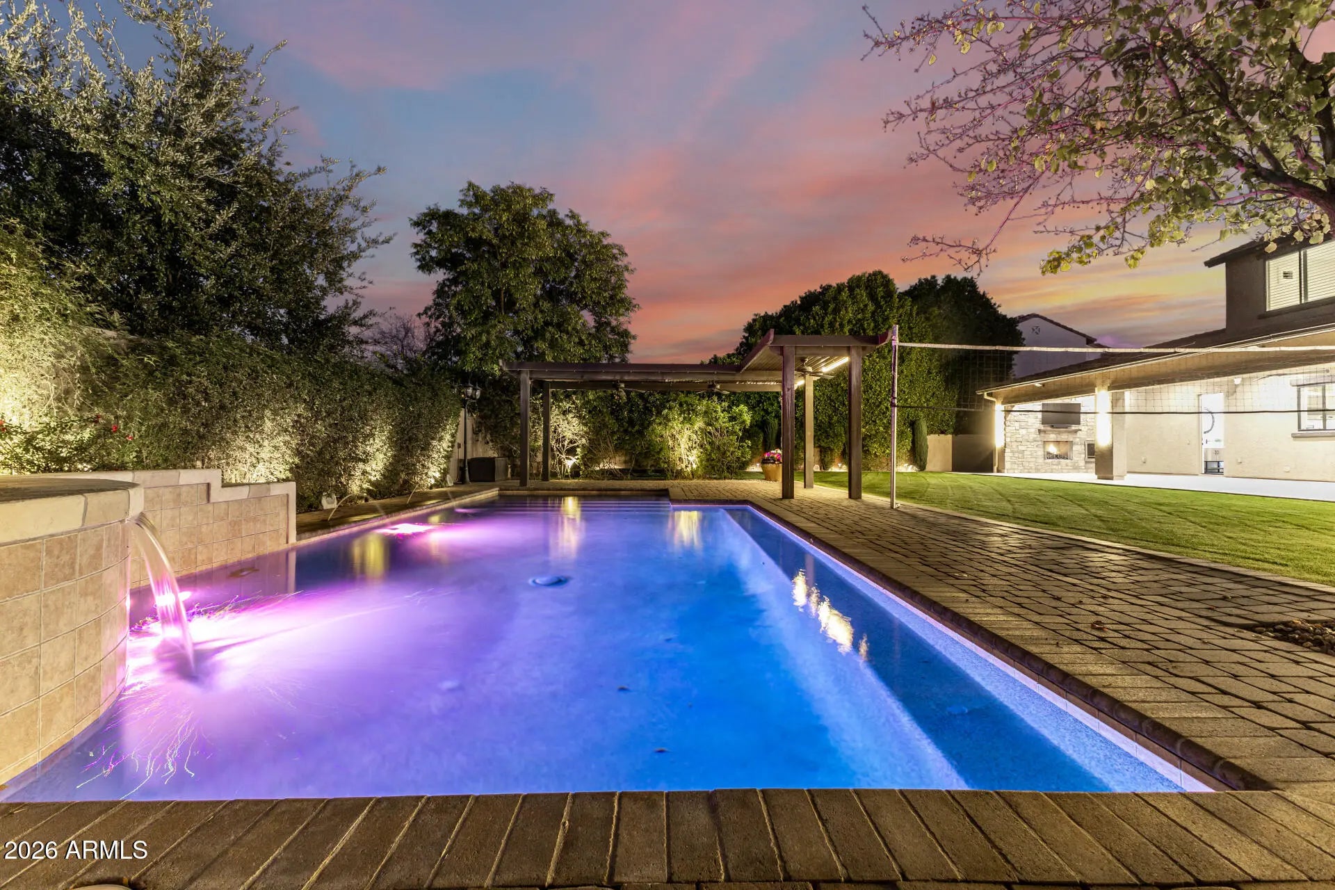 Experience unparalleled luxury with this exquisite estate, a 5-bedroom, 6-bathroom masterpiece boasting over $500,000 in high-end upgrades, perfectly positioned on an extremely private, north-facing lot within a quiet private cul-de-sac. This rare setting is further enhanced by a charming, storybook tree swing at the center of the cul-de-sac, creating a warm sense of community while preserving the privacy and exclusivity of the home. Thoughtfully designed to embody the ultimate Arizona lifestyle, this residence offers a seamless blend of elegance, comfort, and resort-style living. Upon entering the grand foyer, you are immediately captivated by the expansive open-concept design, highlighted by new flooring, designer finishes, and custom lighting that exude sophistication. The gourmet kitchen stands as the heart of the home, anchored by a massive waterfall-edge island, bespoke cabinetry, and top-of-the-line appliances... highlighted by an Italian-imported ILVE Nostalgie Series induction range. This iconic range blends timeless European-inspired design with cutting-edge technology, offering a safe, fast, and energy-efficient induction cooktop with precise temperature control. The sleek glass surface allows for effortless cleaning and increased cooking speed, while the residual heat indicator enhances safety by alerting when the surface remains warm. Designed with versatility in mind, the home features two dedicated dens. The downstairs den is ideal for a private home office or executive workspace, while the upstairs den serves as a perfect kids' playroom or teen retreat, complete with a built-in refrigerator for added convenience. For those who cherish hosting, the reimagined dining and entertaining lounge offers a seamless blend of modern elegance and functionality. Sliding doors open to a private courtyard, extending gatherings outdoors and creating an intimate setting around the fireplace beneath the starlit Arizona sky. Every detail has been meticulously curated, including brand-new Carrier AC units, fresh interior and exterior paint, custom blinds and shutters, and updated door hardware throughout. The expanded four-car garage offers ample space for vehicles, storage, and lifestyle needs. The backyard is a true private retreat. A huge covered patio spanning the length of the home features a cozy outdoor fireplace, built-in grill, beverage fridge, and pre-wiring for heaters... creating an exceptional year-round entertaining space. The resort-style pool showcases sheer descents, elegant fountains, and a spacious Baja step, perfect for lounging, sunbathing, or safe play, while adding to the tranquil, resort-like ambiance. A shaded ramada provides a peaceful escape for lounging or dining al fresco, and a private poolside bathroom with a full shower offers unmatched convenience. The expansive grassy yard is thoughtfully designed for recreation and relaxation, currently set up with a removable volleyballnet, ample space for playing catch, tag, or football, and a built-in, in-ground trampoline that blends seamlessly into the landscape... offering fun and activity without compromising the elevated aesthetic of the space. This is more than a home... it's a lifestyle. A rare opportunity to enjoy privacy, elegance, and meaningful community moments... all within one extraordinary property. Homes of this caliber are seldom available... don't miss your chance to make this one yours.