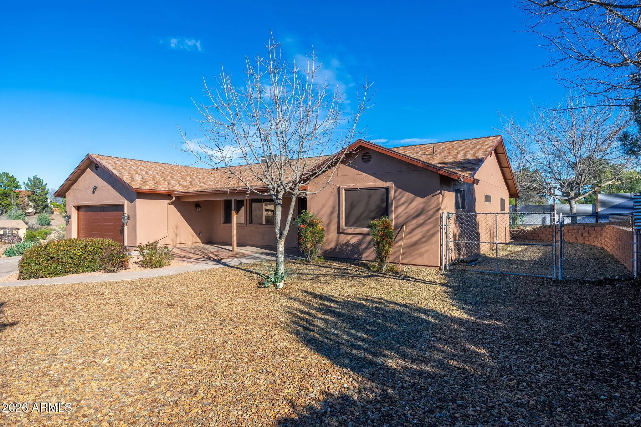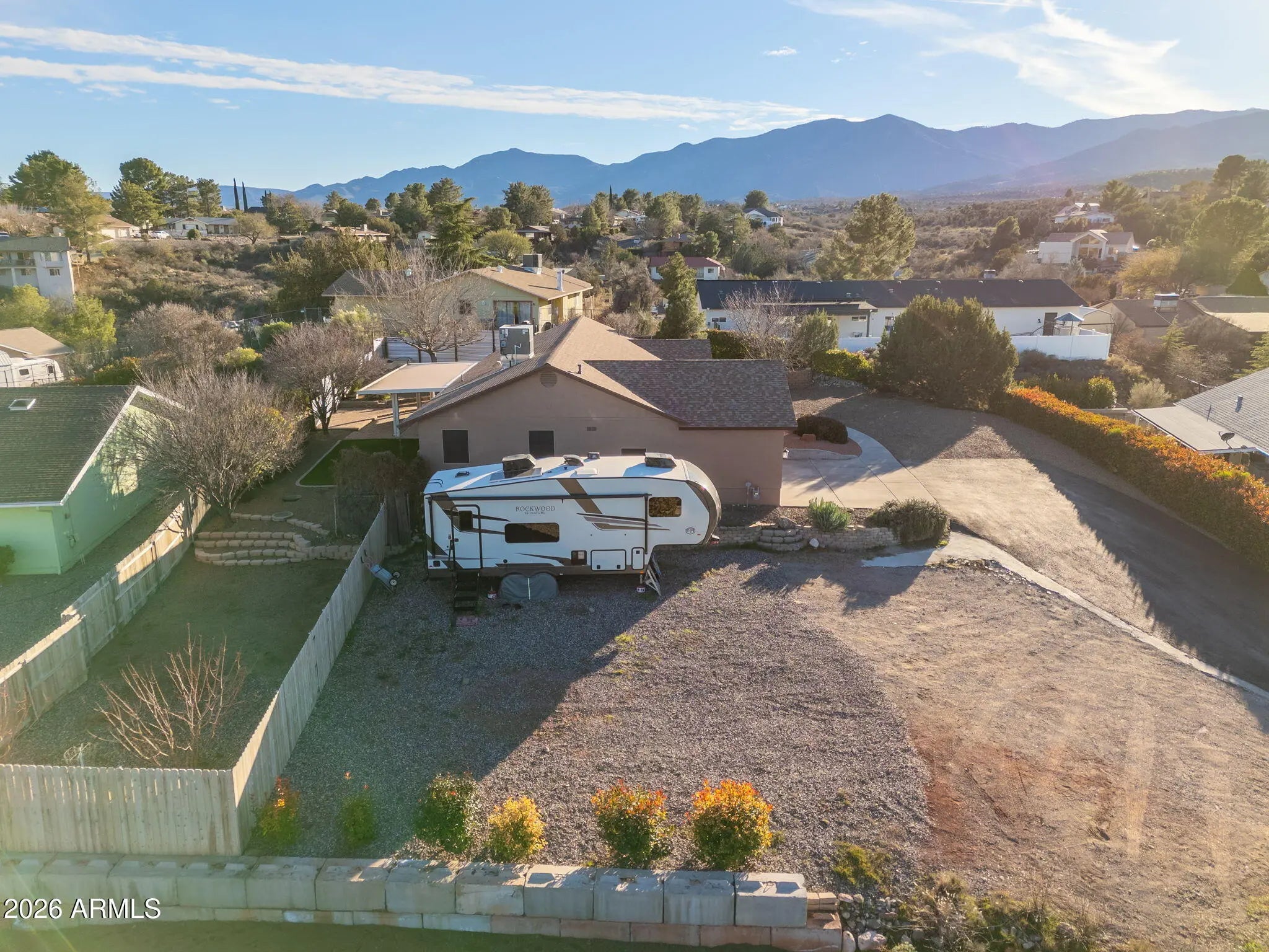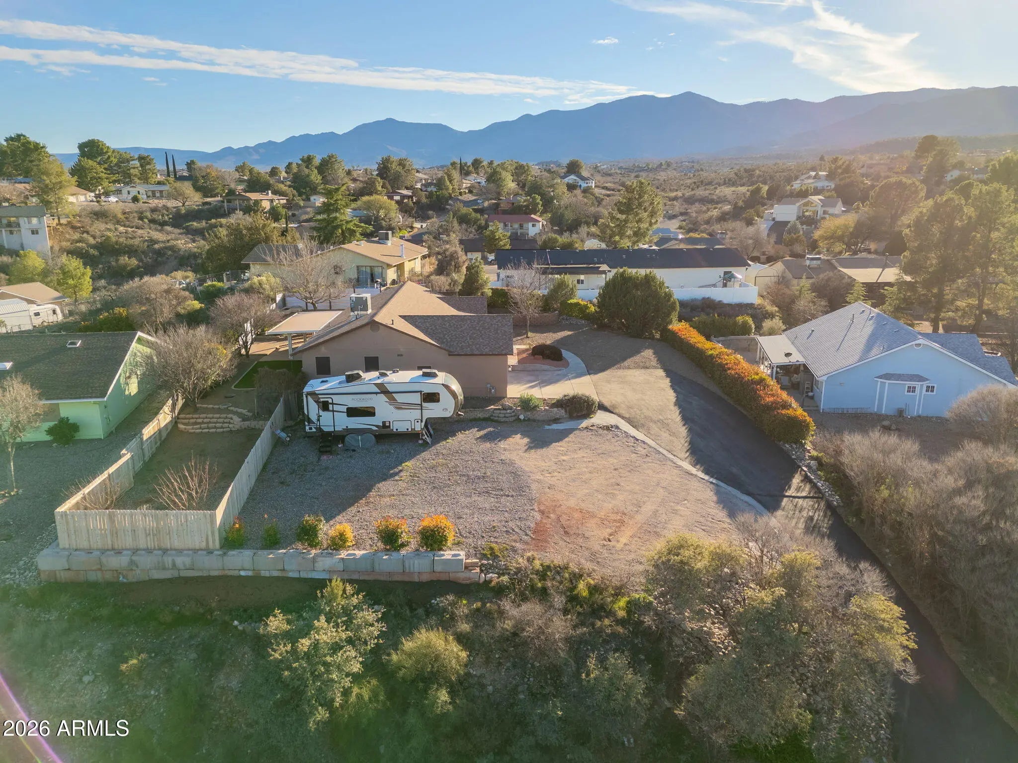 Pride of ownership is immediately felt in this thoughtfully cared-for Cottonwood home, cherished for its unique positioning, privacy, and setting. Tucked back with intentional landscaping and privacy screening, the property offers a rare sense of seclusion, enhanced by a fully timed drip irrigation system that supports lush gardens and mature plantings throughout the grounds. As spring arrives, the home truly comes alive with blooming fruit trees—two apricots and a peach—along with stunning oak trees lining the drive, creating a welcoming and serene approach. The exterior has been freshly painted, the roof and HVAC system are both only a few years old, and the driveway has been meticulously maintained year after year. Inside, the split-bedroom floor plan centers around a spacious great room, offering both comfort and functionality. The owners have continuously invested in the home with care and intention, including improvements to the kitchen, primary bathroom, and flooring throughout, along with new flooring in two bedrooms. The oversized two-car garage stands out with extra height and depth on one side, ideal for storage, projects, or larger vehicles. Electrical upgrades provide exceptional versatility, including multiple 220-volt outlets and 50-amp hookups. The outdoor space is equally impressive, offering abundant room for RV parking with hookups, additional trailers, and recreational toys, with an improved RV pad allowing for even more parking flexibility. The backyard is designed for entertaining and relaxation, featuring a covered patio with 220-volt electrical already in place for a hot tub. Fire-wise planning and thoughtfully selected plantings provide privacy while respecting neighboring properties. Enjoy red rock views from the backyard and Mingus Mountain views from the front, all wrapped in a property that has been lovingly maintained, carefully improved, and truly treasured. Seller is a licensed agent in the state of Arizona