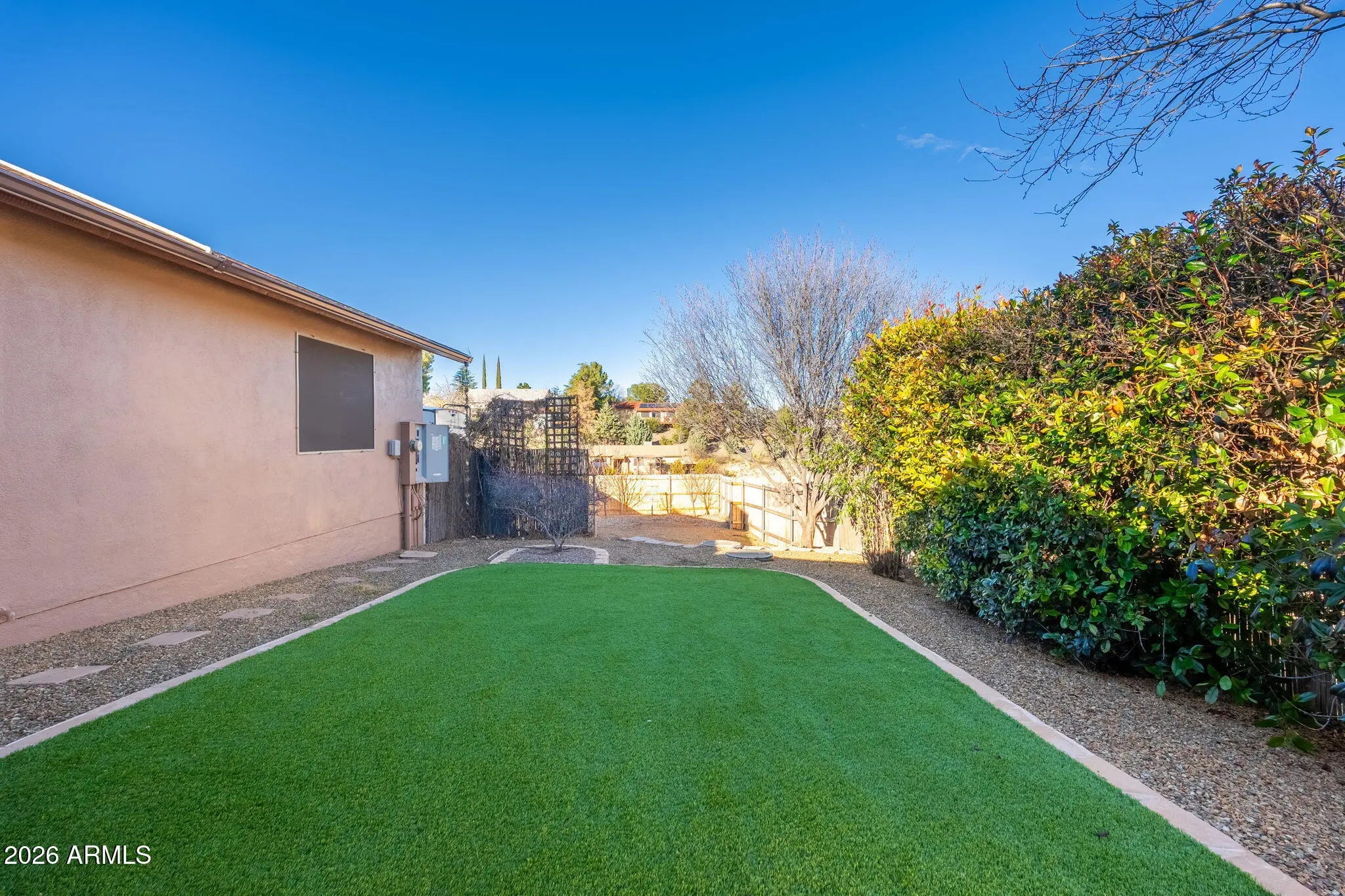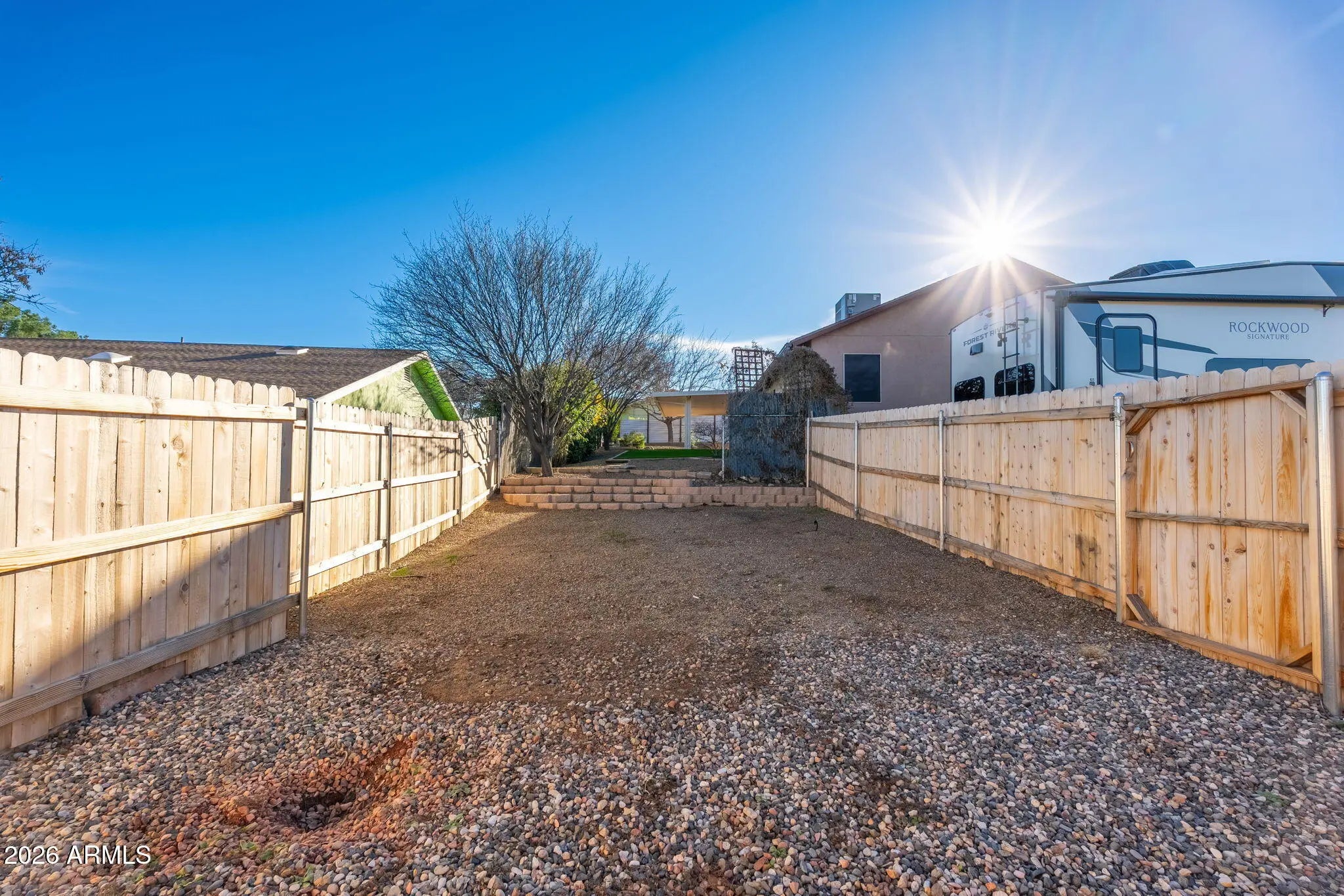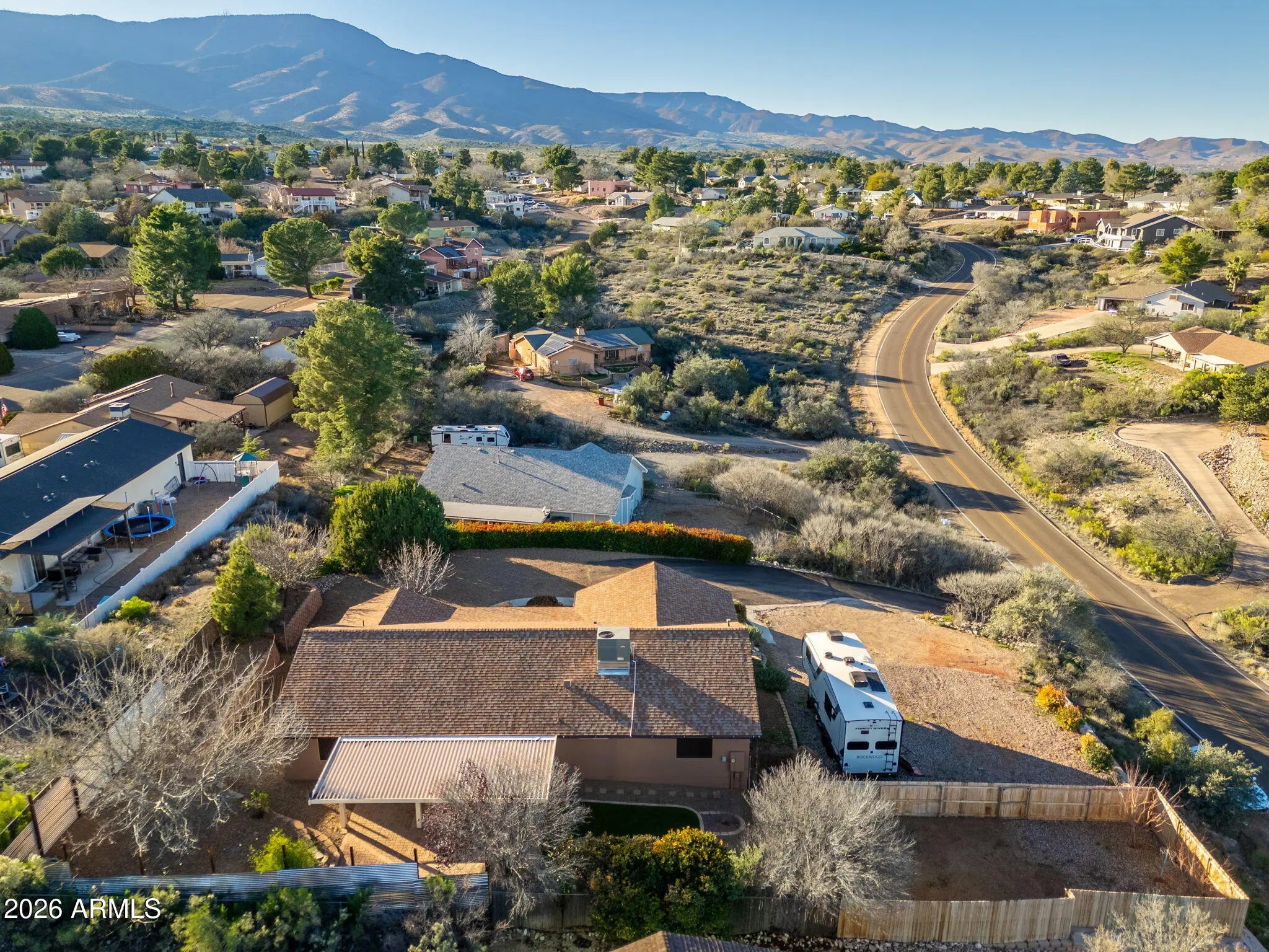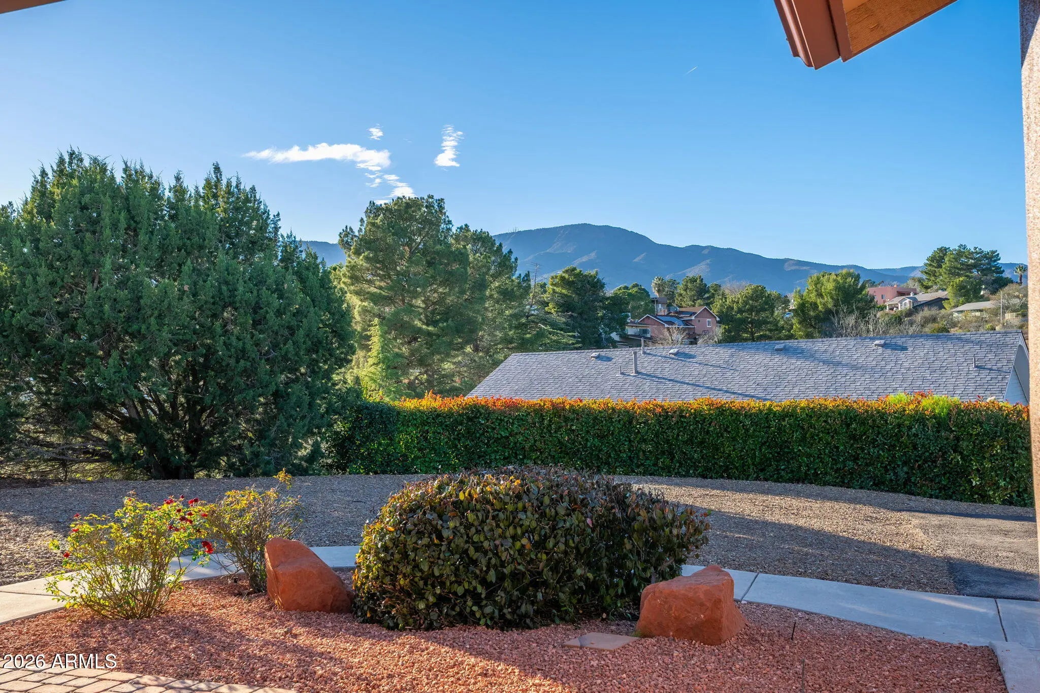 Pride of ownership is immediately felt in this thoughtfully cared-for Cottonwood home, cherished for its unique positioning, privacy, and setting. Tucked back with intentional landscaping and privacy screening, the property offers a rare sense of seclusion, enhanced by a fully timed drip irrigation system that supports lush gardens and mature plantings throughout the grounds. As spring arrives, the home truly comes alive with blooming fruit trees—two apricots and a peach—along with stunning oak trees lining the drive, creating a welcoming and serene approach. The exterior has been freshly painted, the roof and HVAC system are both only a few years old, and the driveway has been meticulously maintained year after year. Inside, the split-bedroom floor plan centers around a spacious great room, offering both comfort and functionality. The owners have continuously invested in the home with care and intention, including improvements to the kitchen, primary bathroom, and flooring throughout, along with new flooring in two bedrooms. The oversized two-car garage stands out with extra height and depth on one side, ideal for storage, projects, or larger vehicles. Electrical upgrades provide exceptional versatility, including multiple 220-volt outlets and 50-amp hookups. The outdoor space is equally impressive, offering abundant room for RV parking with hookups, additional trailers, and recreational toys, with an improved RV pad allowing for even more parking flexibility. The backyard is designed for entertaining and relaxation, featuring a covered patio with 220-volt electrical already in place for a hot tub. Fire-wise planning and thoughtfully selected plantings provide privacy while respecting neighboring properties. Enjoy red rock views from the backyard and Mingus Mountain views from the front, all wrapped in a property that has been lovingly maintained, carefully improved, and truly treasured. Seller is a licensed agent in the state of Arizona