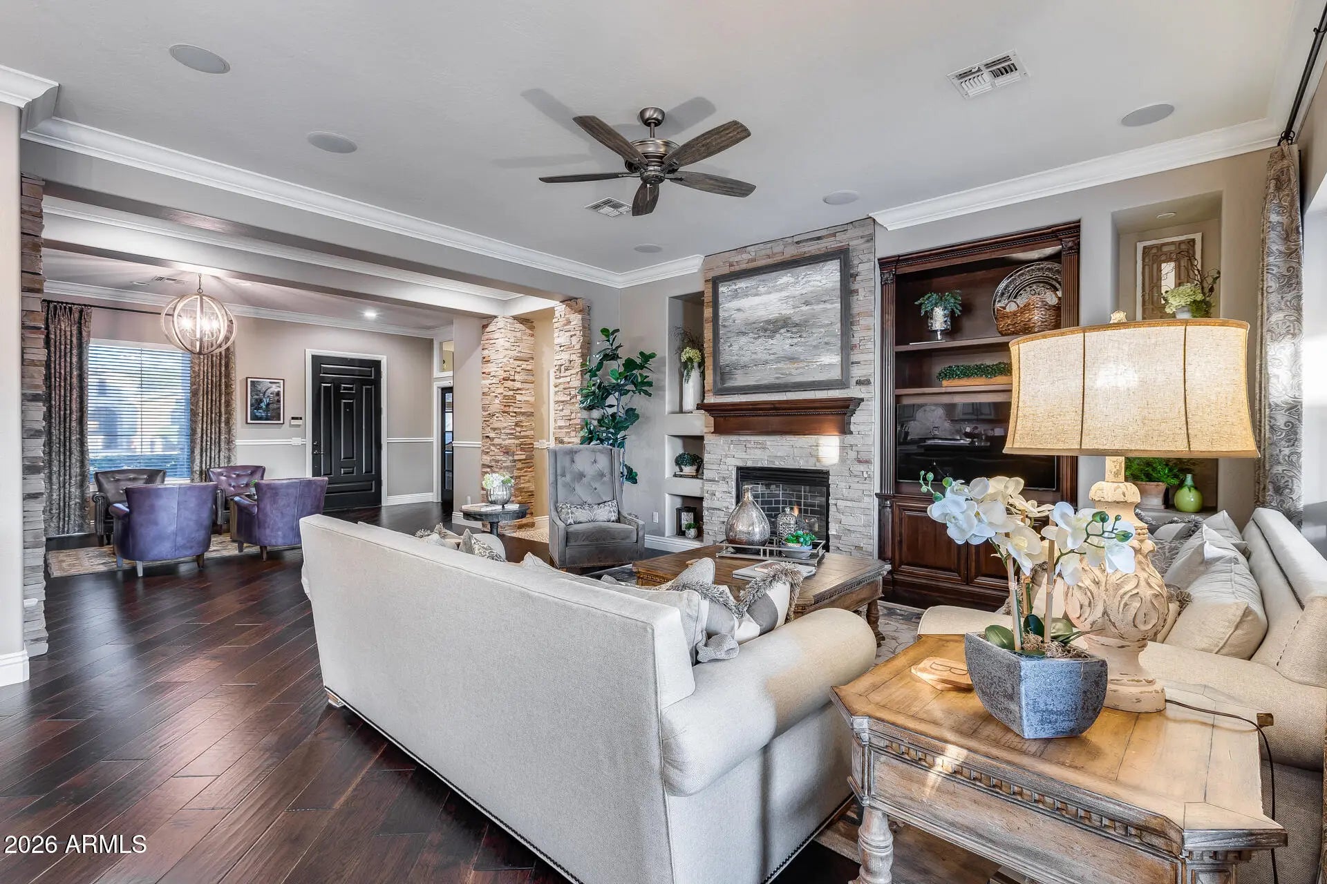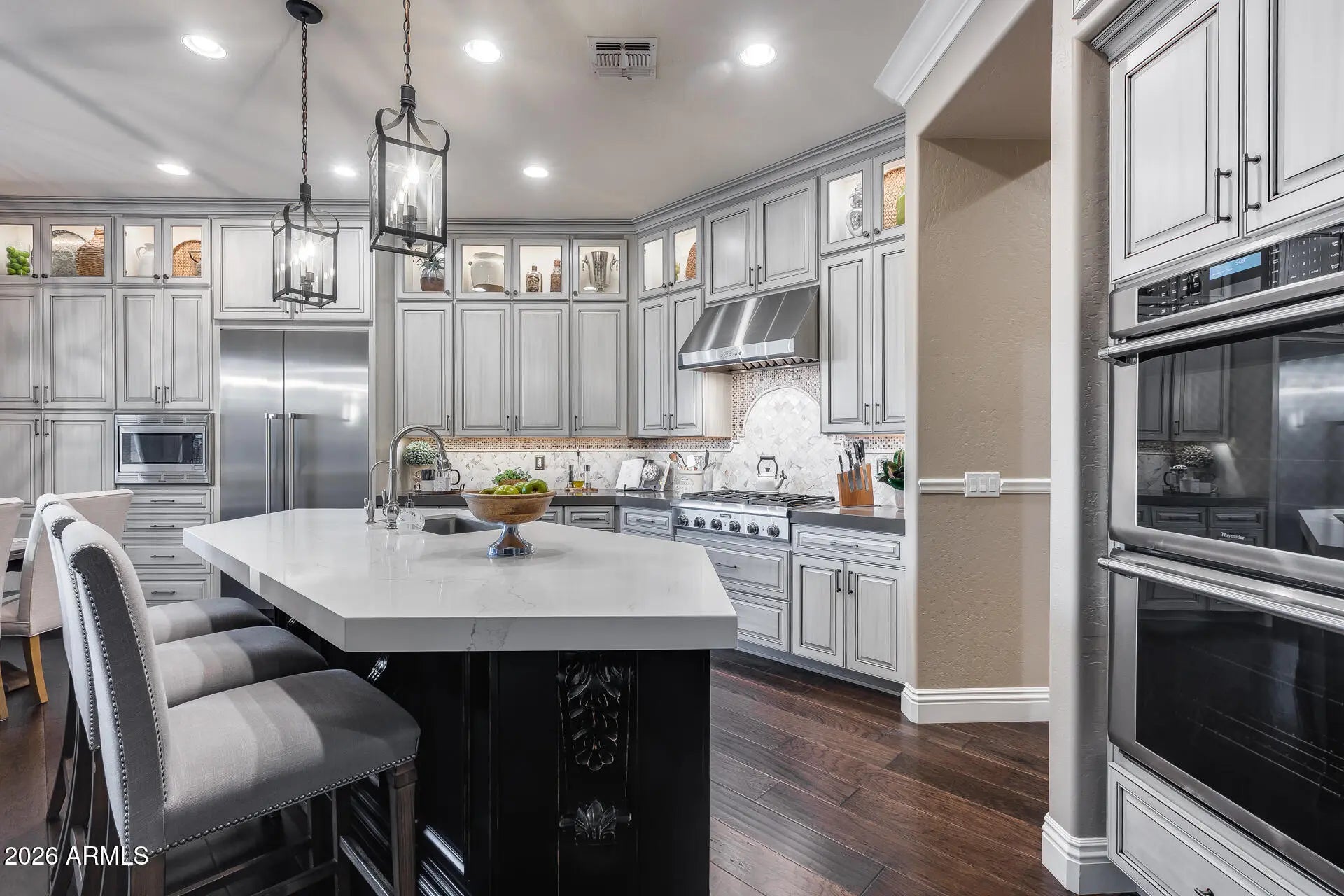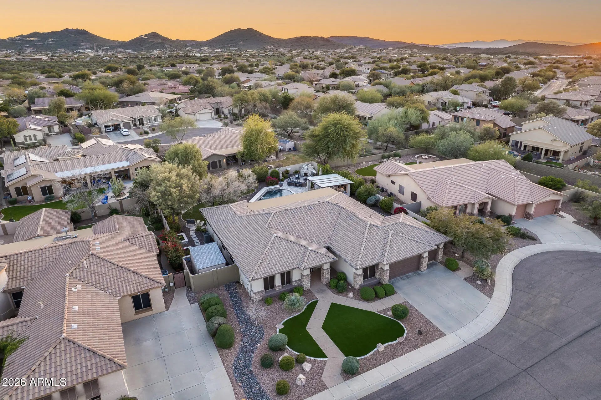 Resort-style living in the heart of Anthem. This beautifully upgraded home features custom built-in cabinetry throughout the office, wine room, and laundry (with dedicated refrigerator space), all with soft-close construction. The chef's kitchen is a standout, offering a built-in Thermador refrigerator, full Thermador appliance package, real wood dovetail drawers, full lower-drawer configuration, and premium finishes. Custom closets are included in the primary suite and secondary bedrooms. Additional upgrades include a whole-home reverse-osmosis water filtration system and a tankless water heater with recirculation pump. Front yard was remodeled in Dec of 2022 with new drip system installed. Garage is fully insulated and added radiant barrier in attic ceiling to help with heat. Surround sound in living room, media room and speakers throughout the house and backyard. The finished garage was completed in 2025 and showcase epoxy flooring, a modern HandyWall organization system floor to ceiling on all walls with high-quality cabinetry. Step outside to your private backyard oasis featuring a sparkling pool, covered patio, gazebo, raised garden beds, and a large storage shed on a concrete slab. Entertain with ease using the natural gas fireplace, Alpha pizza oven, and high-end Lynx infrared grill, all while enjoying subtle mountain views. Located on a quiet cul-de-sac surrounded by single-story homes on oversized lots (approximately one-third acre), this property offers exceptional privacy and space. Residents enjoy access to Anthem's top-rated amenities, including a community center with water park and dive pool, private main park with splash pads, playgrounds, sports fields, and miles of walking, hiking, and mountain biking trails. A rare opportunity that blends luxury upgrades, indoor-outdoor living, and an unbeatable Anthem lifestyle.