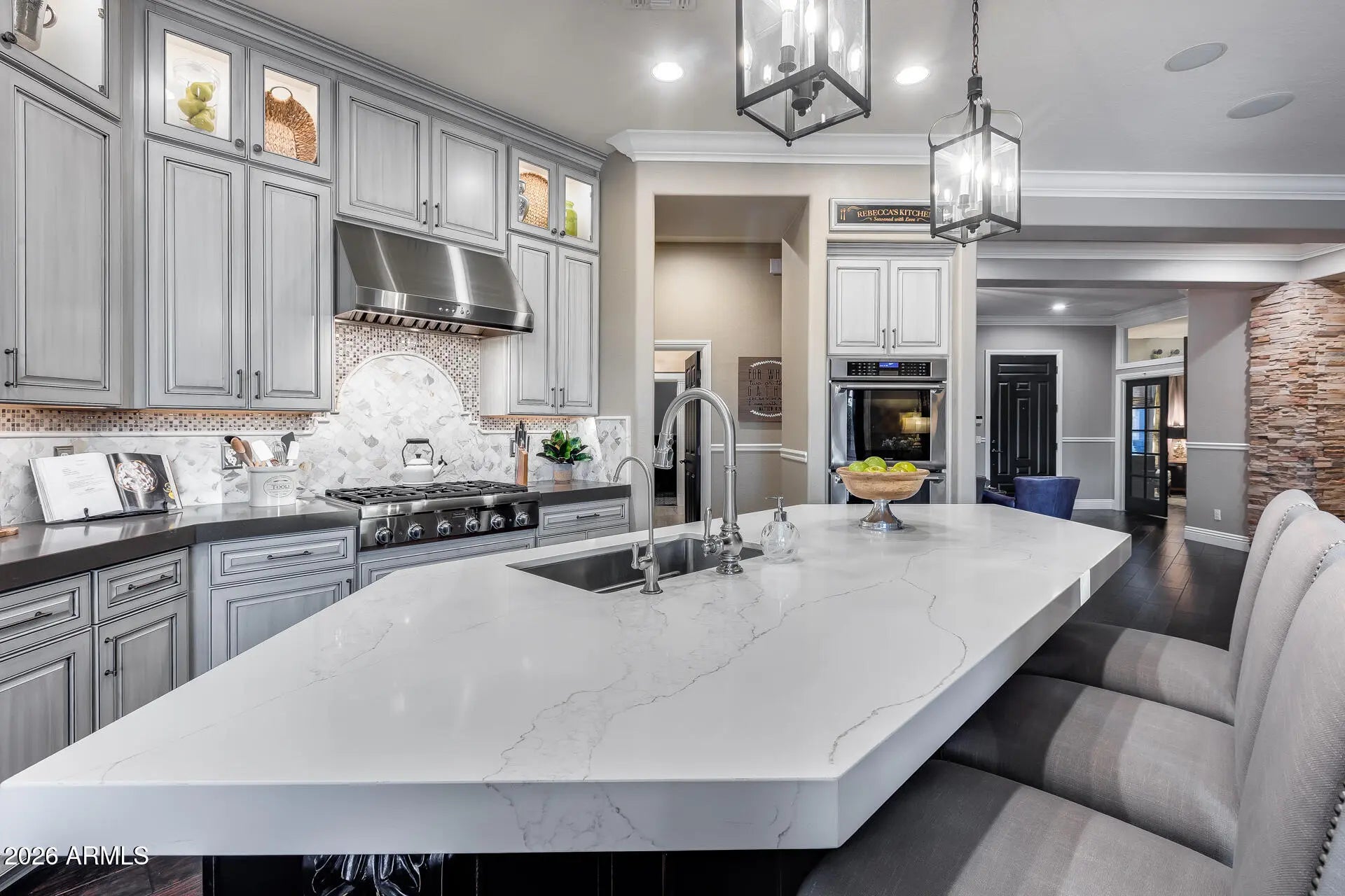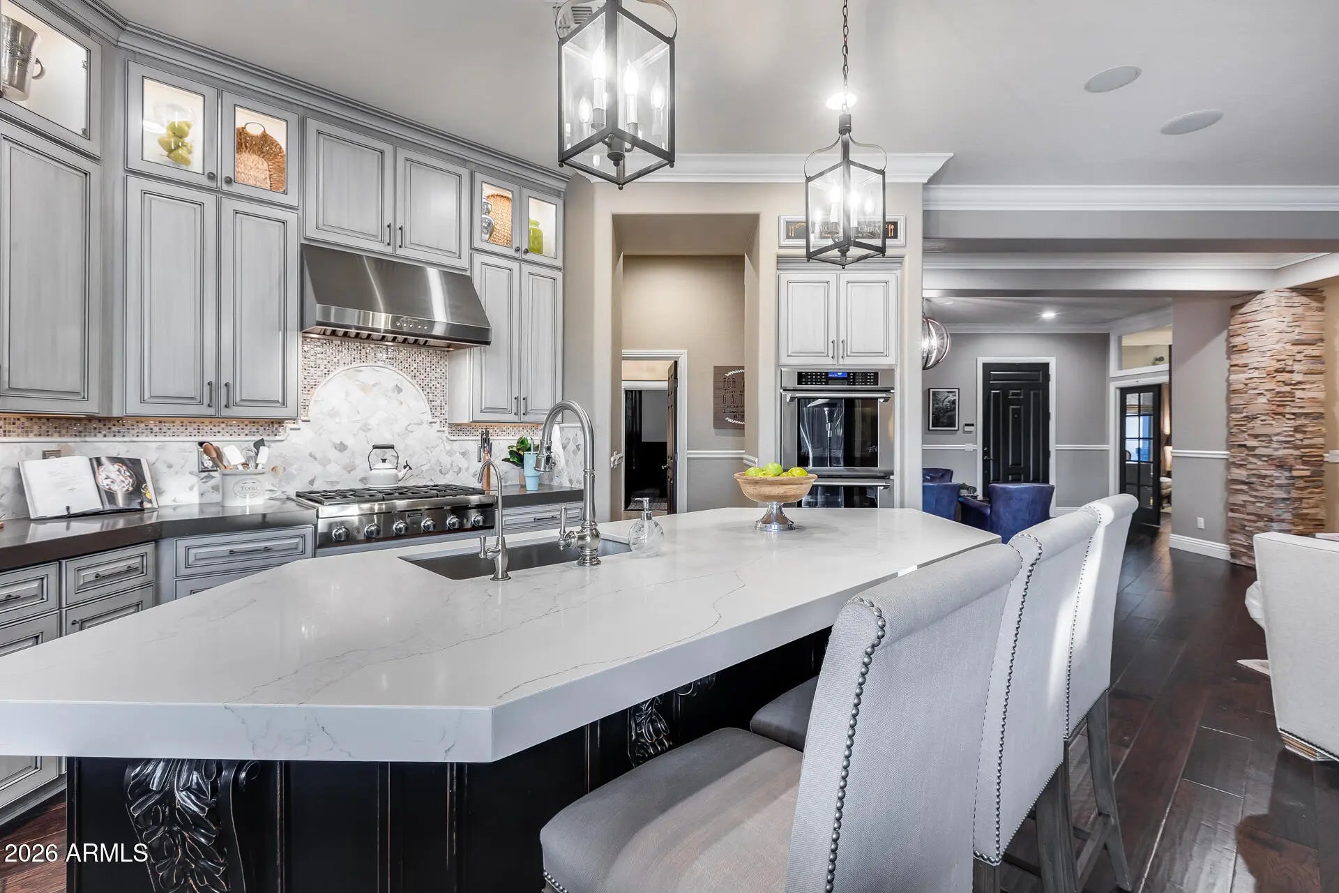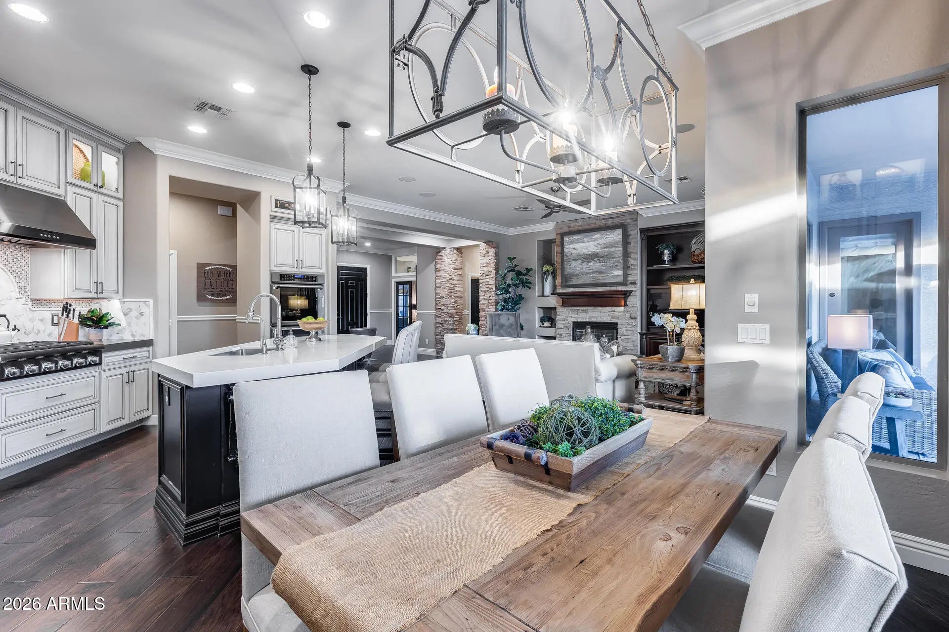 Resort-style living in the heart of Anthem. This beautifully upgraded home features custom built-in cabinetry throughout the office, wine room, and laundry (with dedicated refrigerator space), all with soft-close construction. The chef's kitchen is a standout, offering a built-in Thermador refrigerator, full Thermador appliance package, real wood dovetail drawers, full lower-drawer configuration, and premium finishes. Custom closets are included in the primary suite and secondary bedrooms. Additional upgrades include a whole-home reverse-osmosis water filtration system and a tankless water heater with recirculation pump. Front yard was remodeled in Dec of 2022 with new drip system installed. Garage is fully insulated and added radiant barrier in attic ceiling to help with heat. Surround sound in living room, media room and speakers throughout the house and backyard. The finished garage was completed in 2025 and showcase epoxy flooring, a modern HandyWall organization system floor to ceiling on all walls with high-quality cabinetry. Step outside to your private backyard oasis featuring a sparkling pool, covered patio, gazebo, raised garden beds, and a large storage shed on a concrete slab. Entertain with ease using the natural gas fireplace, Alpha pizza oven, and high-end Lynx infrared grill, all while enjoying subtle mountain views. Located on a quiet cul-de-sac surrounded by single-story homes on oversized lots (approximately one-third acre), this property offers exceptional privacy and space. Residents enjoy access to Anthem's top-rated amenities, including a community center with water park and dive pool, private main park with splash pads, playgrounds, sports fields, and miles of walking, hiking, and mountain biking trails. A rare opportunity that blends luxury upgrades, indoor-outdoor living, and an unbeatable Anthem lifestyle.