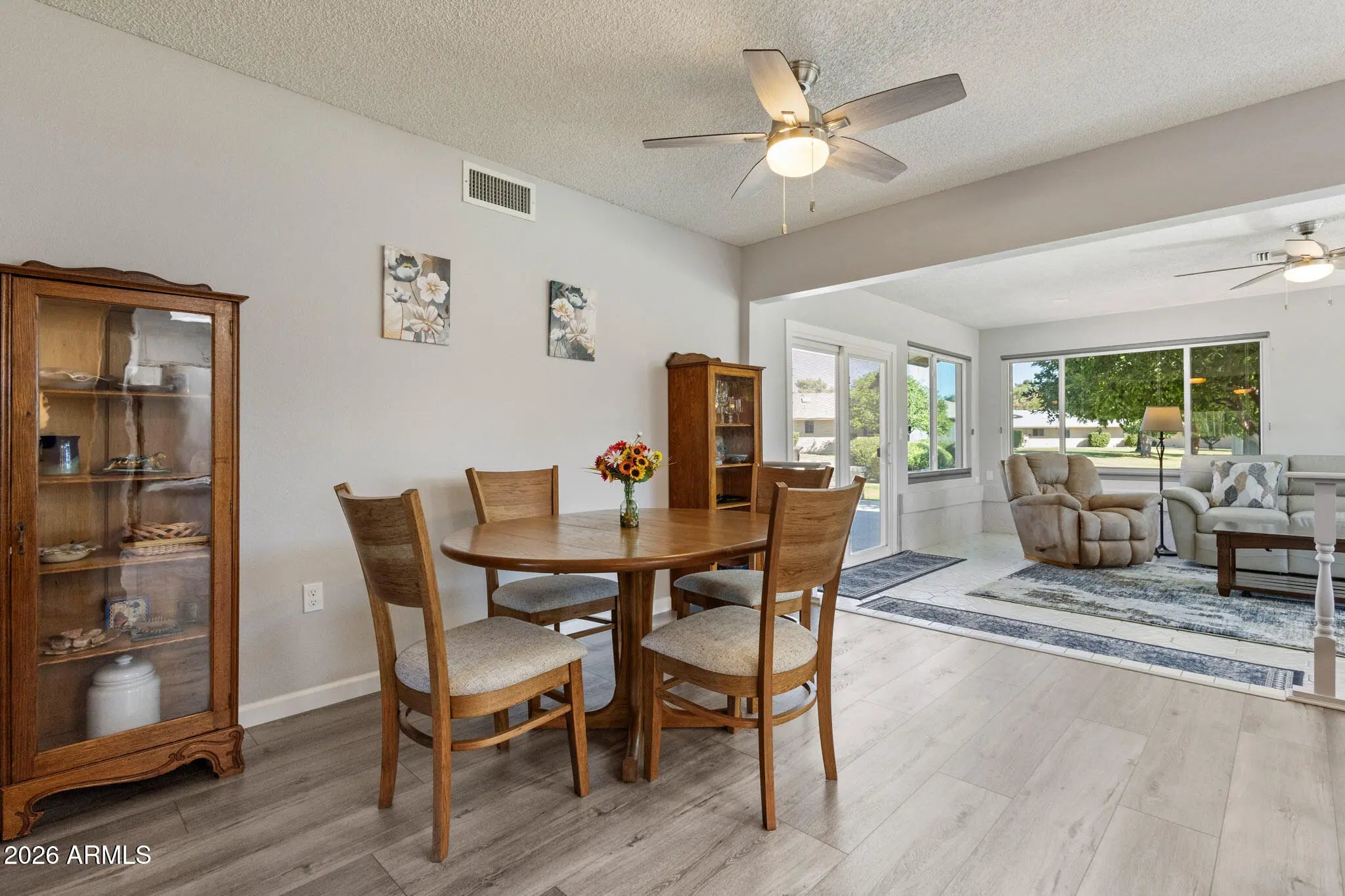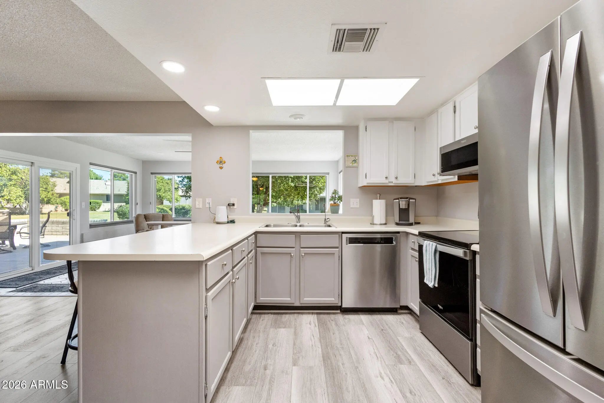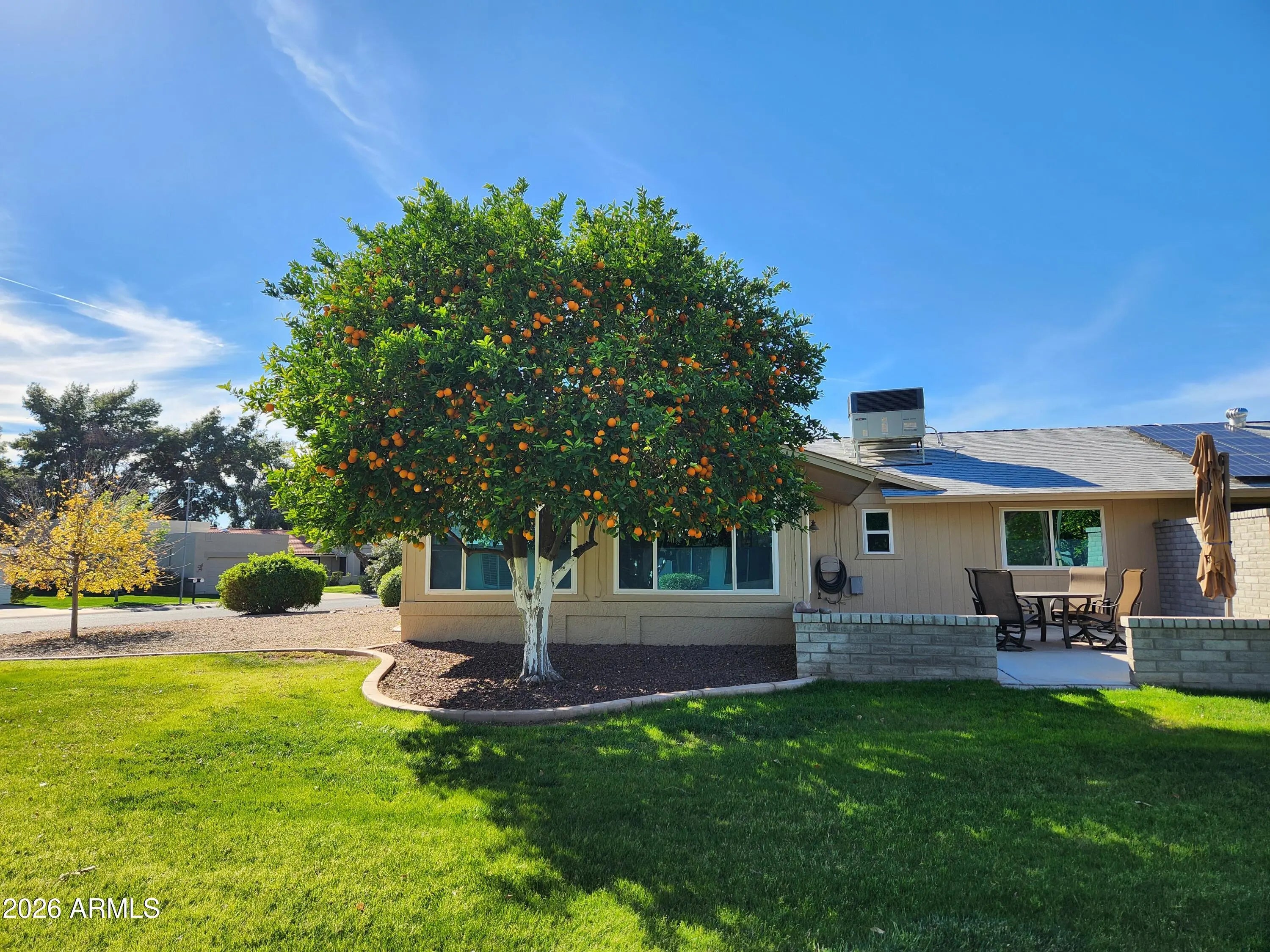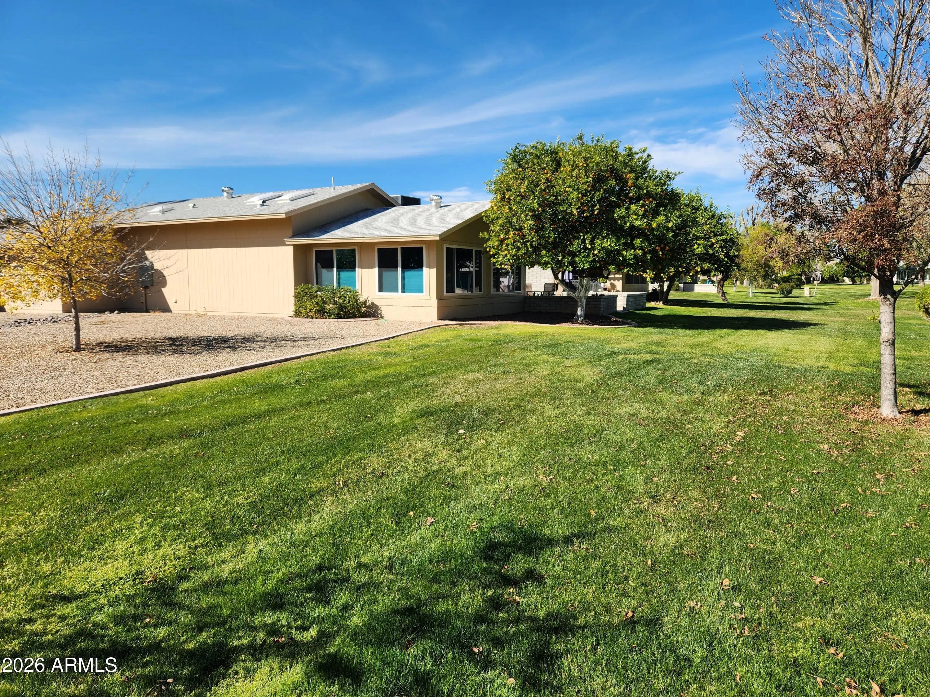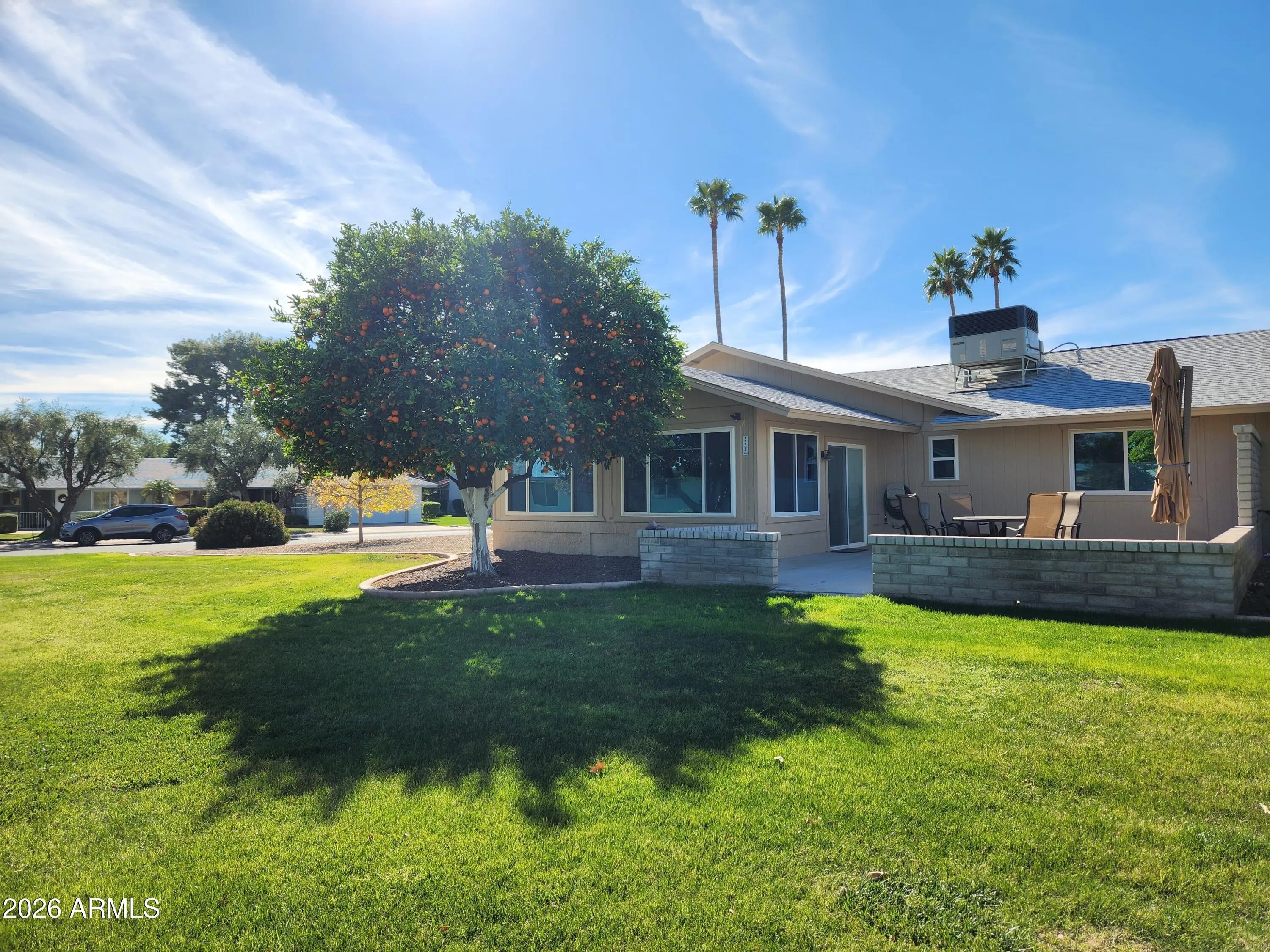 Beautiful park like setting for this spacious and updated home. Updates include flooring, stainless steel kitchen appliances, washer, dryer, water heater, new electric panel & more. Front & back patios offer open & shaded options for enjoying the greenery, as property is set back from other homes. An expansive Arizona room allows you to enjoy the views from inside through replaced windows, with custom blinds. Other extras include the primary bathroom's tiled shower, spacious utility room, vacation mailbox, RO system & roof & HVAC have been updated too. The angled corner placement of the home offers privacy and beautiful views of the common area- maintained for you! Plus an orange tree of your own. Conveniently located in Sun City West with 4 recreation centers & 7 golf courses.