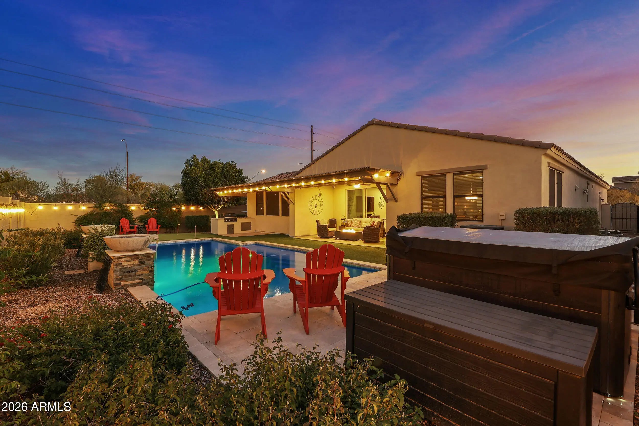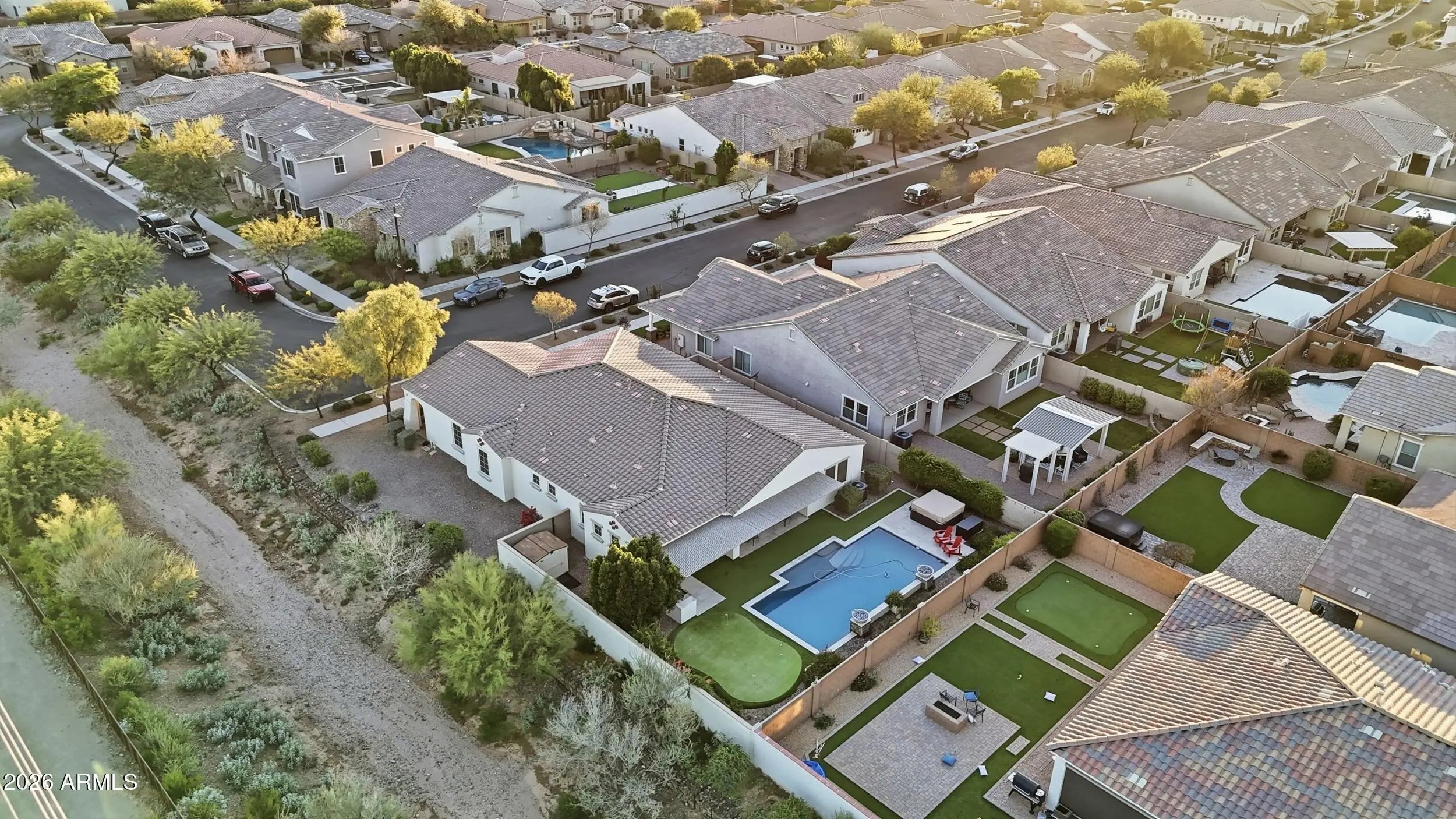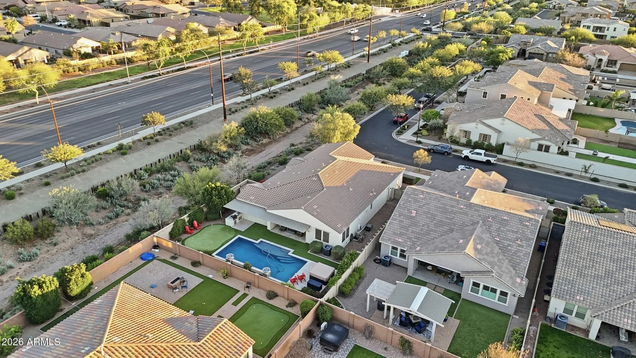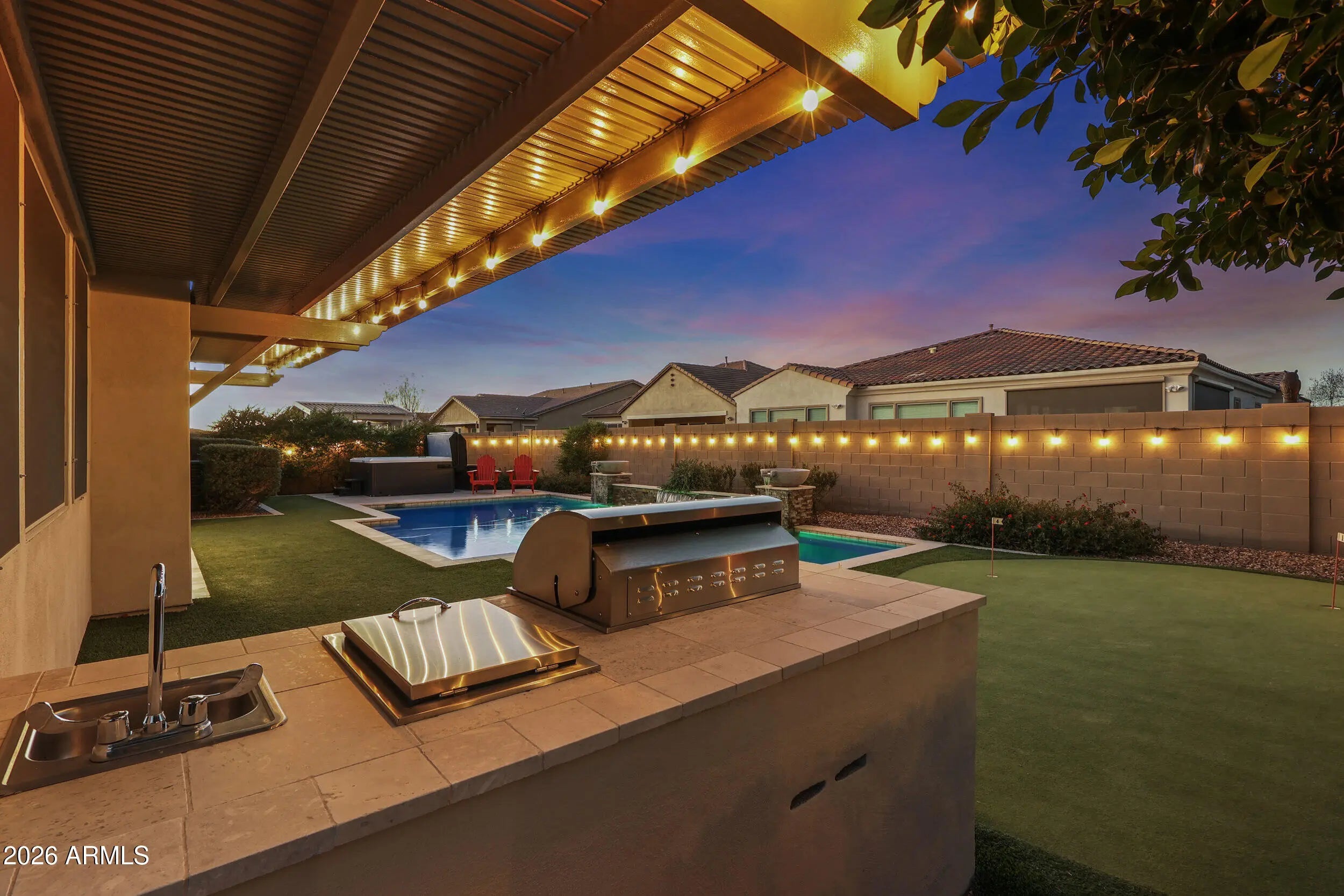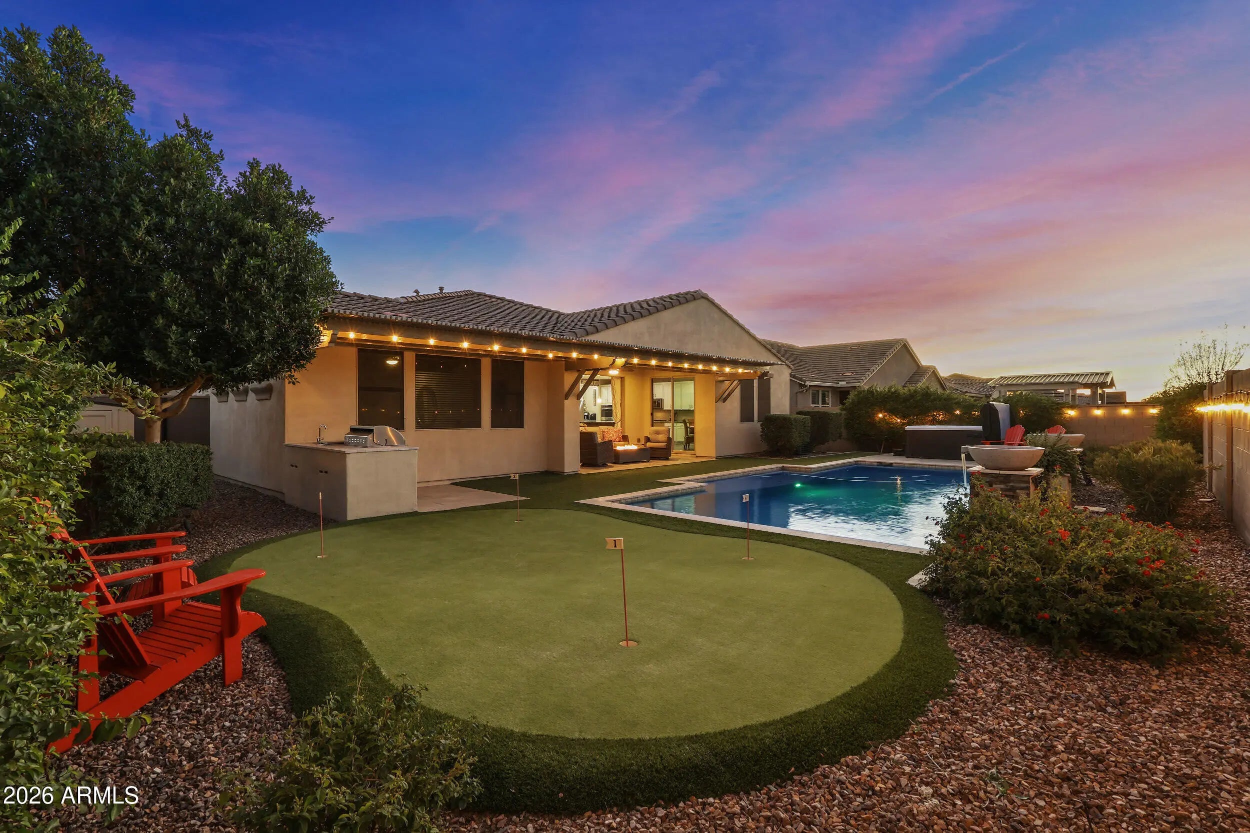 Welcome to this spacious 2,717 sq ft single-story home located in the heart of Eastmark, one of Mesa's most sought-after master-planned communities. Designed for comfort, functionality, and entertaining, this home offers 4 bedrooms plus a den, 3.5 bathrooms, and sits on an oversized 10,146 sq ft premium lot with desirable north/south exposure. The open-concept interior features upgraded cabinetry, upgraded appliances, and a large slab granite island perfect for gathering and hosting. Thoughtful upgrades continue throughout the home, including a water softener, reverse osmosis system, sunset/sunrise light sensors, and a 3-car tandem garage equipped with an EV 220 outlet, 30-amp RV outlet, and 220 power for a hot tub. Step outside to your private resort-style backyard complete with a heated pool, putting green, built-in BBQ, attached pergola, storage shed, and low-maintenance turf in both the front and back yard, ideal for year-round Arizona living. The hot tub (installed 12/24) is negotiable, adding even more flexibility for the next owner. Recent updates provide peace of mind and value, including exterior paint (6/25), variable-speed pool pump (3/23), water heater replacement (6/23), and microwave (2024), Laundry room cabinets (2019). Iron Front door, and Sun Screens. This rare large single-level home on a premium lot combines luxury, efficiency, and lifestyle in one of the East Valley's premier communitiesclose to parks, schools, amenities, and everything Eastmark has to offer: A 4,000+ sq ft resort-style community pool and heated family splash area just outside The 'Mark community center. The Eastmark Great Park featuring open green space, trails, playgrounds, event pavilion, splash pad, lake, picnic areas and more. A robust calendar of 100+ community events and seasonal celebrations throughout the year. Resident-run clubs and activities ranging from book and wine clubs to volunteer opportunities that connect neighbors and build community. Excellent proximity to shopping, dining, and neighborhood favorites like farmers markets and community gatherings.