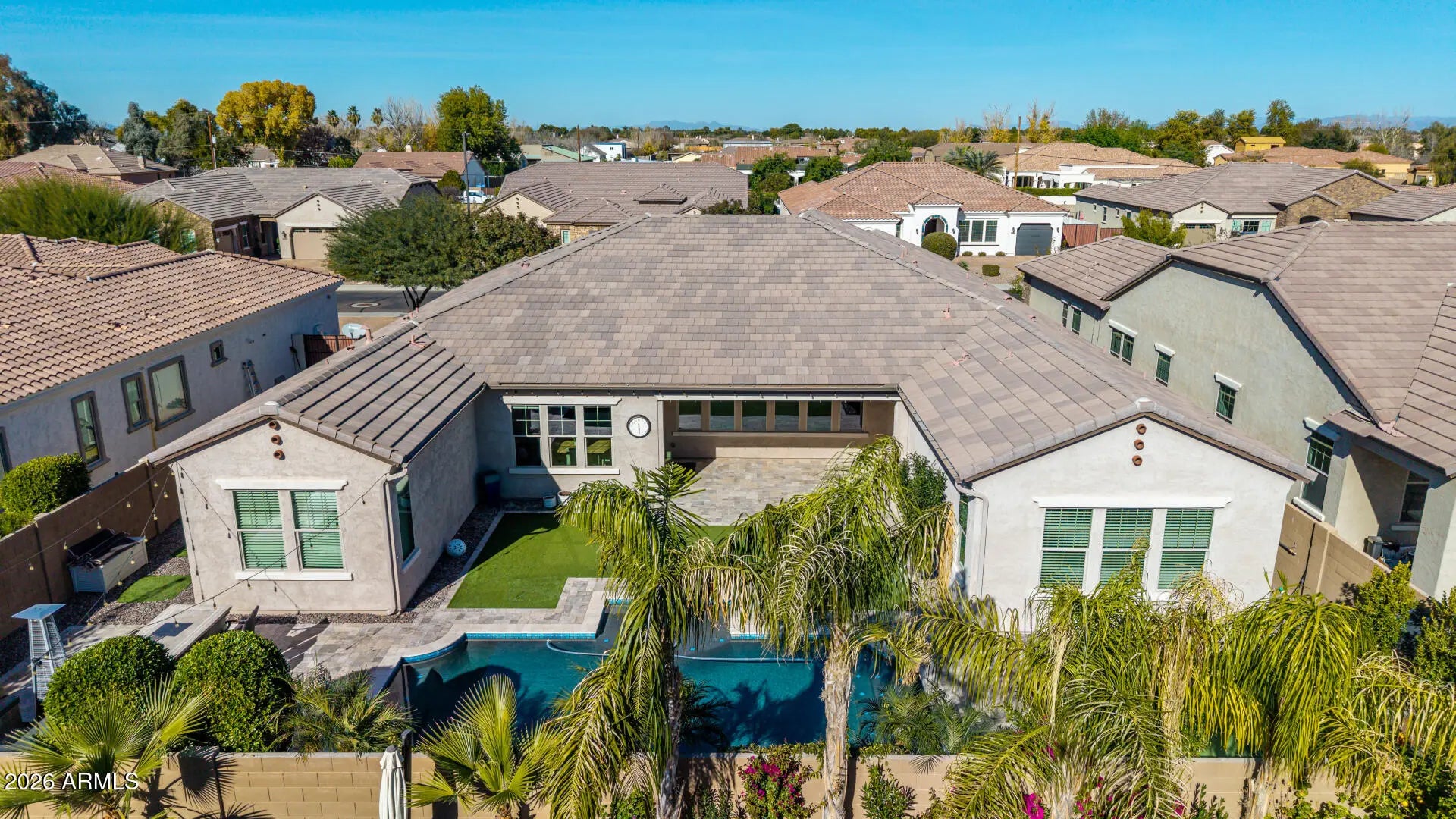 Welcome to this exquisite luxury residence, where contemporary elegance meets refined functionality, nestled within the prestigious gated community of Pescara in Chandler. A custom iron front door opens to a grand, open-concept design highlighted by soaring 9+ flat ceilings, upgraded tile flooring, and graceful architectural archways throughout. Offering 5 spacious bedrooms and 4.5 beautifully appointed bathrooms, this home is thoughtfully designed for both elevated everyday living and exceptional entertaining. The stunning great room showcases dramatic ceilings, custom beams, fresh designer paint, and a striking stone archway that seamlessly connects to the sunlit dining nook and chef-inspired kitchen. This gourmet kitchen is a true showpiece, featuring quartz countertops, staggered white shaker cabinetry with crown molding, statement pendant lighting, a chef-style gas cooktop, built-in double wall ovens, stainless steel appliances, brick backsplash, walk-in pantry, and an expansive island ideal for gathering. Retreat to the luxurious primary suite, complete with a spa-like ensuite offering dual vanities, a deep soaking tub, an oversized walk-in shower, and a generous custom built-in walk-in closet. The desirable split floor plan includes two bedrooms connected by a Jack-and-Jill bath, along with two additional bedrooms each featuring private en-suite bathrooms, perfect for guests or multigenerational living. Additional highlights include a stylish powder room, large sized laundry room, RO/water purifying system and a 3-car split garage with epoxy flooring and a new 240-amp EV charging station. Step outside to your private resort-style oasis. The beautifully designed backyard is an entertainer's dream, showcasing a pool with cascading waterfalls, baja step with bubbler, built-in gas BBQ, putting green, and an expansive covered patio equipped with a commercial heater as well as cooling misters for year-round enjoyment.