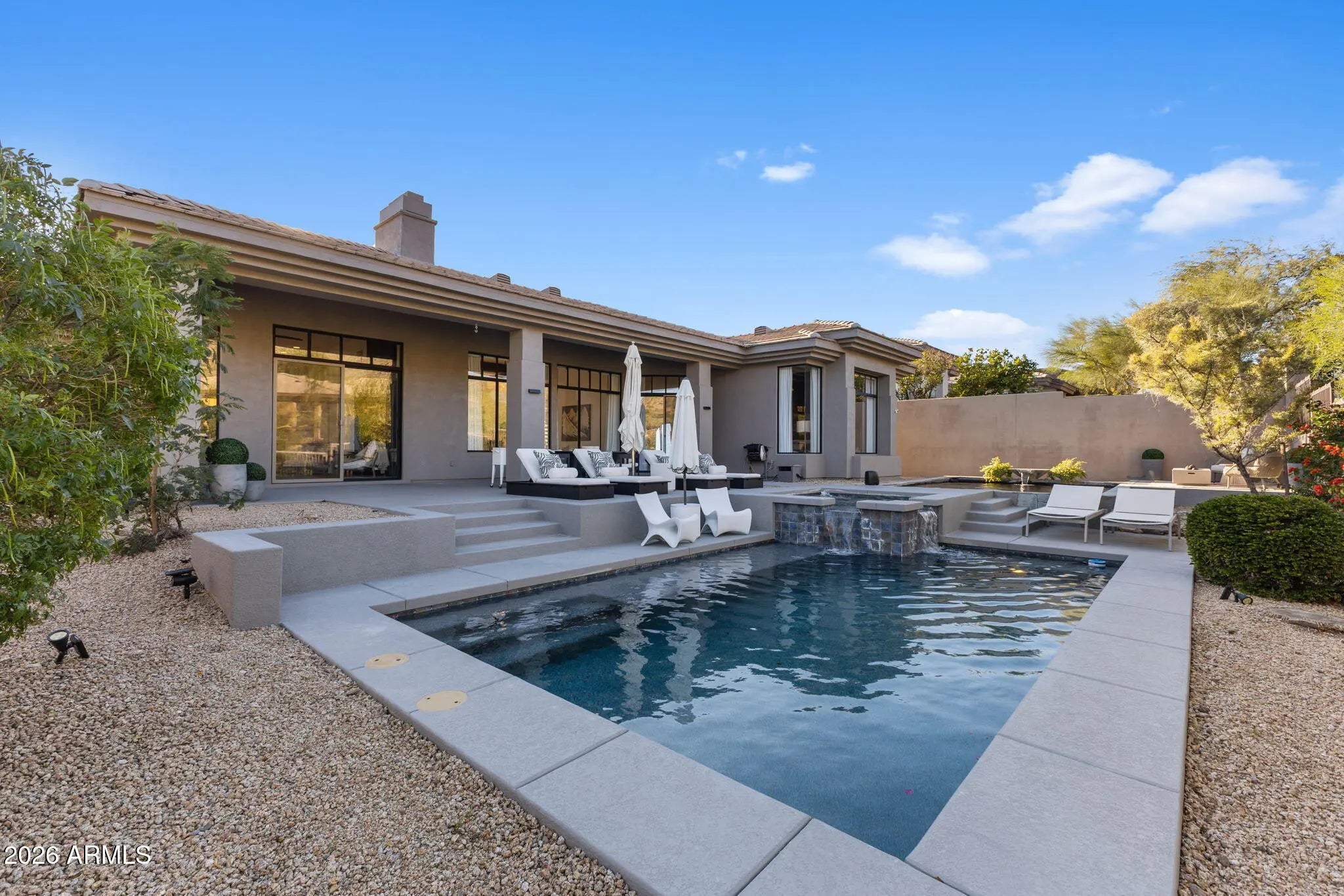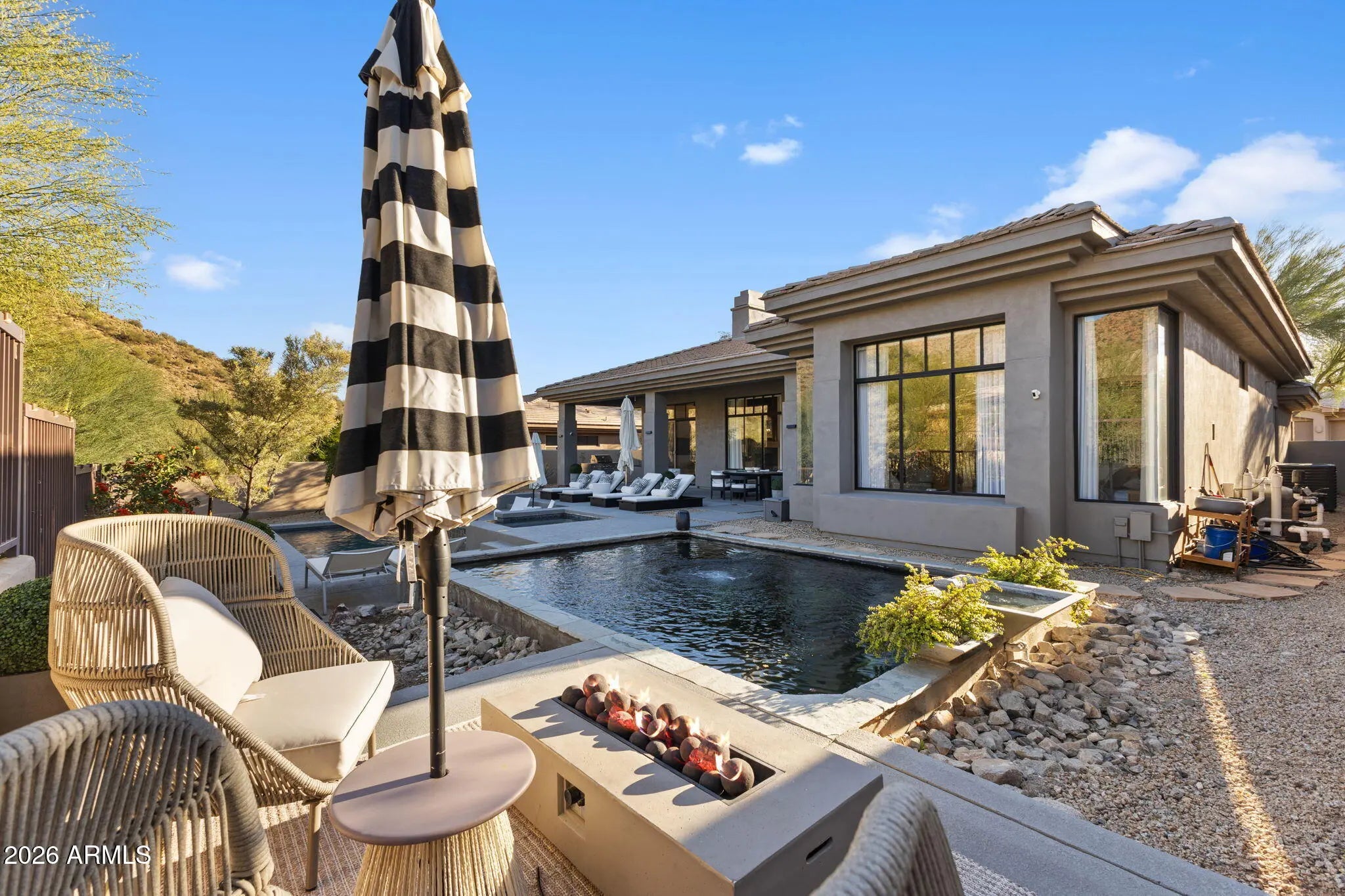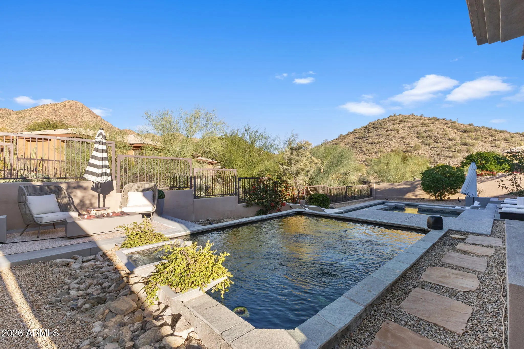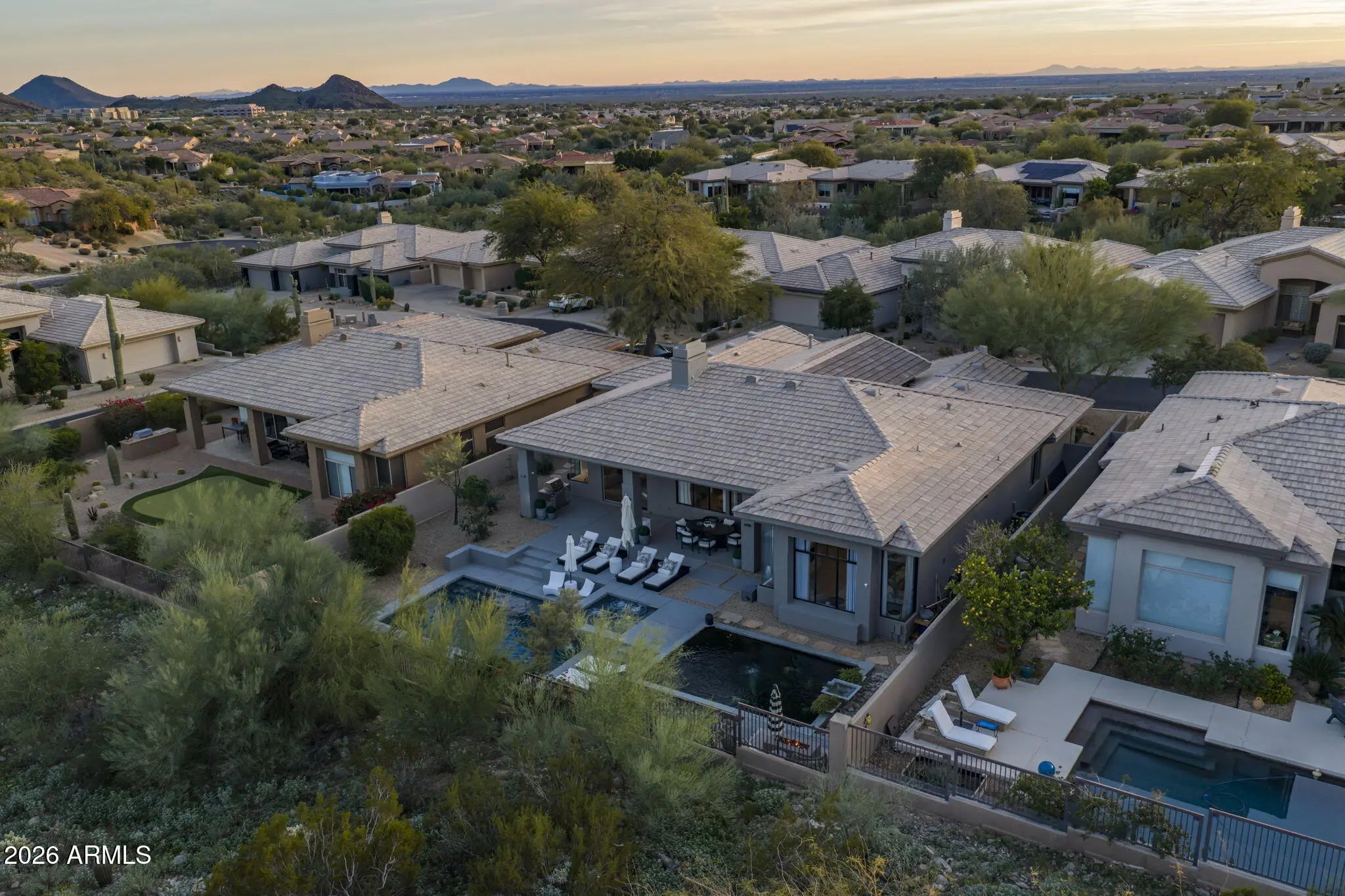 Perched behind a guarded gate of the coveted Scottsdale Mountain neighborhood, and framed by breathtaking views of the McDowell Mountains, this exquisitely remodeled residence offers a rare blend of luxury, privacy, and resort-style living. Spanning over 3,000 square feet, every detail of this 3-bedroom, 2.5-bath home has been thoughtfully curated for refined living and effortless entertaining. Upon entry, soaring ceilings accented by elegant beam work set a warm yet sophisticated tone. The open living and family room spaces are anchored by a dual-sided fireplace, creating seamless flow and inviting ambiance. A dedicated office and private workout room provide ideal spaces for today's modern lifestyle, while a newer roof adds peace of mind. (CONTINUED) The heart of the home is a true chef's dream eat in kitchen, featuring quartz countertops, a farmhouse sink, 6-burner gas range with pot filler, expansive island, dry bar with wine fridge, and an oversized pantry perfect for both daily living and hosting unforgettable gatherings. The primary suite is a serene retreat, complete with a private exit to the resort-style backyard, a cozy electric fireplace, and an oversized walk-in closet with custom built-ins. The spa-inspired en suite bath boasts a walk-in shower, luxurious soaking tub, dual vanities, and a private toilet room. Step outside and be captivated by sweeping mountain vistas and an outdoor oasis designed for relaxation and entertaining. Enjoy the covered patio, sparkling pool and jacuzzi (added just 7 years ago), a tranquil koi pond with over 15 fish and an automatic feeder, and a fire pit all creating the perfect backdrop for Arizona sunsets. This is more than a home; it's a lifestyle of comfort, elegance, and unforgettable views in one of Scottsdale's most desirable guarded communities.