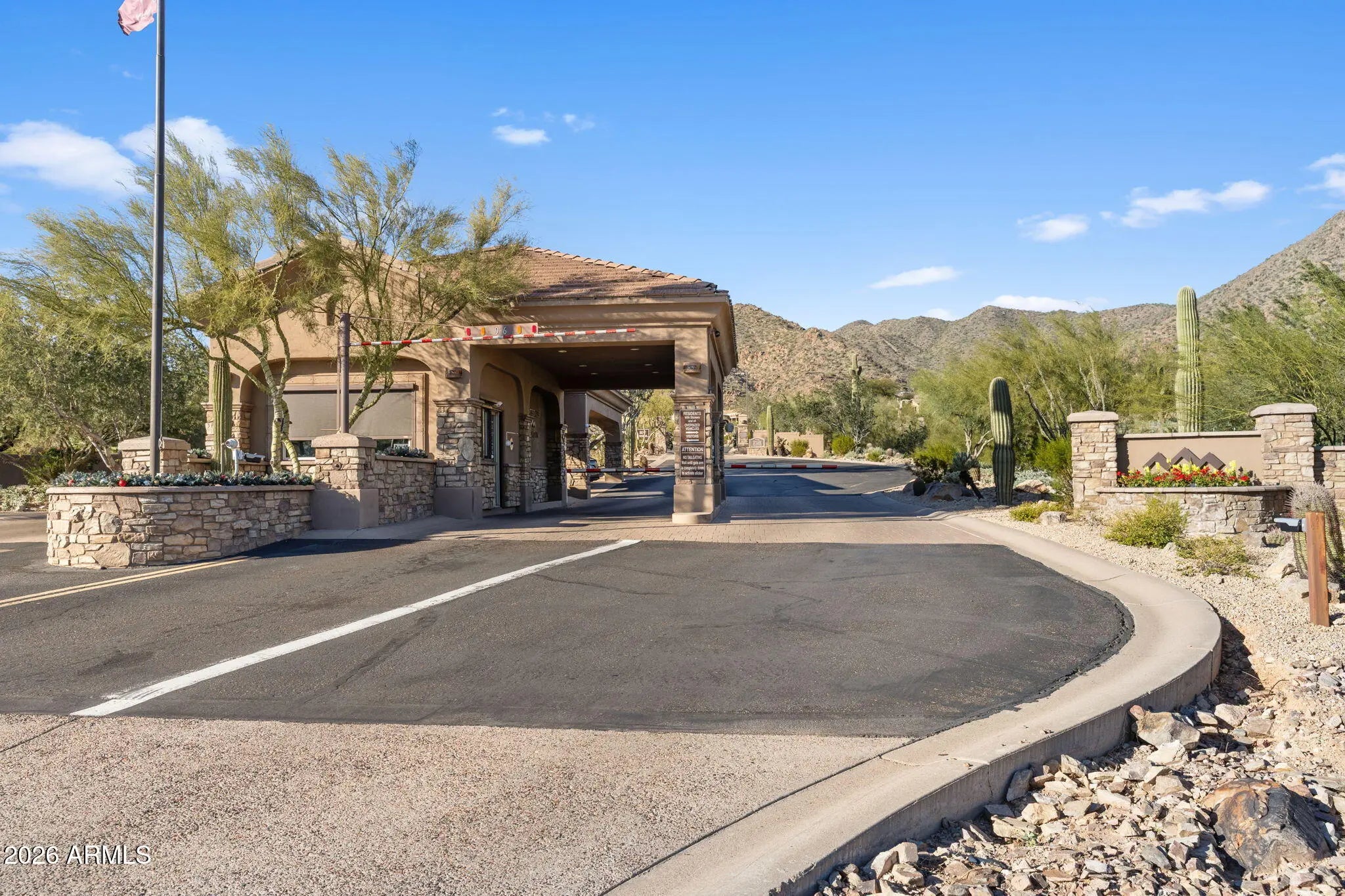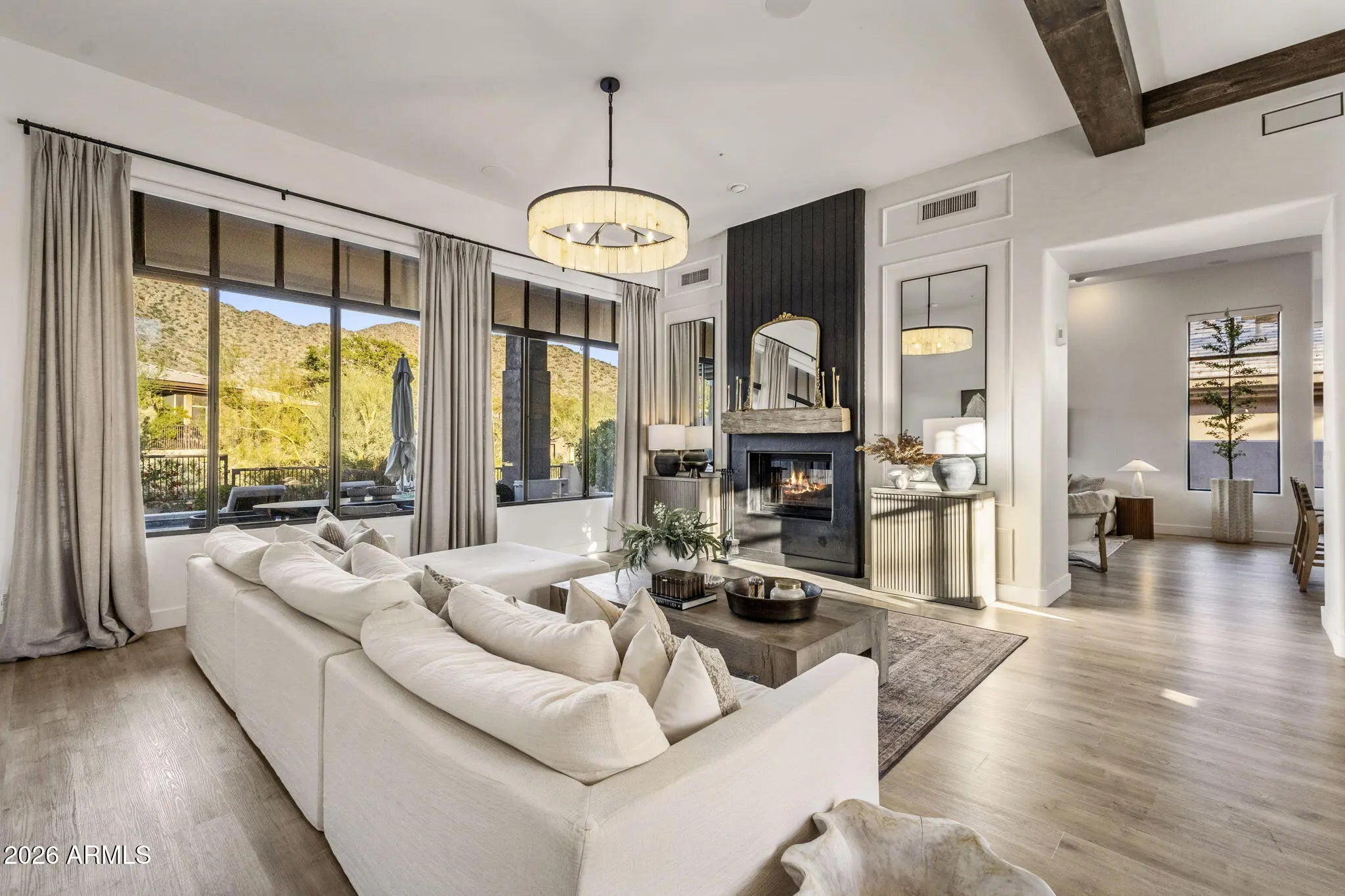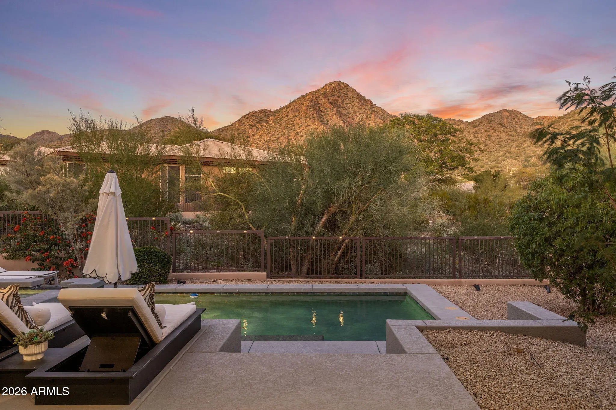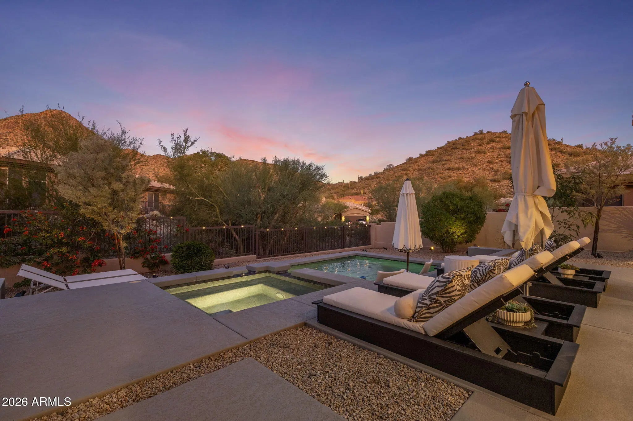 Perched behind a guarded gate of the coveted Scottsdale Mountain neighborhood, and framed by breathtaking views of the McDowell Mountains, this exquisitely remodeled residence offers a rare blend of luxury, privacy, and resort-style living. Spanning over 3,000 square feet, every detail of this 3-bedroom, 2.5-bath home has been thoughtfully curated for refined living and effortless entertaining. Upon entry, soaring ceilings accented by elegant beam work set a warm yet sophisticated tone. The open living and family room spaces are anchored by a dual-sided fireplace, creating seamless flow and inviting ambiance. A dedicated office and private workout room provide ideal spaces for today's modern lifestyle, while a newer roof adds peace of mind. (CONTINUED) The heart of the home is a true chef's dream eat in kitchen, featuring quartz countertops, a farmhouse sink, 6-burner gas range with pot filler, expansive island, dry bar with wine fridge, and an oversized pantry perfect for both daily living and hosting unforgettable gatherings. The primary suite is a serene retreat, complete with a private exit to the resort-style backyard, a cozy electric fireplace, and an oversized walk-in closet with custom built-ins. The spa-inspired en suite bath boasts a walk-in shower, luxurious soaking tub, dual vanities, and a private toilet room. Step outside and be captivated by sweeping mountain vistas and an outdoor oasis designed for relaxation and entertaining. Enjoy the covered patio, sparkling pool and jacuzzi (added just 7 years ago), a tranquil koi pond with over 15 fish and an automatic feeder, and a fire pit all creating the perfect backdrop for Arizona sunsets. This is more than a home; it's a lifestyle of comfort, elegance, and unforgettable views in one of Scottsdale's most desirable guarded communities.