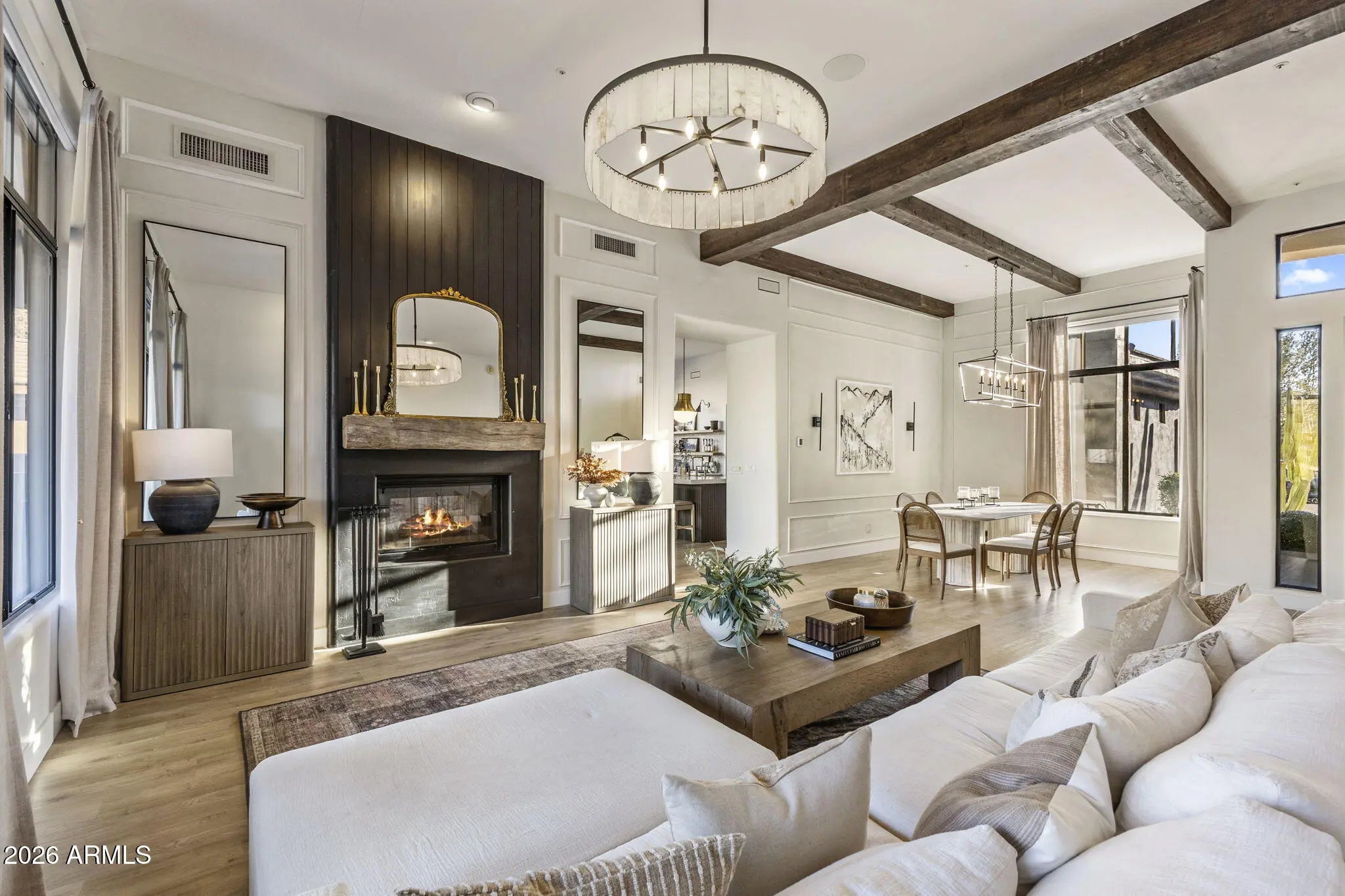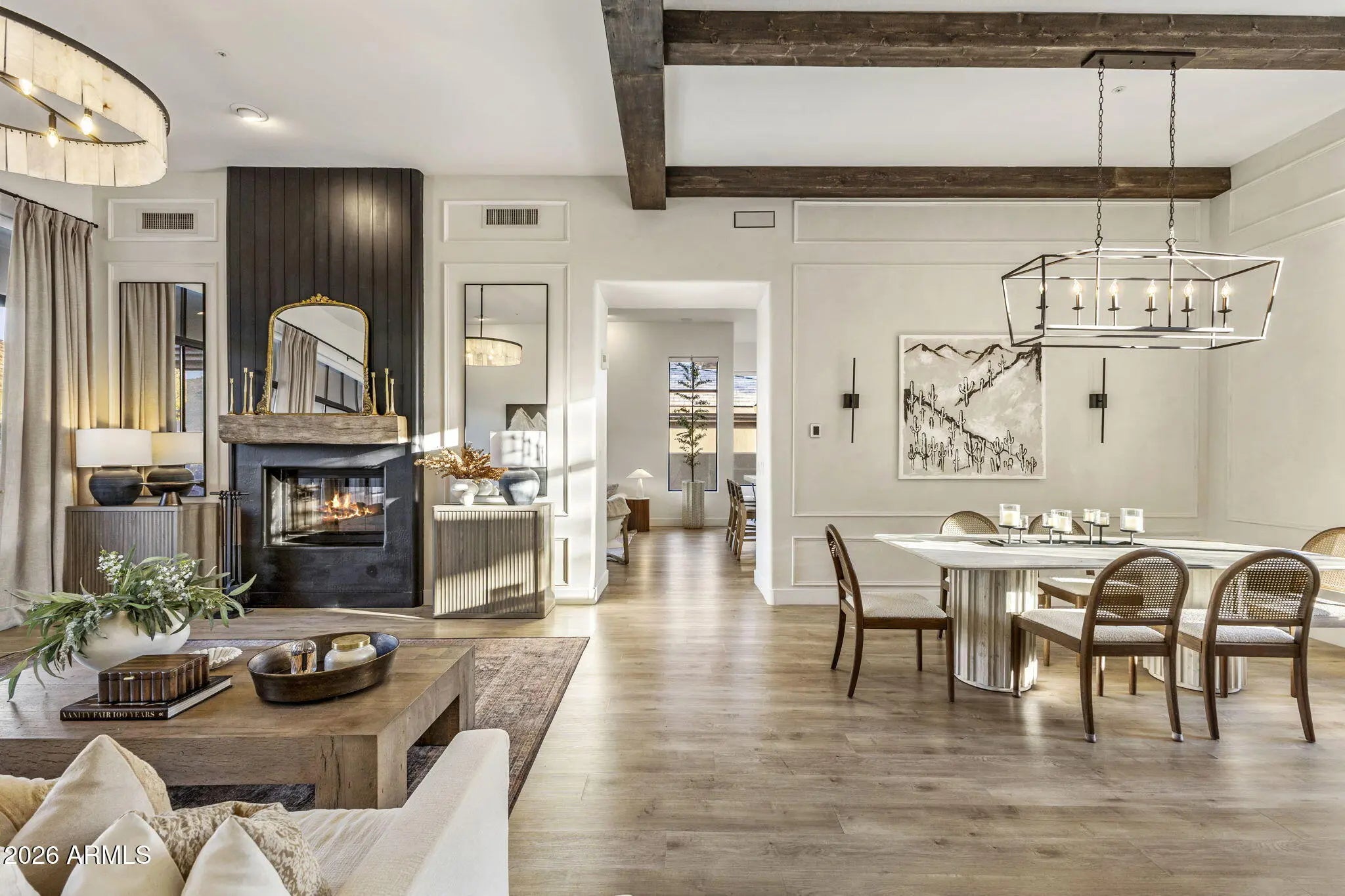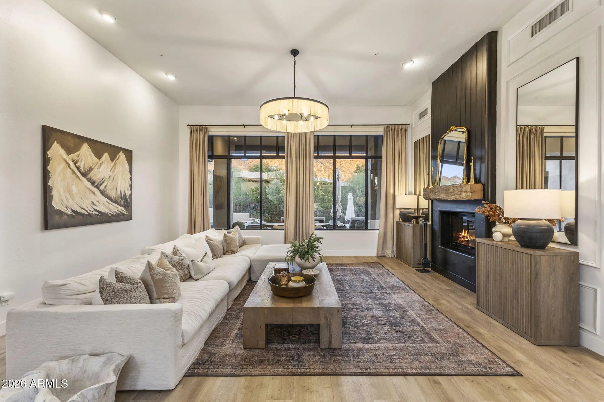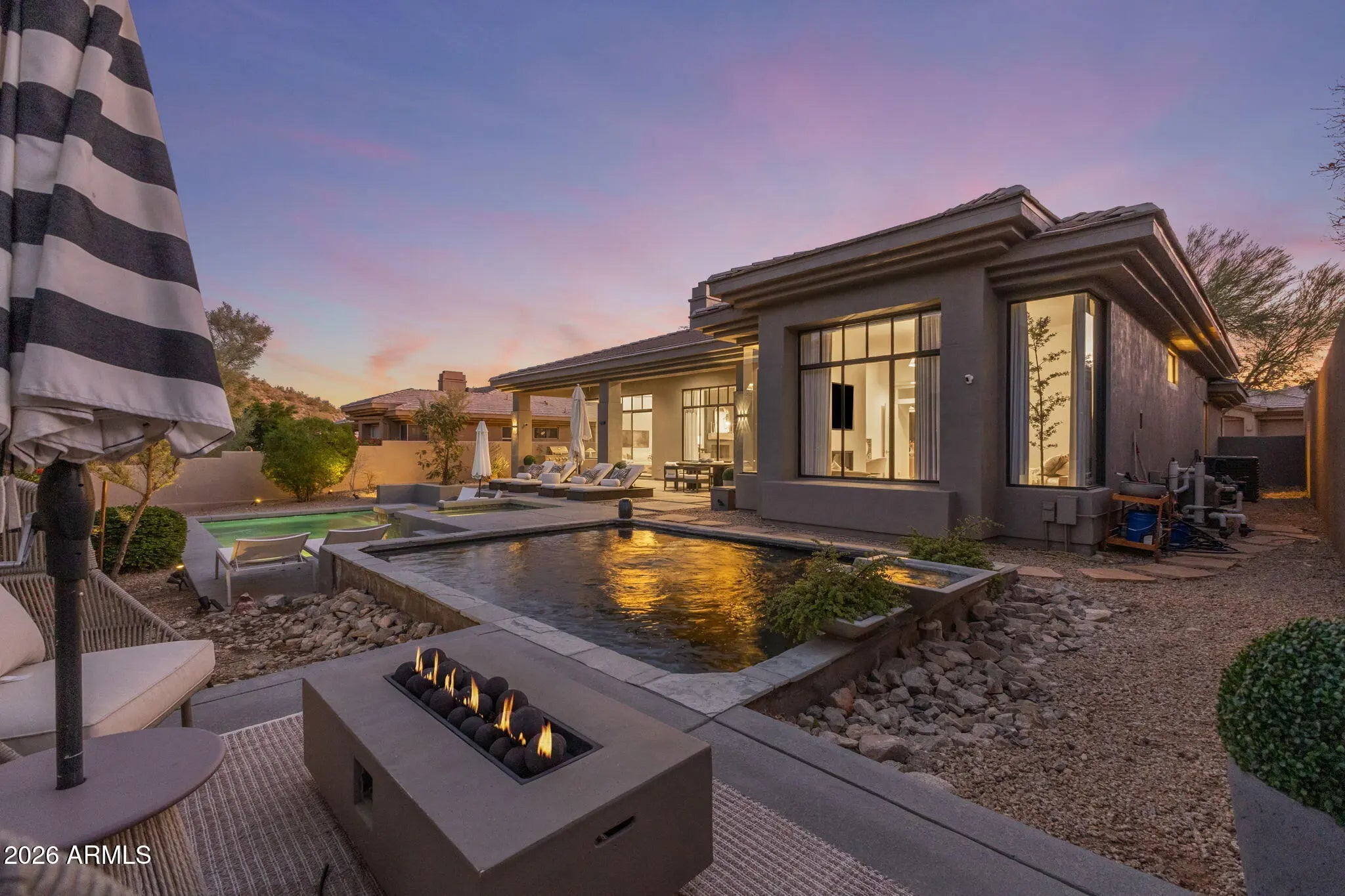 Perched behind a guarded gate of the coveted Scottsdale Mountain neighborhood, and framed by breathtaking views of the McDowell Mountains, this exquisitely remodeled residence offers a rare blend of luxury, privacy, and resort-style living. Spanning over 3,000 square feet, every detail of this 3-bedroom, 2.5-bath home has been thoughtfully curated for refined living and effortless entertaining. Upon entry, soaring ceilings accented by elegant beam work set a warm yet sophisticated tone. The open living and family room spaces are anchored by a dual-sided fireplace, creating seamless flow and inviting ambiance. A dedicated office and private workout room provide ideal spaces for today's modern lifestyle, while a newer roof adds peace of mind. (CONTINUED) The heart of the home is a true chef's dream eat in kitchen, featuring quartz countertops, a farmhouse sink, 6-burner gas range with pot filler, expansive island, dry bar with wine fridge, and an oversized pantry perfect for both daily living and hosting unforgettable gatherings. The primary suite is a serene retreat, complete with a private exit to the resort-style backyard, a cozy electric fireplace, and an oversized walk-in closet with custom built-ins. The spa-inspired en suite bath boasts a walk-in shower, luxurious soaking tub, dual vanities, and a private toilet room. Step outside and be captivated by sweeping mountain vistas and an outdoor oasis designed for relaxation and entertaining. Enjoy the covered patio, sparkling pool and jacuzzi (added just 7 years ago), a tranquil koi pond with over 15 fish and an automatic feeder, and a fire pit all creating the perfect backdrop for Arizona sunsets. This is more than a home; it's a lifestyle of comfort, elegance, and unforgettable views in one of Scottsdale's most desirable guarded communities.