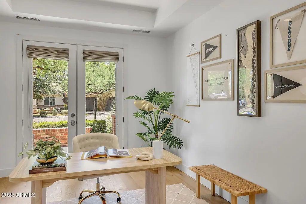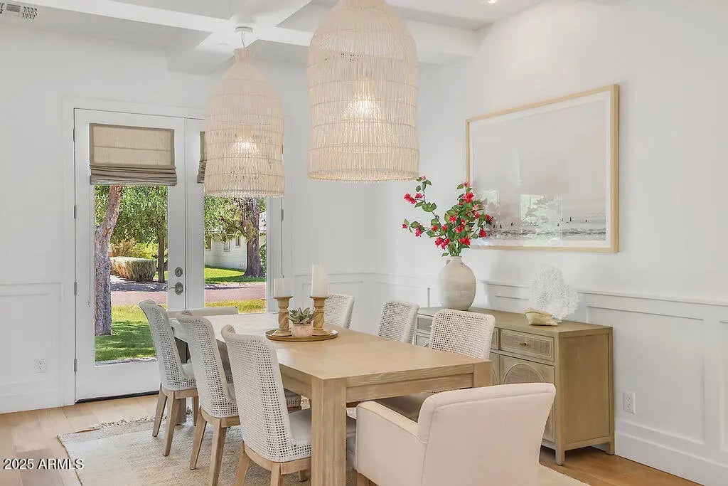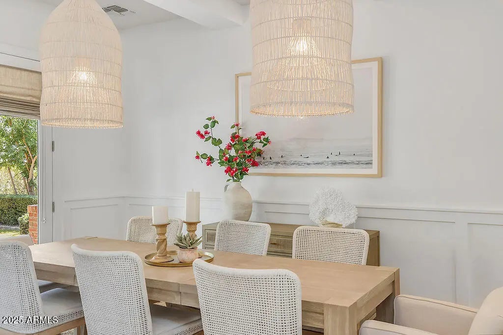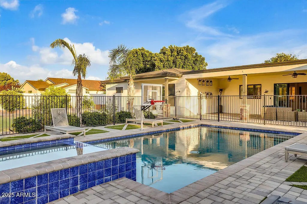 Exquisitely crafted in 2017, this open-concept home offers 4 bedrooms, 4.5 baths, a playroom, office, and an extended 3-car garage. Interior highlights include European Oak hardwood floors, contemporary fireplaces, custom built-ins, detailed wainscoting, and trim work. Situated on a half-acre North/South lot, the outdoor space features a shaded patio, built-in speakers, citrus trees, regulation bocce court, ramada with misters, heated saltwater pool and spa, grassy play area, and poolside basketball hoop. The chef's kitchen impresses with a large quartz island, Thermador appliances, farmhouse sink, wine cooler, beverage drawer, and walk-in pantry. Nestled on a picturesque street in one of Phoenix's most sought-after neighborhoods, this home offers a rare blend of style and comfort.