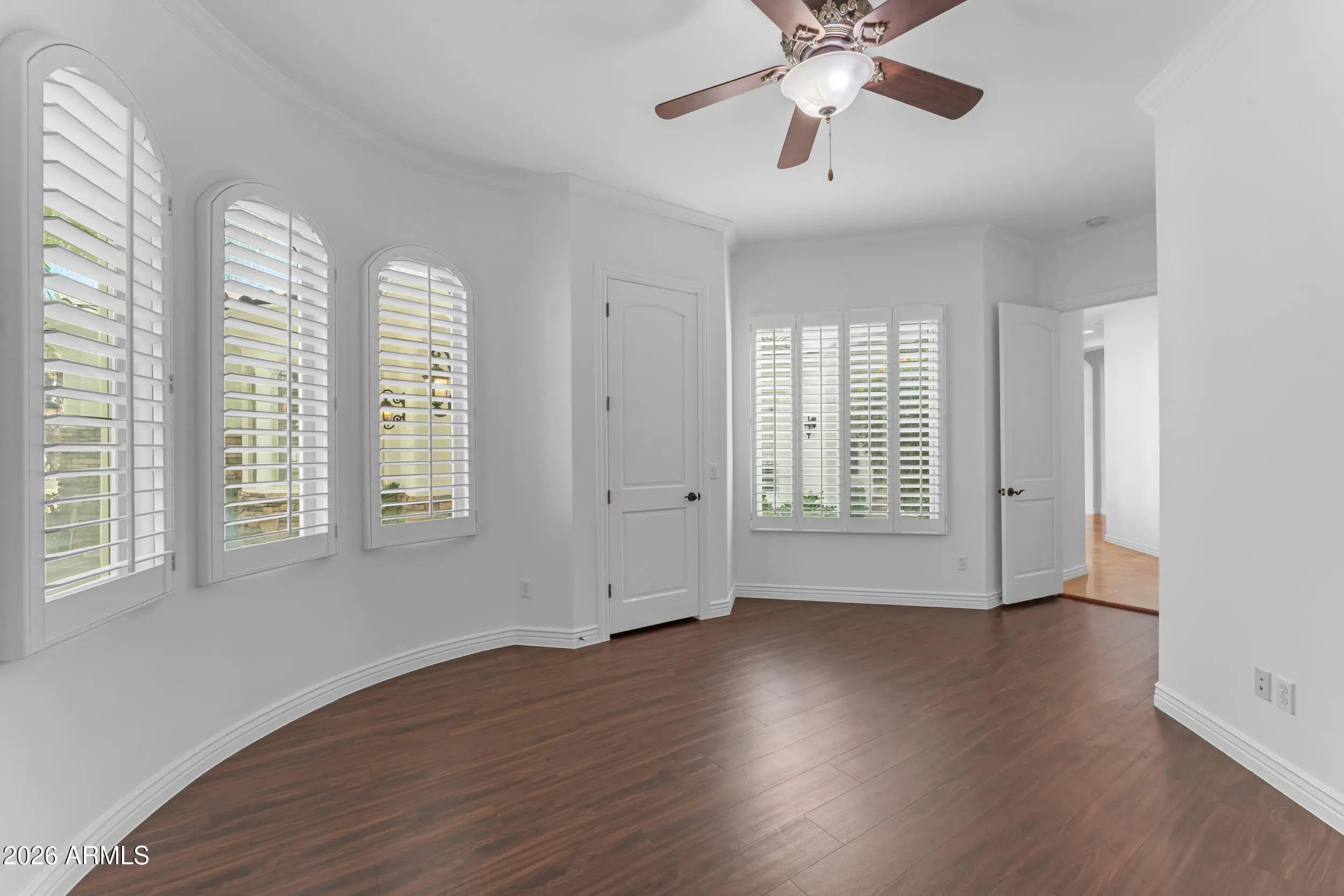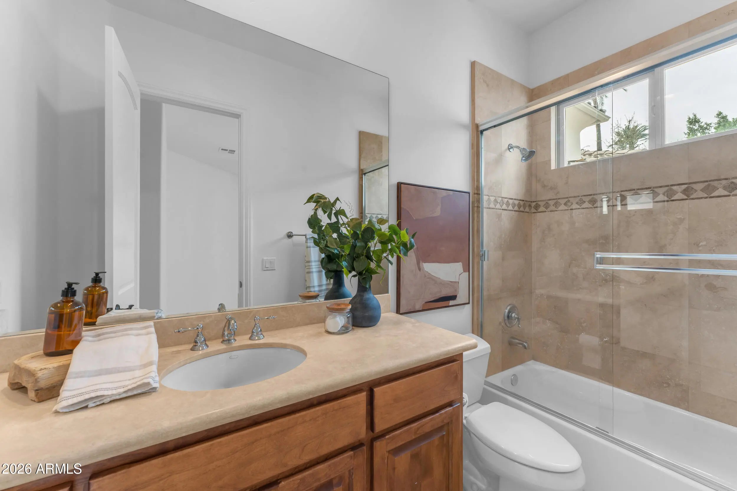 Tucked inside the exclusive gated community of Wexford Cove, this beautifully updated Spanish/Mediterranean-style home welcomes you through striking iron gates into a tranquil courtyard with fountain. Completely redone with light, fresh finishes inside and out, this impressive residence offers style, comfort, and incredible value. Featuring a 4-bedroom, 4.5-bath split floor plan, the open layout is both inviting and functional. The central great room showcases 12-foot ceilings and flows seamlessly into the formal dining area, custom wet bar, and eat-in kitchen with a large island and bar seating, perfect for entertaining or relaxed evenings at home. Custom cabinetry throughout adds a polished yet warm feel. The spacious primary suite is a true retreat, offering a separate tiled shower, soaking tub, dual vanities, and a walk-in closet with custom built-ins. One of the most desirable features of this home is that every bedroom includes its own private en-suite bathroom, a rare find. Triple-pane, noise-reducing windows enhance comfort and quiet throughout. Step outside to a peaceful backyard with a beautiful fountain and a generously sized patio, ideal for entertaining or unwinding at the end of the day. Located just minutes from Uptown Phoenix's newest restaurants, with easy access to the Biltmore, sporting events, and major freeways.