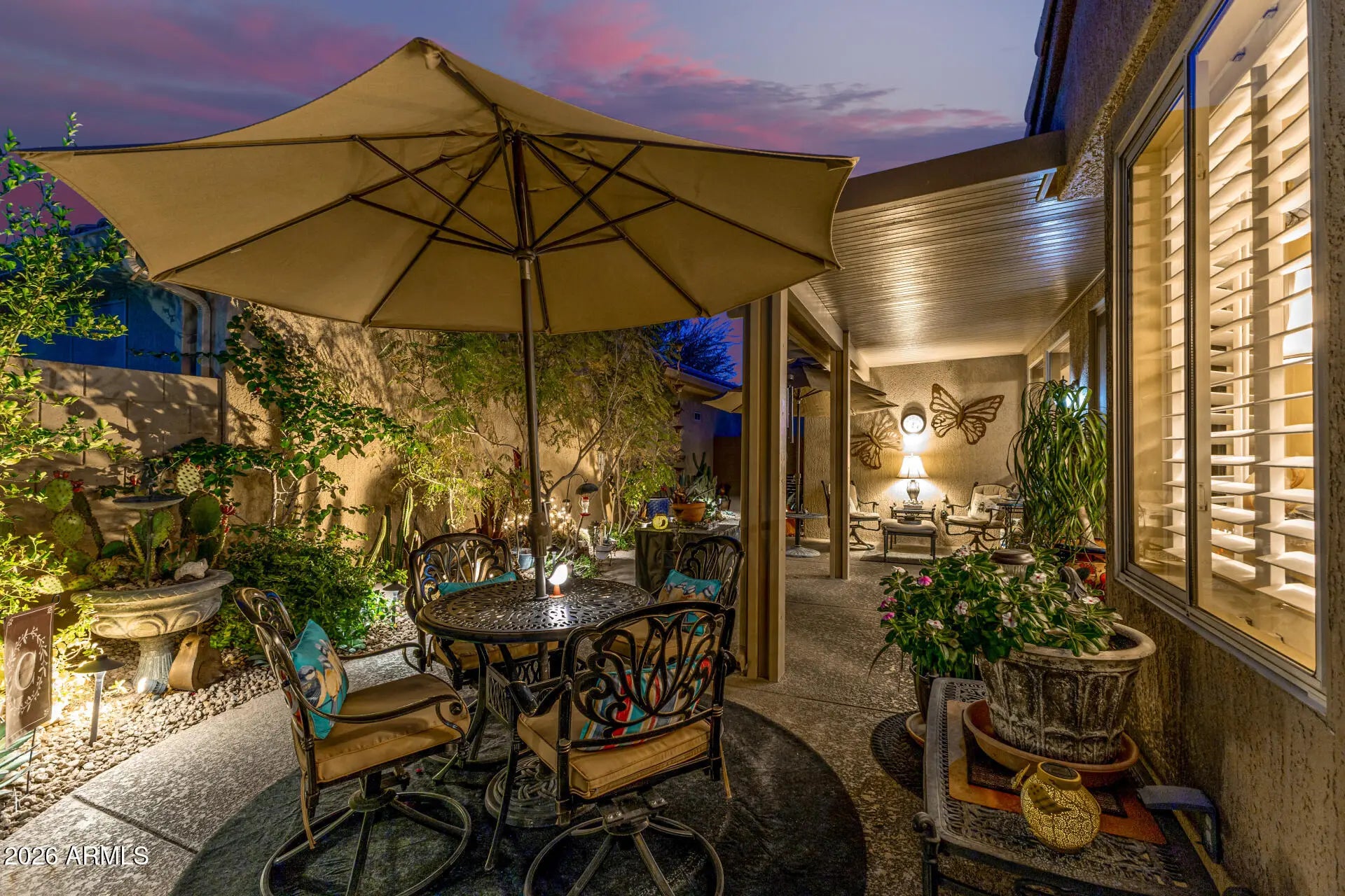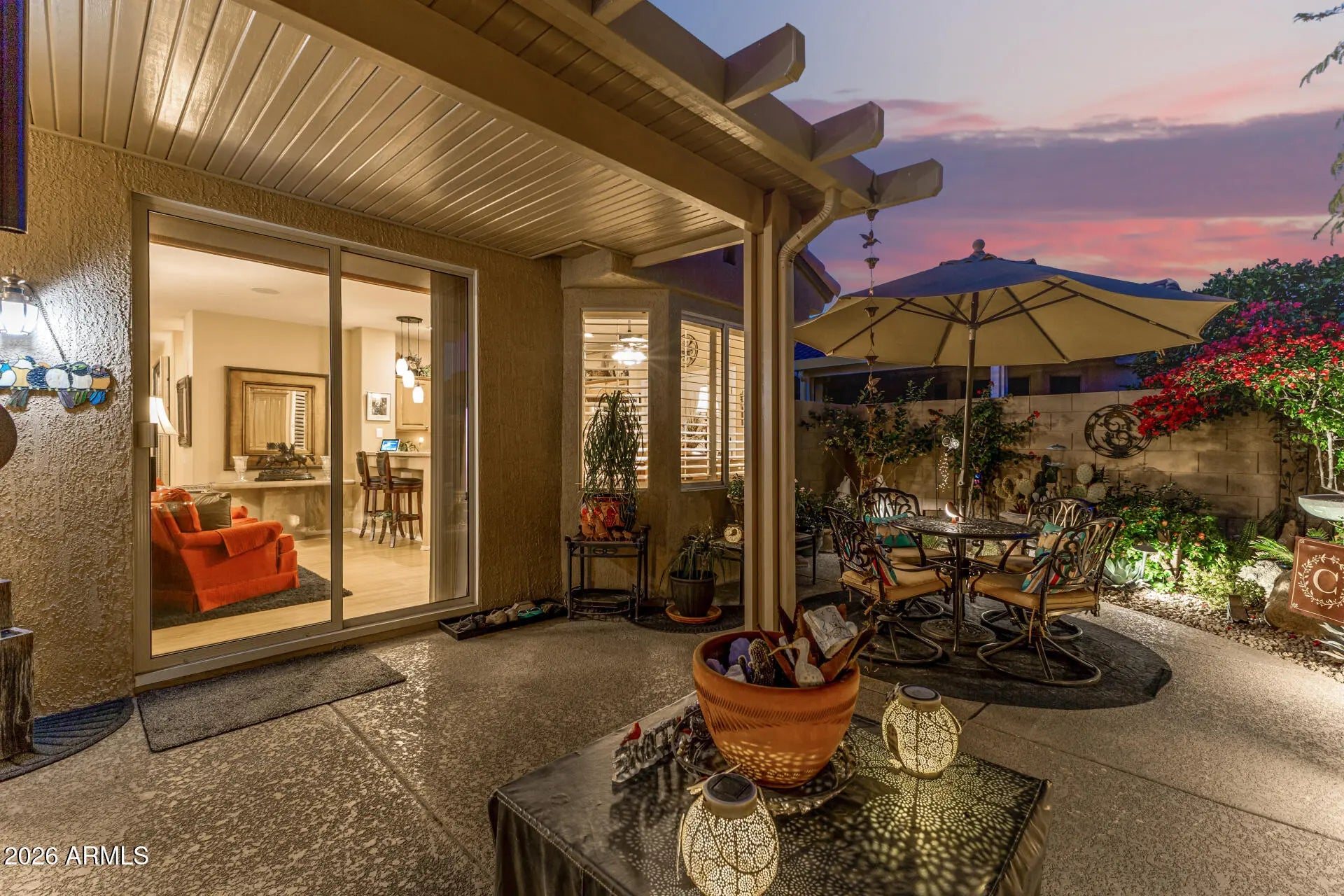 Welcome to this beautifully maintained 1400 sq ft 2 bedroom, 2 bath patio home perfectly situated on a desirable corner lot. Designed for both comfort and easy living, the home features an open floor plan filled with natural light, upgraded lighting, and accented by white wood shutters throughout. Split floor plan, with 2 closets in primary bedroom. The lush, tranquil backyard is a true retreat—thoughtfully landscaped and enhanced with ambient landscape lighting, creating the perfect setting for relaxing evenings or intimate gatherings. A 2-car attached garage adds everyday convenience, while a new A/C installed in 2025 offers peace of mind for years to come. Beyond the home, enjoy an exceptional resort-style community with amenities that rival a private club. The Grand community includes multiple golf courses, pickleball and tennis courts, a state-of-the-art fitness center with an indoor track. Enjoy an indoor pool, heated outdoor lap pool and play pool, heated spa, scenic walking paths, on-site restaurants, and a full calendar of social activities. This home offers the perfect blend of low-maintenance living, modern comfort, and an active lifestyleideal for those looking to enjoy it all.