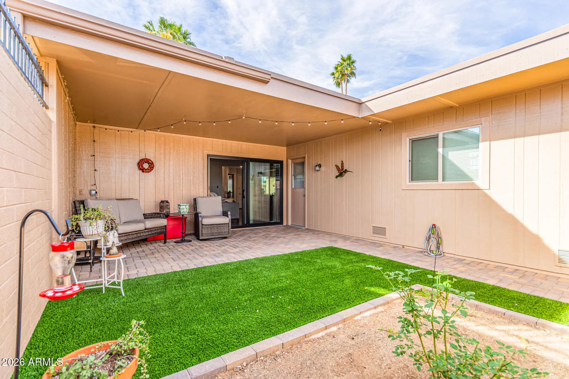 North/South Exposure, Sprinklers In Front, Corner Lot, Gravel/Stone Front, Synthetic Grass Back