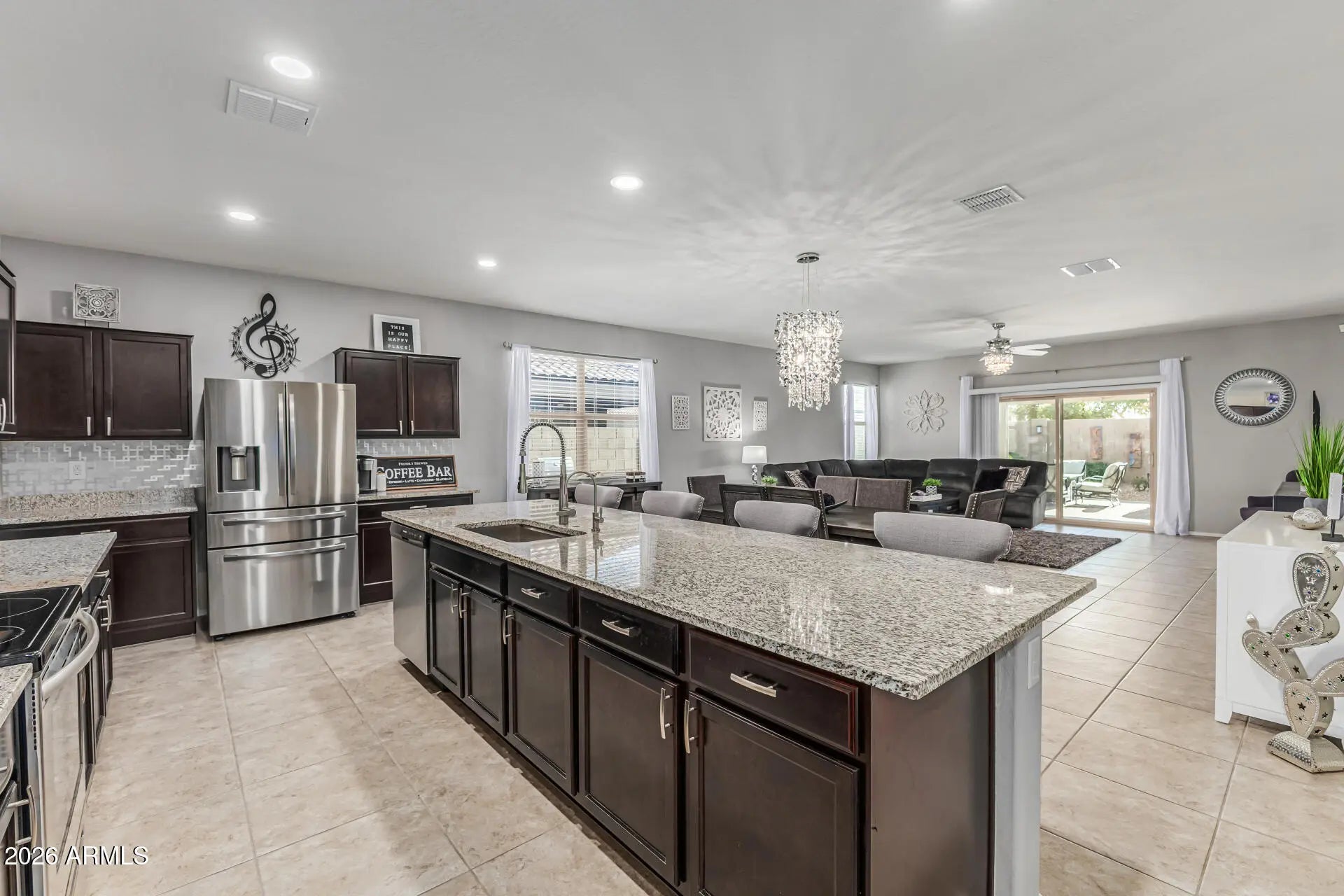 This beautiful single level home sits on a premium corner lot in the popular Mission Royale community all age section, known for its water park with slides, parks, & scenic walking paths. The oversized 9,000+ SF lot feels like a private resort with a sparkling Pebble Tec pool, artificial turf, putting green, pergolas & custom pavers that make it feel like a true backyard getaway. Inside, the open concept floor plan is bright & welcoming with tile flooring in the main living areas & carpet in the bedrooms. The oversized kitchen is a showstopper with a large granite island, custom backsplash, espresso cabinets, large walk-in pantry, RO system, stainless steel appliances & space for bar seating, making it perfect for entertaining. The spacious family room & dining area has decorative lighting that adds a stylish touch throughout the home. The oversized primary suite offers a large walk in closet & a beautifully upgraded bathroom with dual sinks, quartz counter vanity, with custom tile backsplash, cabinets & designer finishes. Additional features include 2nd guest bathroom upgraded, an inside laundry room with washer & dryer included, blinds throughout, ceiling fans in every room & two tone interior paint. This home truly shines with its incredible backyard that has been professionally finished with mature landscaping & fully functional for backyard fun. Also, paid off solar panels for the pool help keep energy costs low for your pool heating. Mission Royale is a wonderful community with so much to do & with the oasis water park, parks, basketball & volleyball there is something for everyone to enjoy. Close to freeway, restaurants & shopping. Truly Turn-Key ready waiting for you.