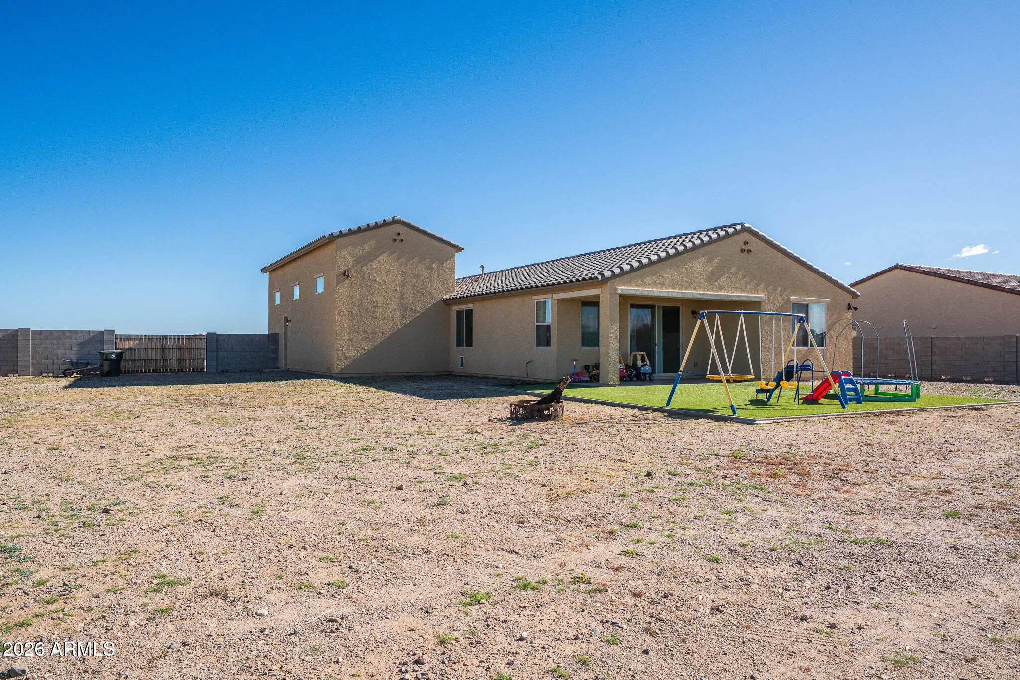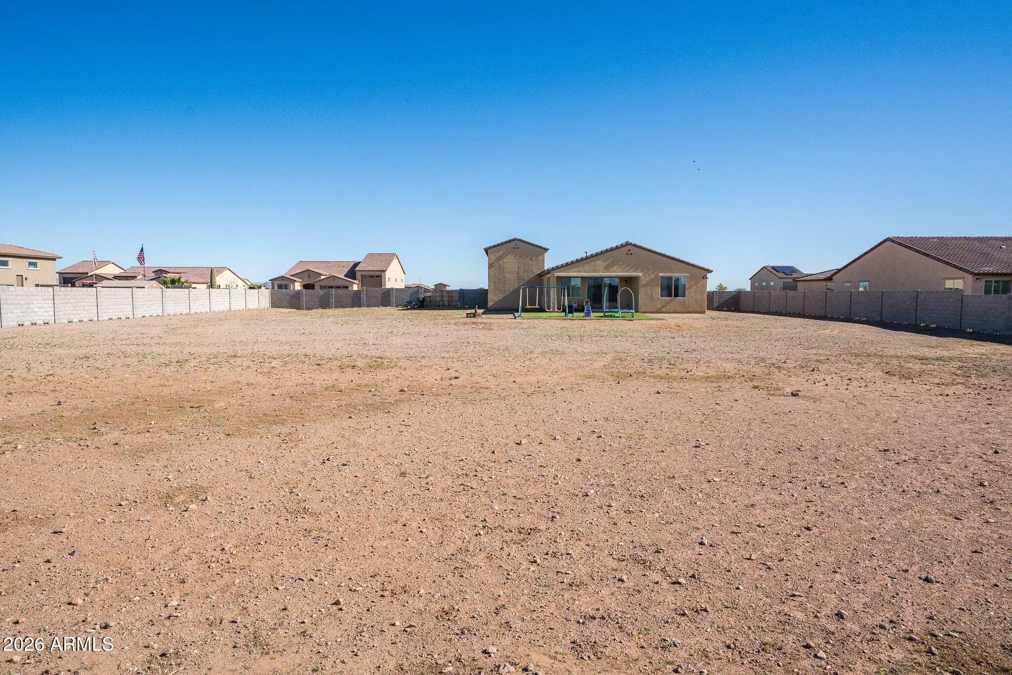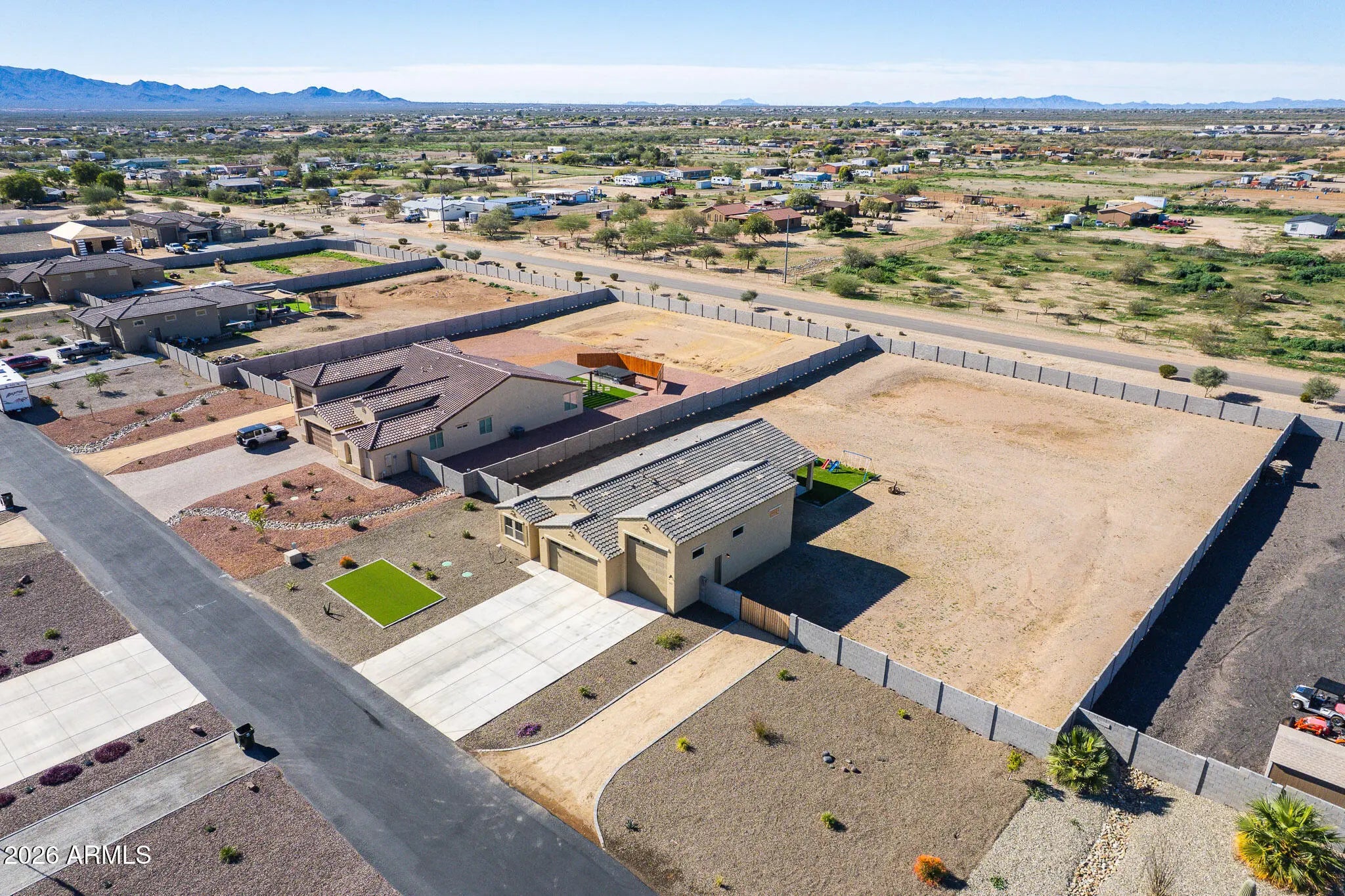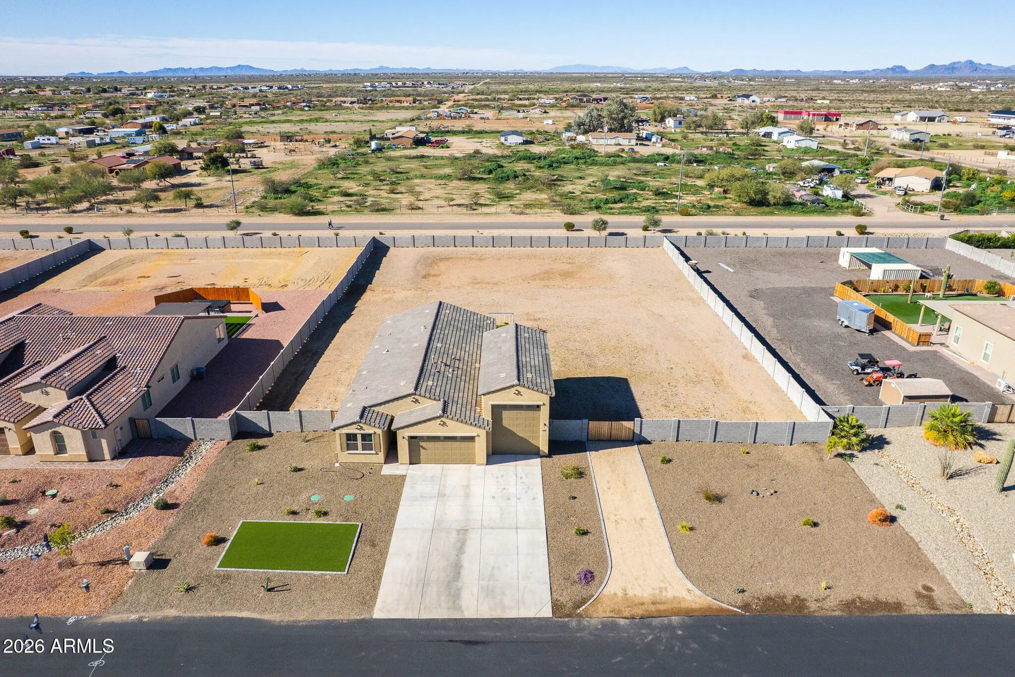 Spacious 2023 Single-Level Home on an Oversized Homesite in a Small Semi-Custom Community Welcome home to this beautifully designed single-level residence built in 2023, offering modern comfort, space, and functionality on an oversized homesite just under one acre. Located in a small semi-custom community of approximately 50 homes built by Courtland Communities, this property offers privacy, pride of ownership, and a true neighborhood feel with great neighbors. The home features 3 bedrooms plus a large flex space, 2.5 bathrooms, and a thoughtfully designed open, flowing floor plan ideal for both everyday living and entertaining. The great room, dining area, and kitchen come together seamlessly, creating a bright and inviting central living space. The gourmet kitchen is a standout, complete with a large island, oversized pantry, stainless steel appliances, 42-inch cabinetry, and granite countertopsperfect for hosting or gathering with family and friends. Throughout the home you'll find 8-foot interior doors, 5+ inch baseboards, and quality finishes that reflect the home's semi-custom construction. The primary suite offers a spacious retreat with an impressive oversized shower and well-appointed bath. Secondary bedrooms are generously sized, and the flex space provides excellent versatility for a home office, media room, gym, or guest space. Car enthusiasts, RV owners, and hobbyists will appreciate the 3-car tandem garage with an attached SUPER RV GARAGE and 12-foot RV gate, offering exceptional storage and parking options rarely found. Outdoors, enjoy private and expansive outdoor living with a huge backyard, large covered patio, and block wall enclosure, providing endless possibilities to create the oasis you desirewhether that's a pool, garden, workshop, or additional outdoor living spaces. Energy-efficient Energy Star features add comfort and efficiency, while the newer construction offers peace of mind and low maintenance. This is a rare opportunity to own a nearly new home with space, quality construction, and a true sense of communityall without the congestion of large subdivisions.