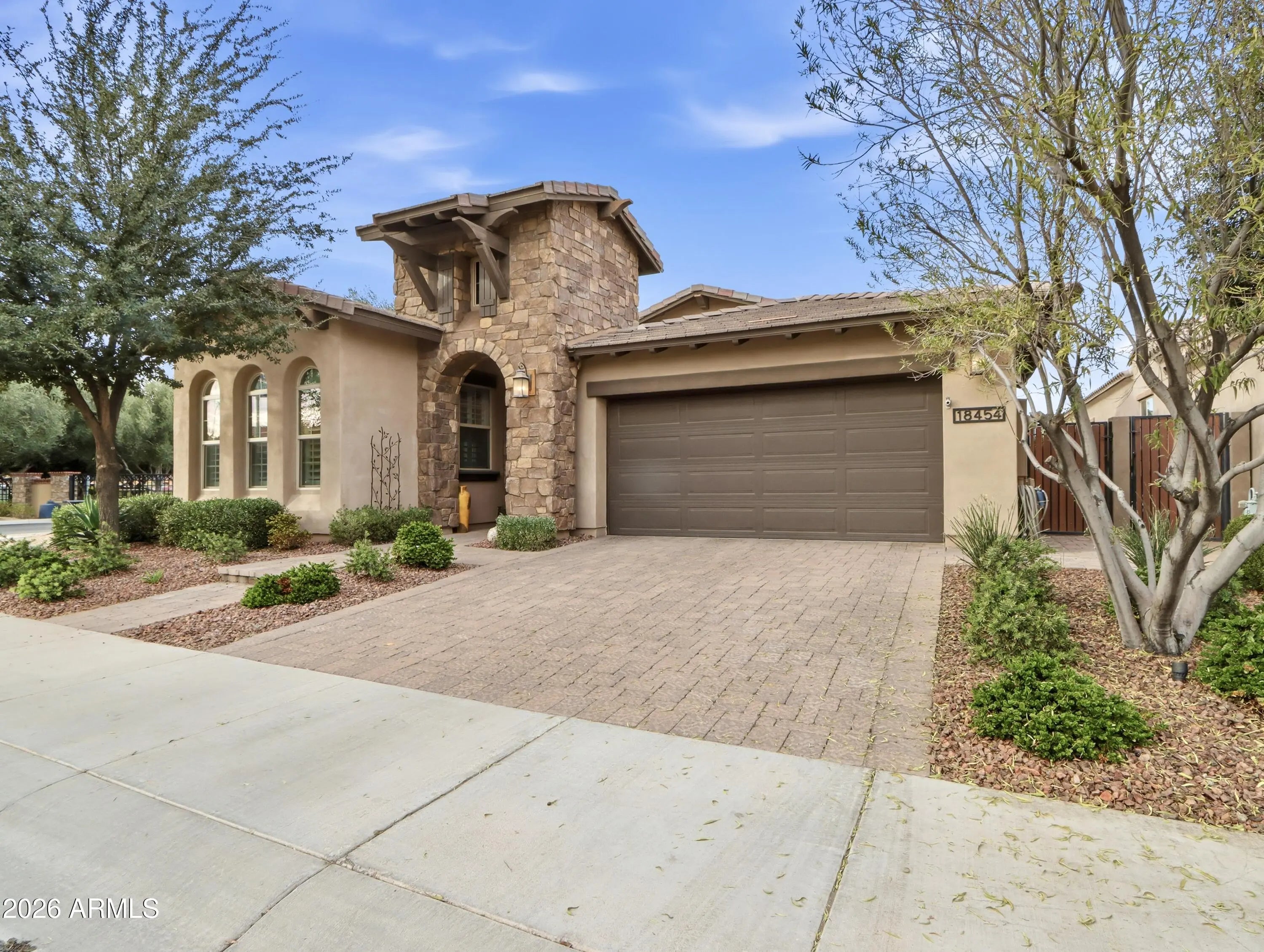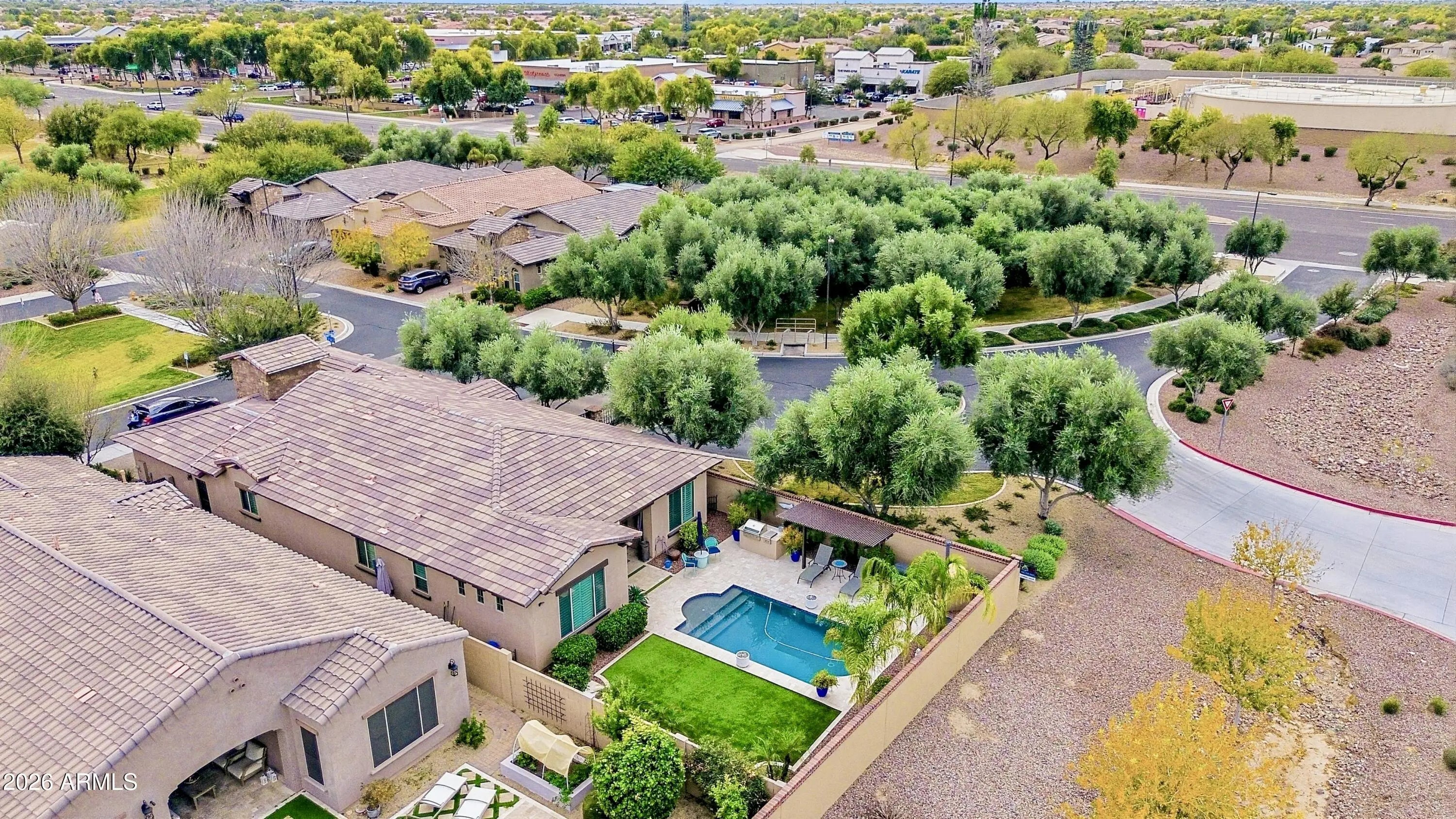 Luxury single-story home built in 2018 located in a highly sought-after, exclusive gated community. This beautifully upgraded residence features a chef's kitchen with custom countertops, plantation shutters throughout, and 100% tile flooring. Designed for effortless living and entertaining, the private backyard offers a pool, built-in BBQ, wood-fired brick pizza oven, and covered ramada. The primary suite includes a rare oversized laundry/bonus room directly connected to the primary closet. Additional highlights include 3 bedrooms, 2.5 baths, whole-home water purification system, and central vacuum. Thoughtfully designed, meticulously maintained, and truly move-in ready, this home offers modern luxury with exceptional functionality.