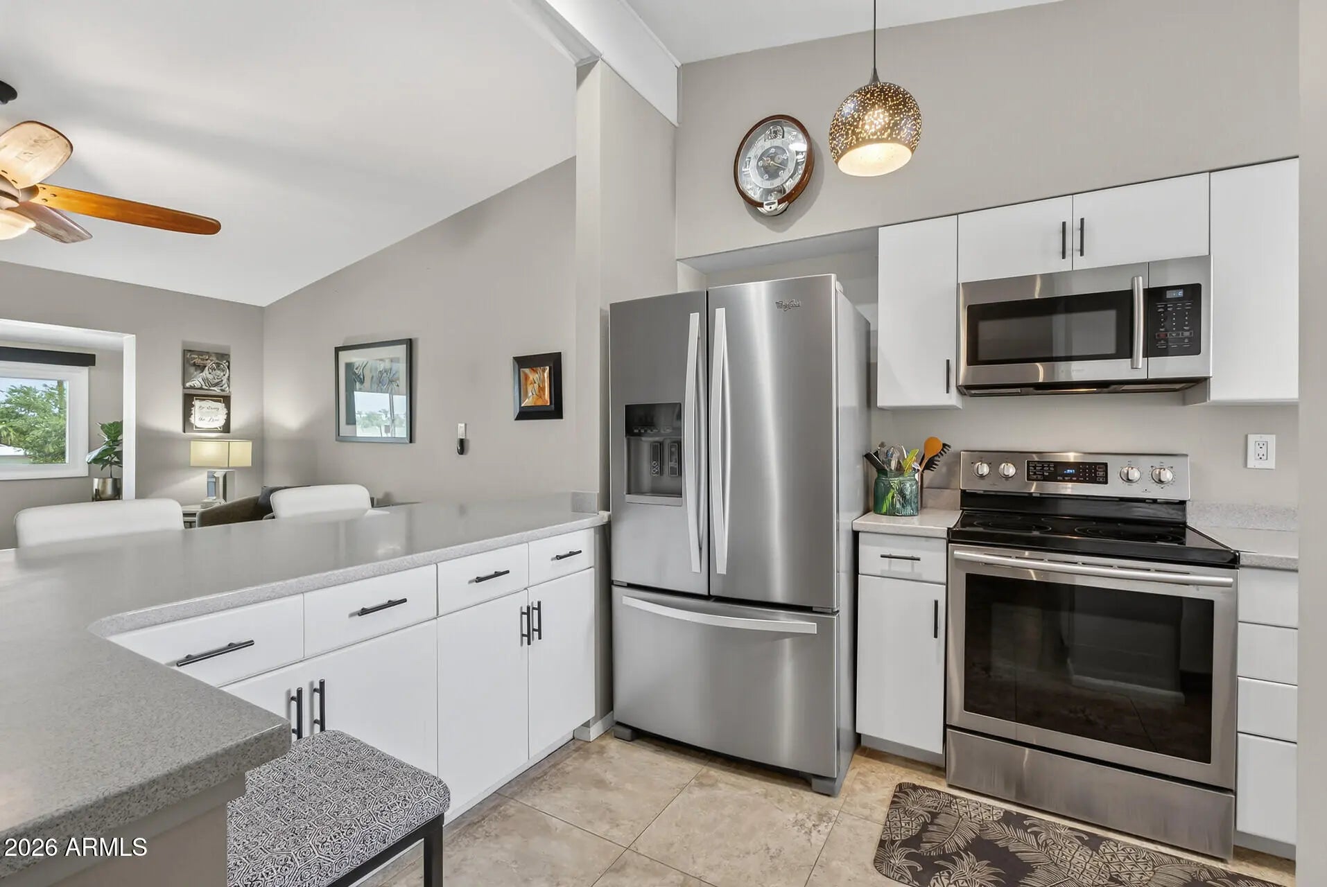 Welcome to this beautifully updated 2-bedroom, 2-bath upstairs unit in the sought-after Fairway Court West in Sun City. Enjoy mountain and golf course views from the bright, open living area featuring neutral tones, tile flooring, and a spacious kitchen with modern cabinetry, stainless appliances, and bar seating. Both bedrooms offer plush carpet and ample natural light, while the bathrooms include updated fixtures and a walk-in shower. Enjoy the ease of elevator access and covered carport parking in this well-maintained community. This move-in-ready home is ideal for low-maintenance living in a vibrant active adult neighborhood.
