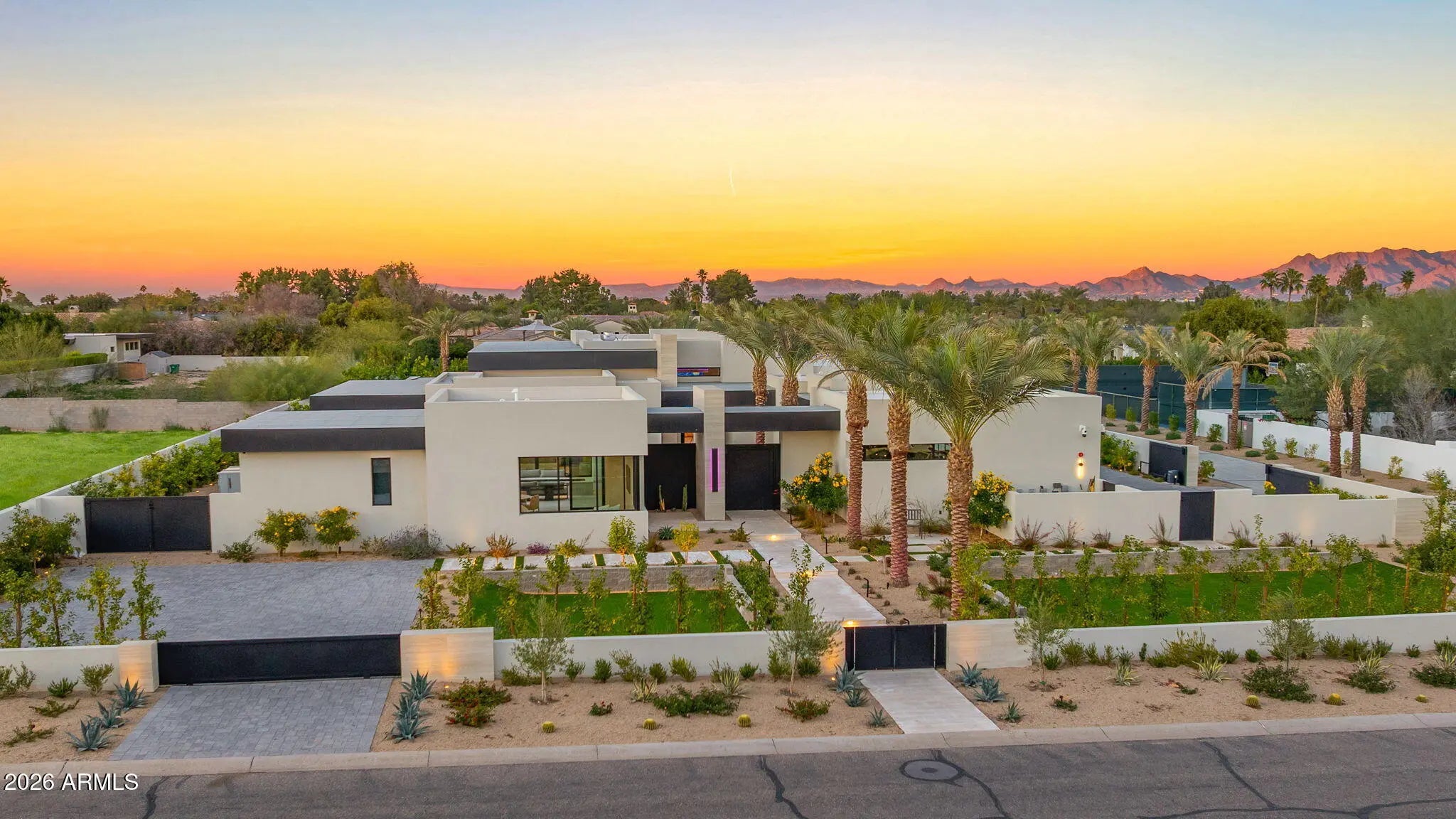 Warm modern estate completed in 2025 on a 1.3 acre Paradise Valley lot, offering approx. 7,850 SF of interior living and 13,400 SF under roof. Designed with a focus on quality per square foot, this 5-bedroom, 7-bath residence is thoughtfully executed throughout. All bedrooms are en-suite with soaring 15 foot ceilings. Features include an advanced low-voltage system integrating lighting, sound, theater, TV walls, and surveillance. Amenities include a temperature-controlled wine cellar, bar with keg on tap, gym, movie theater, steam room in the primary suite, and a one-bedroom guest house. Resort style grounds with Mummy Mountain views feature a lighted pickleball court, elevated viewing deck with water feature, built-in BBQ, pool, and expansive entertaining areas Warm modern masterpiece completed in 2025, set on 1.3 acre Paradise Valley lot, offering approximately 7,850 SF of interior living and an impressive 13,400 SF under roof. This 5 bedroom, 7 bath residence was designed with a deliberate focus on quality per square foot, not quantity, with every inch thoughtfully utilized. All bedrooms are en suite and feature soaring 15 foot ceilings. Exceptional build quality and state-of-the-art technology highlight what is widely regarded as the most advanced low voltage system in Paradise Valley, seamlessly integrating lighting, sound, theater, TV walls, and full property surveillance. Amenities include a temperature-controlled wine cellar, full bar with keg on tap, ice maker and beverage center, private gym, movie theater, 220 inch outdoor tv wall, steam room in the primary suite, and a one bedroom guest house. Outdoor living rivals a luxury resort with a lighted pickleball court, golf putting green, elevated viewing deck with water feature, built-in BBQ, fire features, fire pits, expansive pool, and multiple entertainment areas. Miele appliances throughout, a 5-car garage with capacity for 6 vehicles, and 43 on-site surveillance cameras complete this exceptional offering. Surrounded by nearby new construction homes projected in the $20M-$25M range, this property delivers a rare blend of design, technology, and lifestyle in the heart of Paradise Valley.