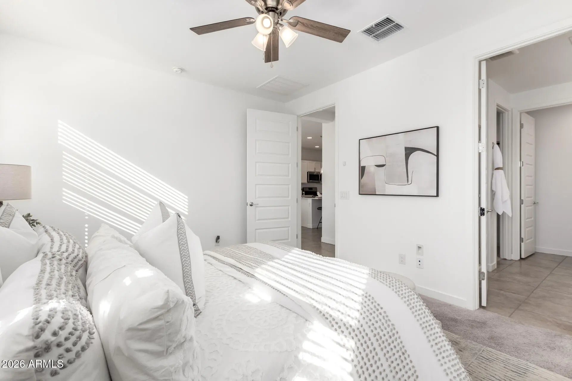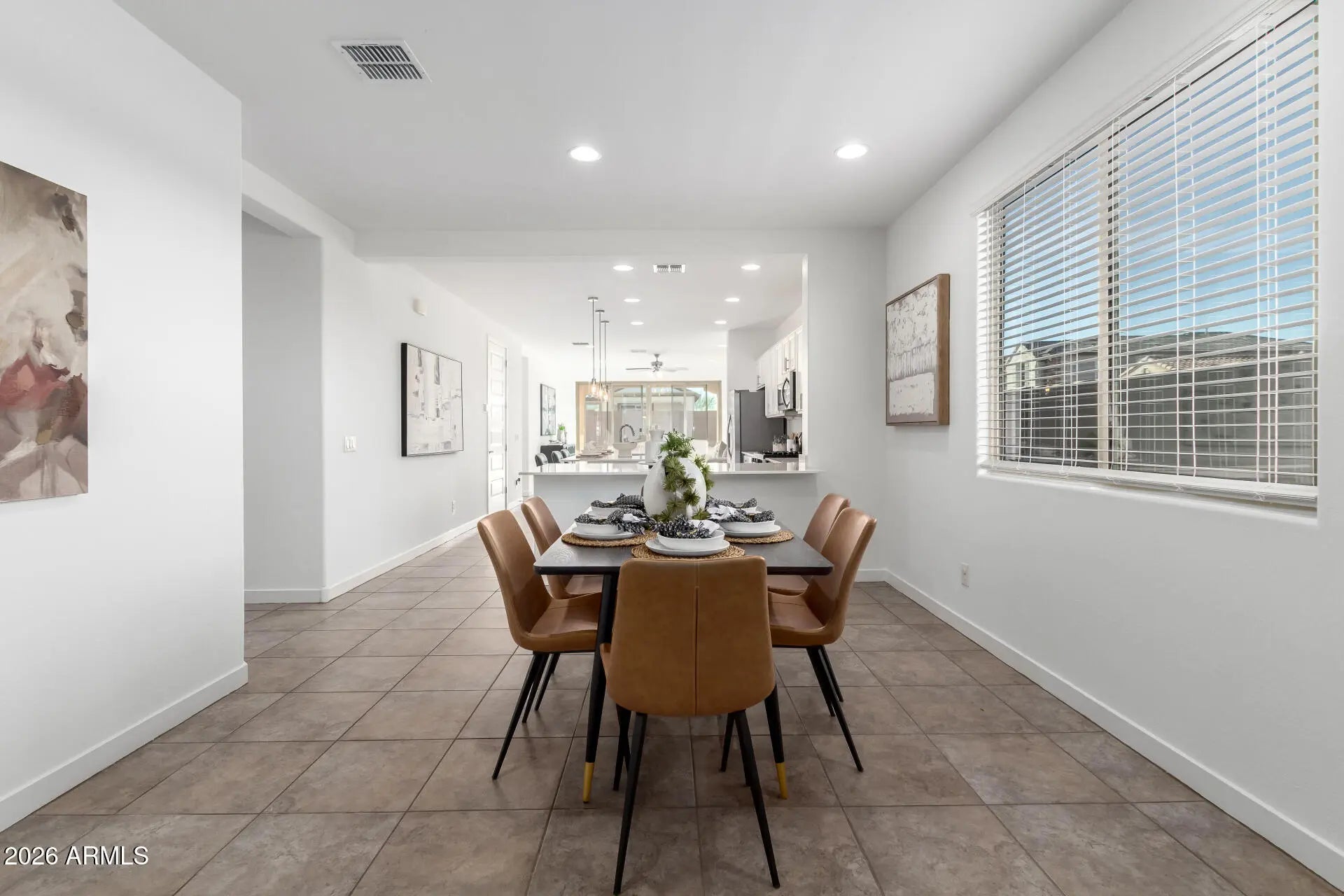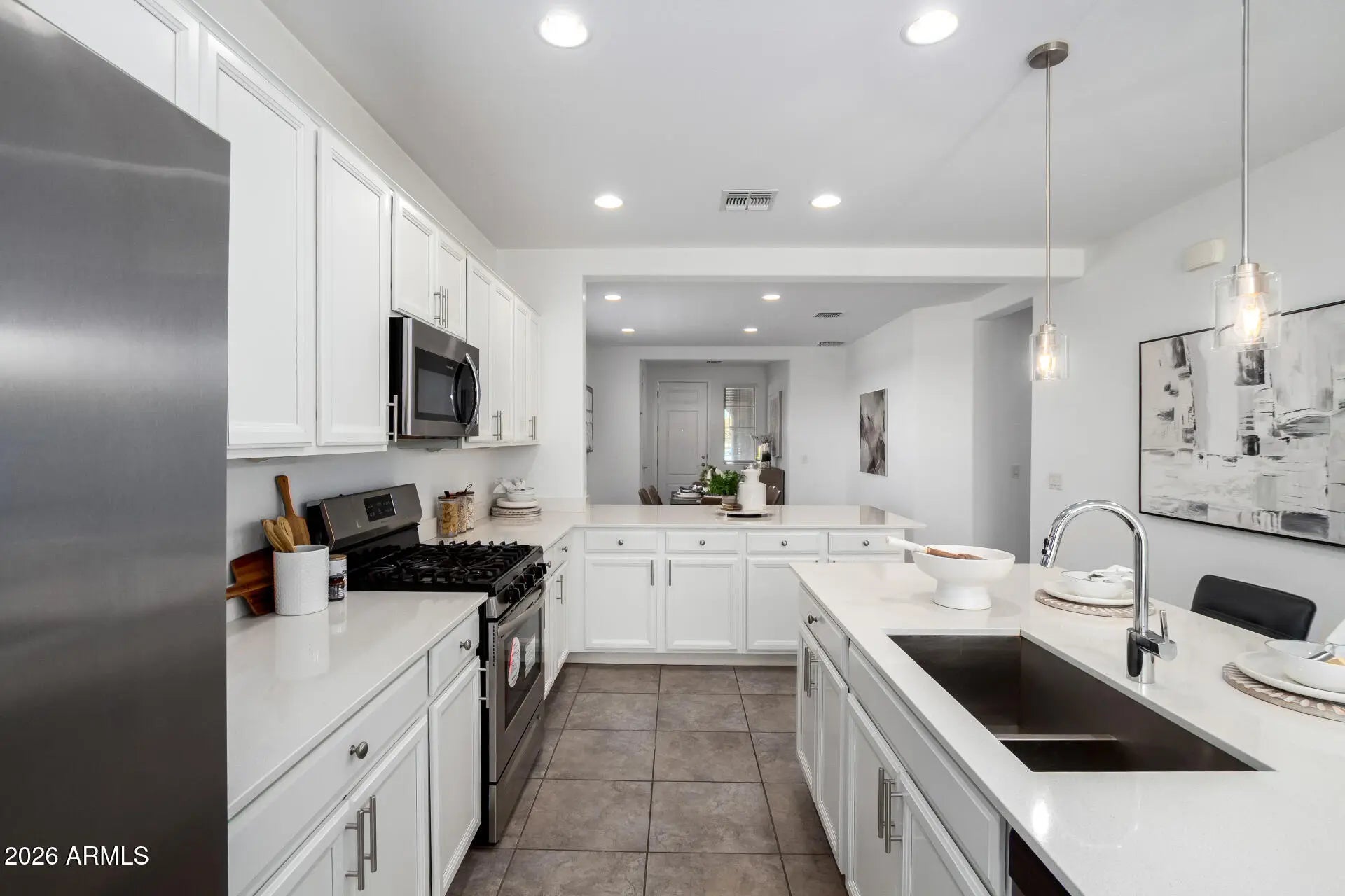 Seller offering up to 1% buyer credit toward closing costs or interest rate buydown with a full-price offer. Welcome to this well-maintained single-level home located in the gated Western Enclave community. Situated on a corner lot, the property features 3 bedrooms, 2 bathrooms, a 2-car garage, and mature landscaping. The interior offers abundant natural light, a neutral color palette, tile flooring in the main living areas, and carpeted bedrooms. The floor plan includes a formal living room and an open great room with sliding glass doors leading to the backyard. The kitchen is equipped with stainless steel appliances, quartz countertops, recessed and pendant lighting, white cabinetry, a pantry, and both an island and peninsula with breakfast bar seating. The primary suite includes an ensuite bathroom with dual sinks and a walk-in closet. The backyard is designed for low-maintenance outdoor living and features a covered patio and artificial turf. Conveniently located and move-in ready.