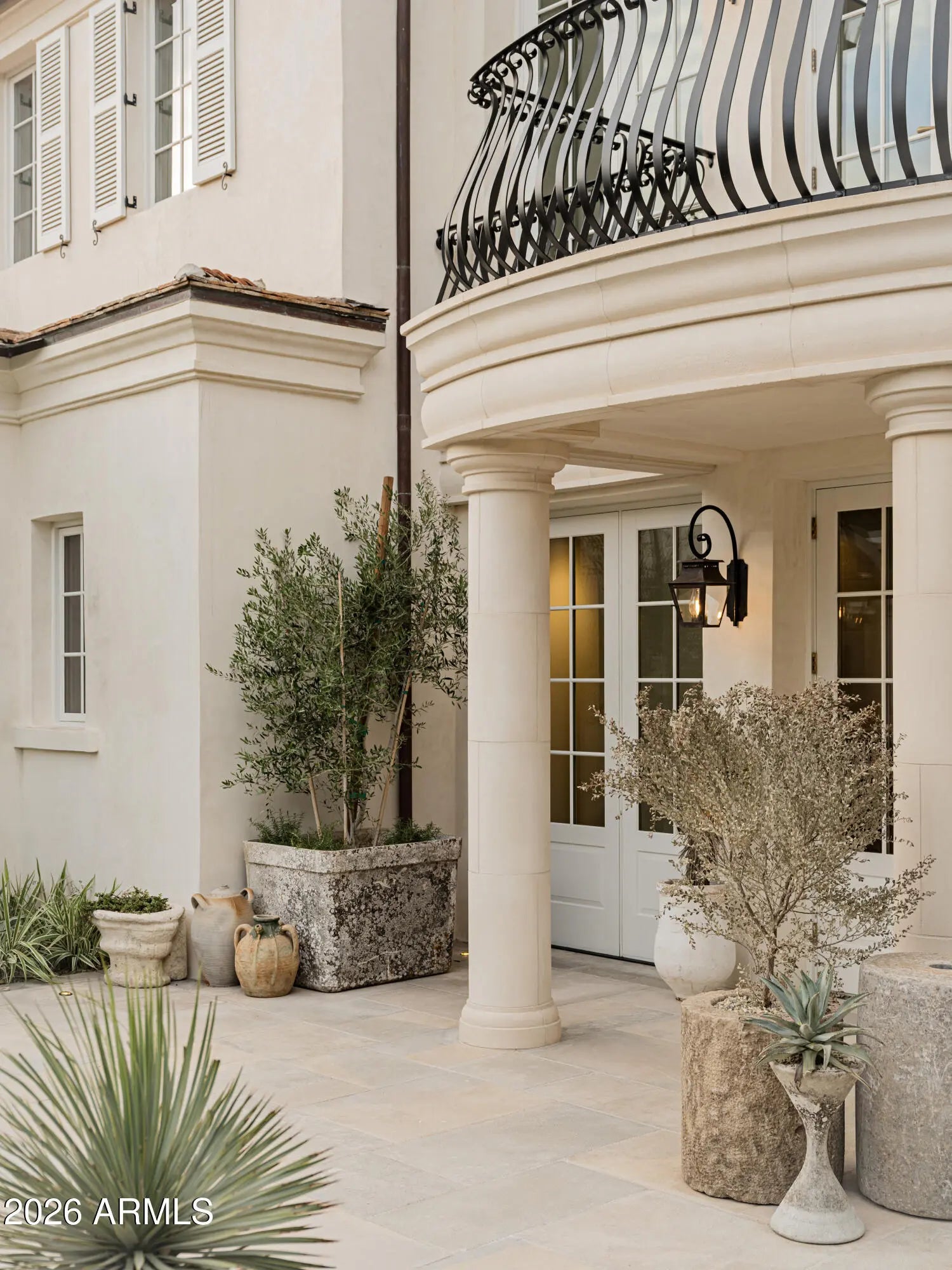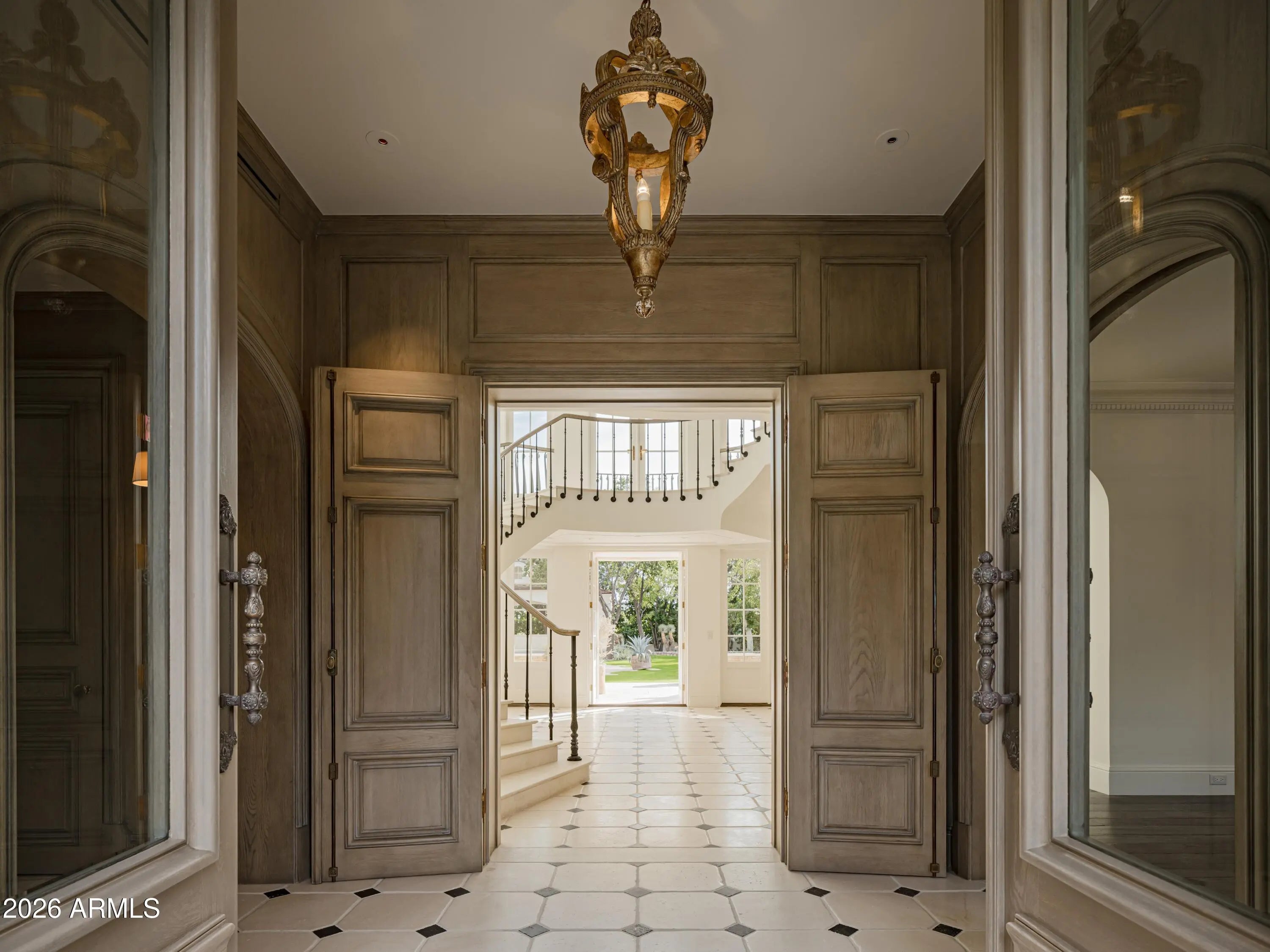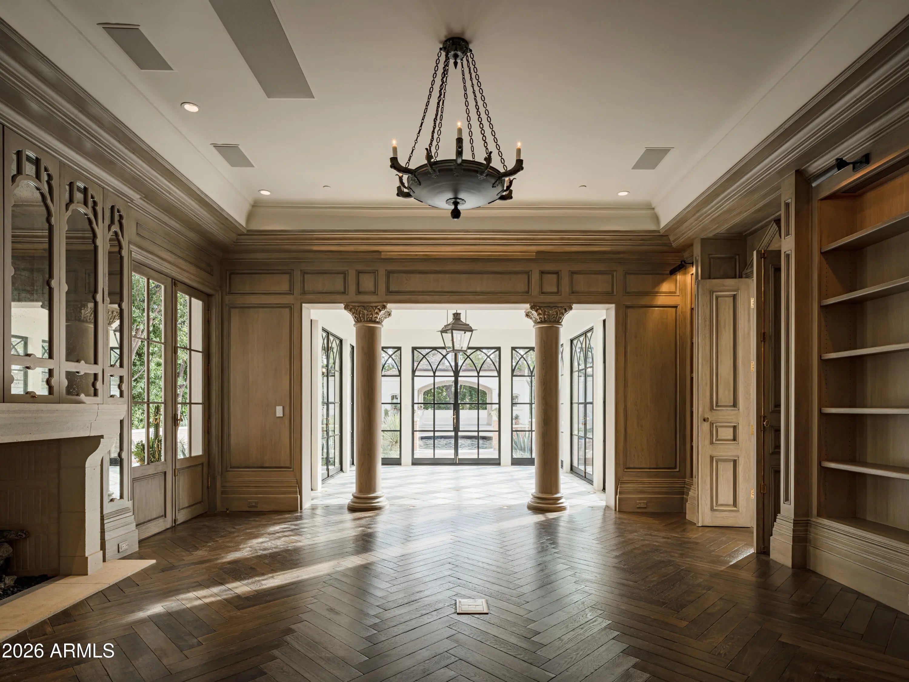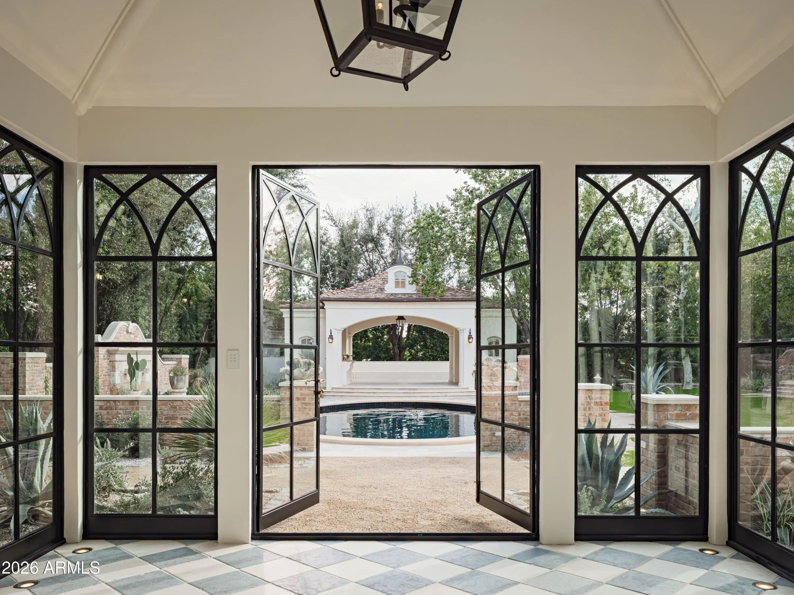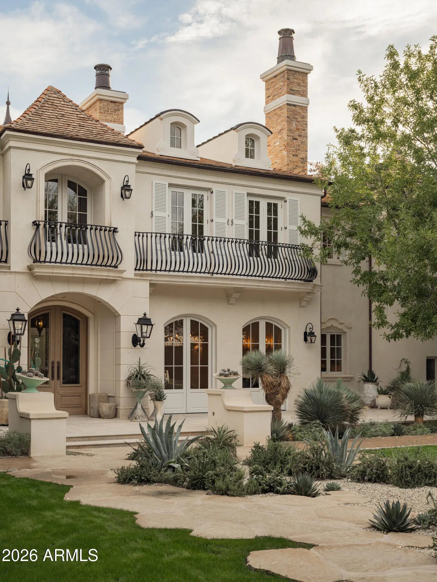 Behind tall private iron gates on the most coveted stretch of Exeter Boulevard, this extraordinary French-inspired Arcadia estate sits on nearly a full acre with commanding street presence, a dramatic fountain arrival, and rare north-south exposure—free of overhead power lines. Designed by architect Mark Candelaria and built by Nance Construction, the residence showcases authentic Old-World masonry construction and timeless European elegance paired with modern luxury. Interiors are defined by elegant archways, grand formal and informal living spaces, and a dramatic dual-foyer stair hall. Reclaimed wood beams, imported limestone and European oak floors, custom millwork, Niermann Weeks lighting, and carved limestone fireplaces with reclaimed firebrick reflect meticulous attention to detail. The chef's kitchen features a statement French range and professional-grade appliances, complemented by an adjacent catering pantry and full bar. Additional highlights include a library, glass conservatory, and climate-controlled wine cellar. Grand curved staircases or an elevator lead to the primary suite, a private retreat with sitting room and fireplace, view balconies, and a boutique-caliber dressing room. The spa-inspired primary bath offers a steam shower, dual water closets, and a fireplace beside a nickel-clad soaking tub. Three additional en-suite bedroomsone ideal as a gym with steam showeralong with an upstairs lounge or study and second laundry room complete the upper level. A detached guest casita provides full living quarters with kitchen, fireplace, bedroom suite, and balcony. Resort-style grounds feature multiple covered patios with fireplaces, a soaking pool with integrated fountains, a heated pool cabana with bar and bath, pickleball and bocce courts, and lush gardens accented by reclaimed brick, cobblestone, sandstone, gas lanterns, and water featuresevoking the ambiance of a European villa. A recent, comprehensive renovation includes new major systems, updated home automation, and extensive landscape enhancements. With temperature-controlled garage parking for up to ten vehicles, exceptional privacy, and uncompromising quality, this is a rare, legacy estate in one of Arcadia's most prestigious settings.