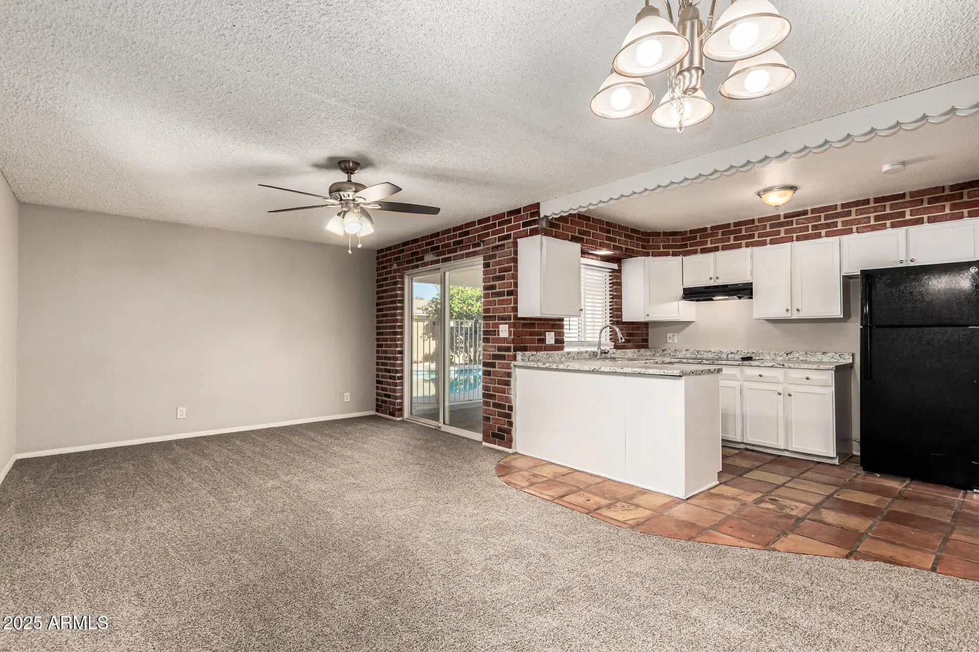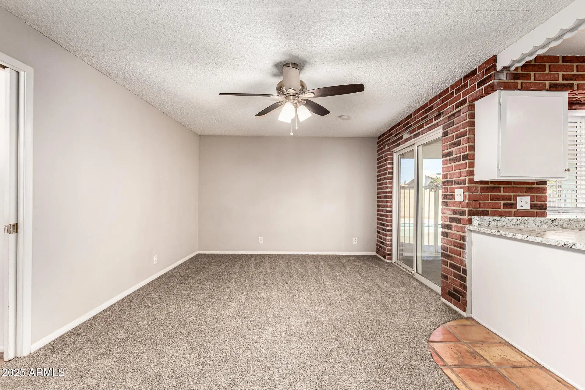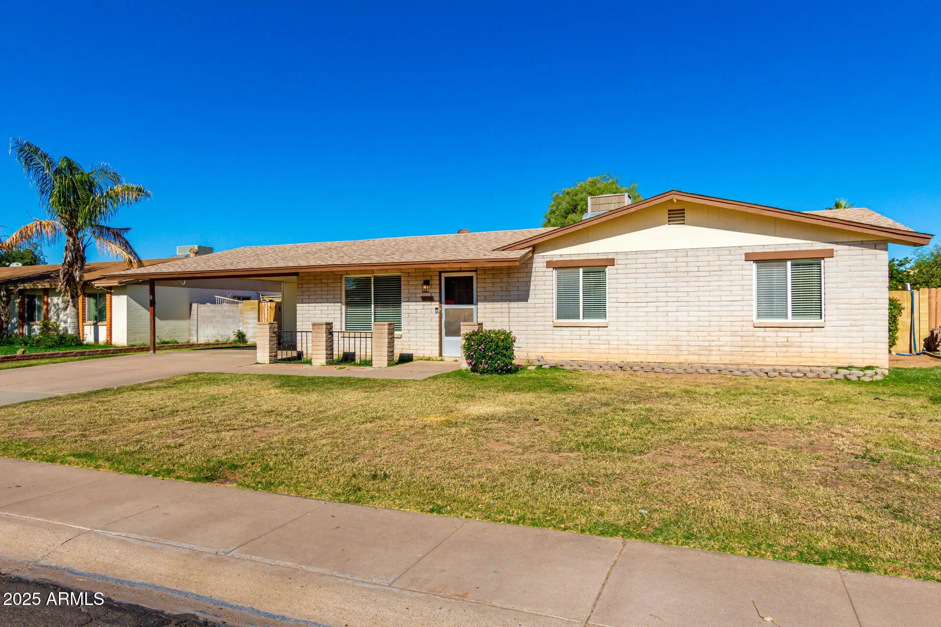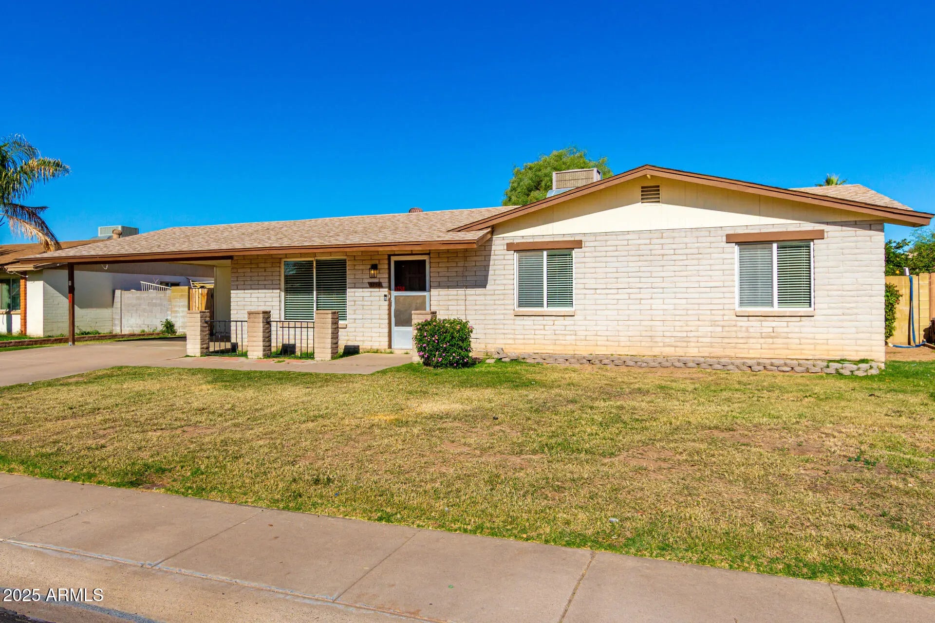 Become the proud owner of this charming 4-bedroom home with no HOA! You're welcomed by a serene living room with a soothing palette, blinds, and soft carpeting underfoot. Gather loved ones in the cozy great room, complete with striking brick accents and sliding door access to the backyard. The well-appointed kitchen comes with crisp white cabinets, Saltillo tile flooring, built-in appliances, and a peninsula with a breakfast bar. The main bedroom includes a private bathroom with dual sinks for an efficient daily routine. Spend enchanting evenings in the sizeable backyard, boasting a covered patio, convenient alley access, a manicured lawn, and a refreshing pool for cooling down on hot summer days. Don't miss out on this fantastic opportunity!