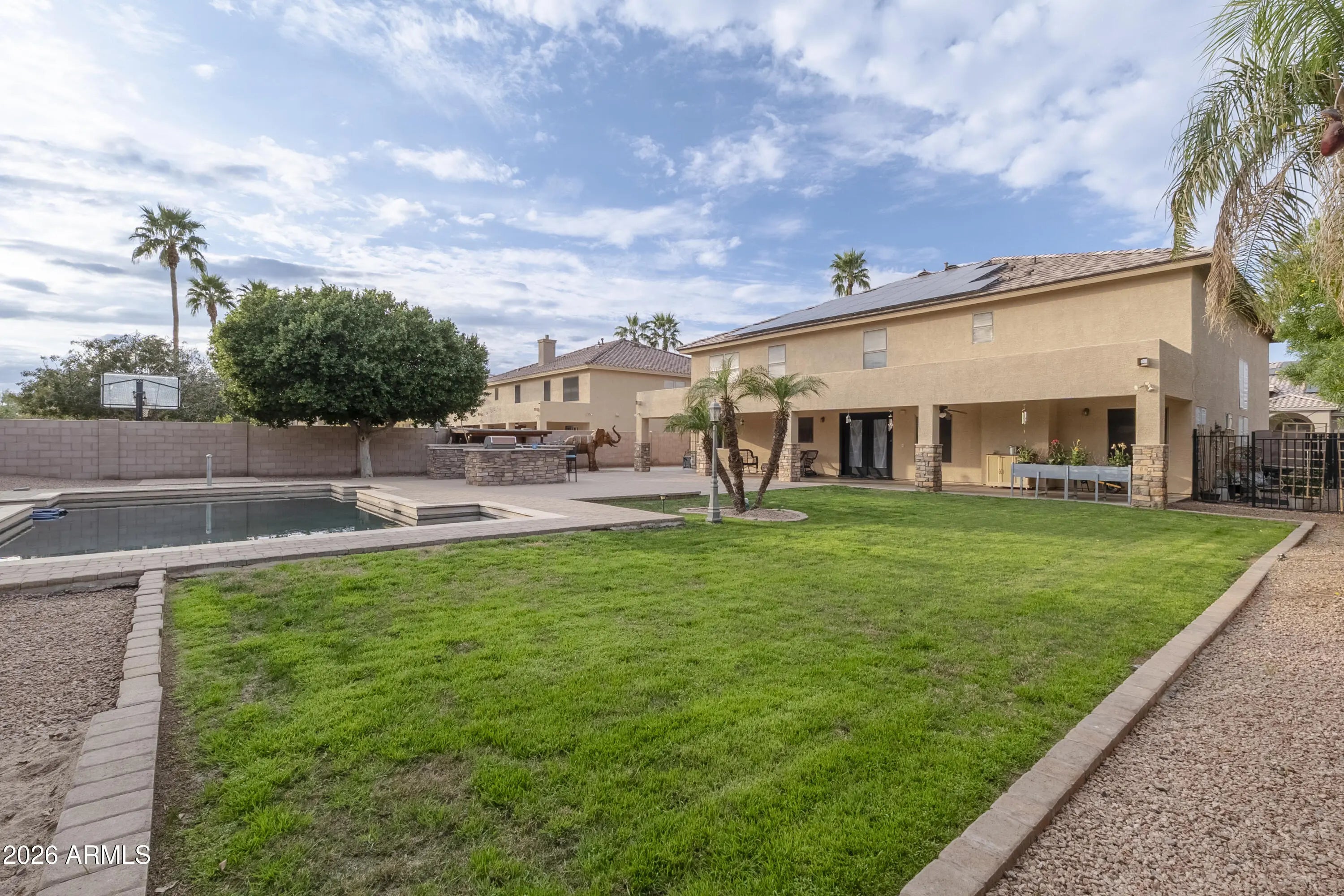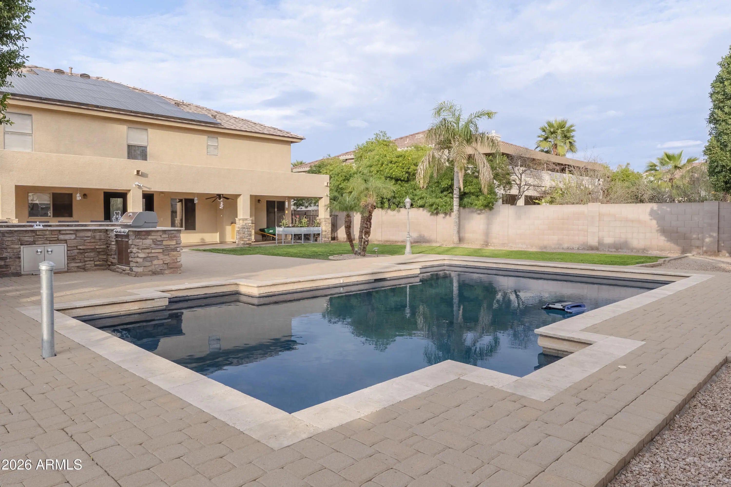 Located in the desirable Bel Fleur Gated Community, this stunning 4 bedroom, 3.5 bath home offers 4194 square feet of luxury living on an 11,060 square foot lot. Enjoy a resort-style backyard featuring a sparkling pool, BBQ island, and covered patio perfect for outdoor entertaining and movie nights. The upgraded kitchen provides abundant counter space and a large island ideal for cooking and gatherings. The main suite includes a private retreat, while a downstairs bedroom is perfect for guests or an office. Additional highlights include a 3-car garage, RV parking, side yards, and owned solar panels for energy efficiency.