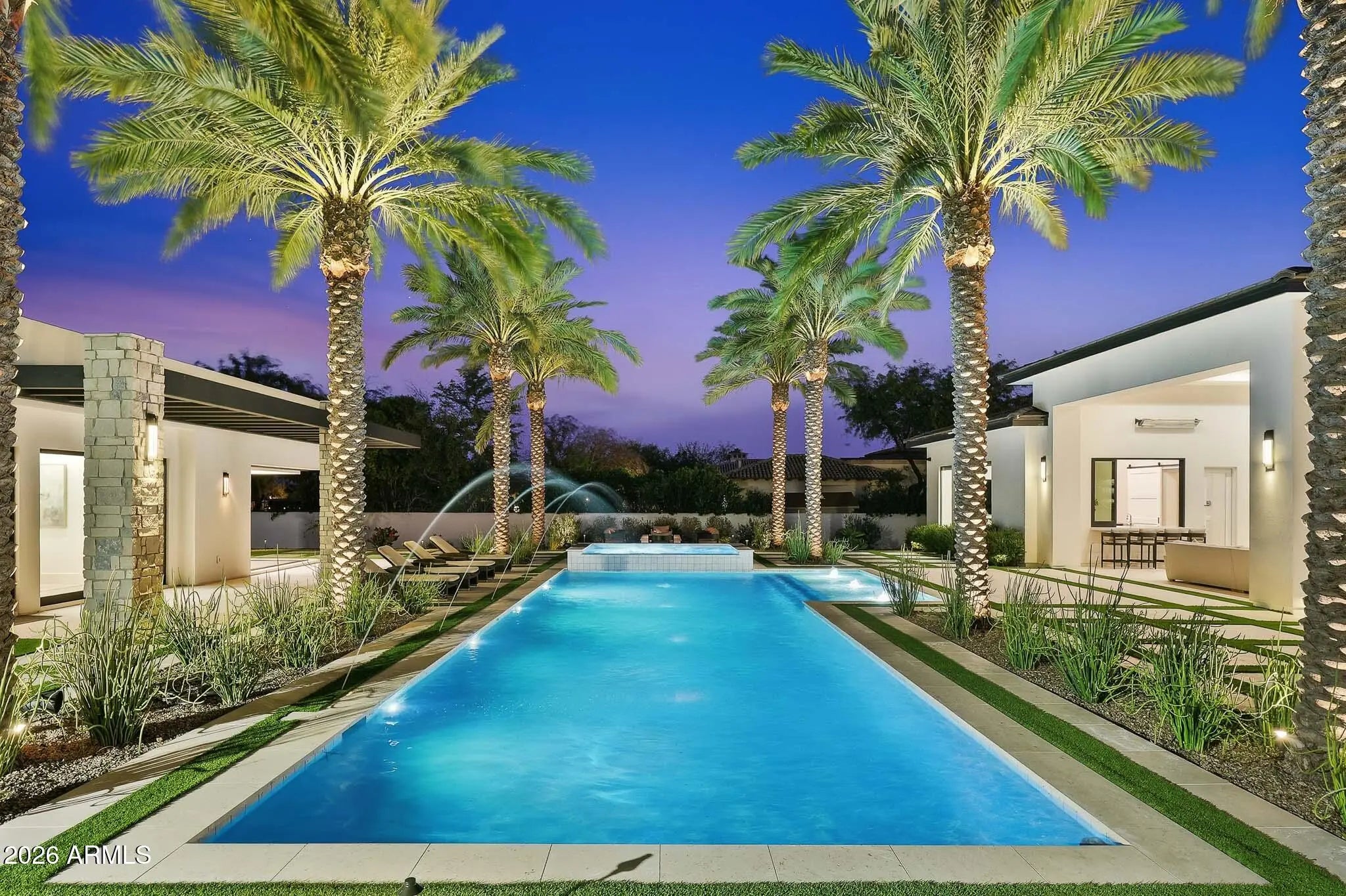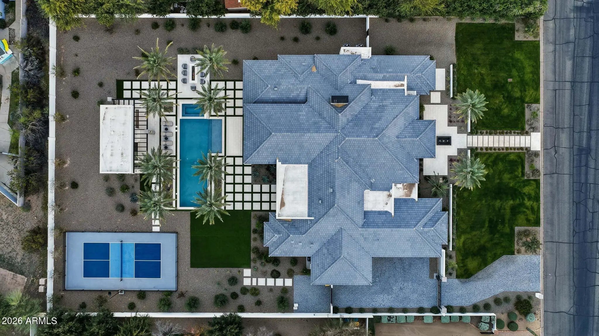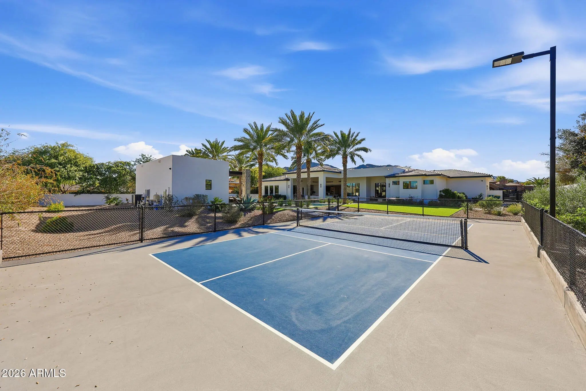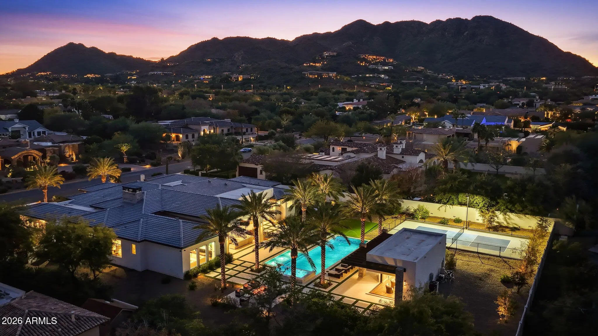 Premier Paradise Valley living with breathtaking Camelback Mountain views. This exceptional Forte Homes residence is ideally positioned in one of PV's most desirable locations and offers a rare blend of modern architecture, resort-style outdoor living, and elevated luxury finishes throughout. The main residence spans 6,509 sq ft and is complemented by a 575 sq ft detached guest house, creating a total of 6 bedrooms and 6.5 bathrooms. Designed with a desirable split floor plan, the home features an expansive great room with soaring ceilings and dramatic wood beam details in both the living and dining areas. Walls of glass seamlessly connect indoor and outdoor living spaces, perfect for entertaining. The chef's kitchen is equipped with Sub-Zero and Wolf appliances and opens to the great room, while additional interior highlights include a private office, formal dining room with a stunning climate-controlled wine room, and a versatile flex room with an indoor/outdoor bar. High-end wall coverings throughout, along with Rocky Mountain Hardware, Visual Comfort lighting, Control4 smart-home automation, Taj Mahal quartz throughout, and luxury engineered hardware at every turn. The resort-style backyard is a true showpiece, framed by rows of gorgeous, mature palm trees and designed for both relaxation and recreation. Outdoor amenities include a large heated pool and spa with water features, multiple covered patios, fire features, lush landscaping, and a full-size pickleball courtcreating a private oasis ideal for year-round enjoyment. The detached guest house offers full living accommodations, including a living area, kitchen, and bathroomperfect for guests, extended family, or a private retreat. Additional features include a gated driveway, four-car garage with 12' ceilings, premier neighborhood setting, and close proximity to top-rated schools. A rare opportunity to own a refined, move-in-ready luxury estate in the heart of Paradise Valley.